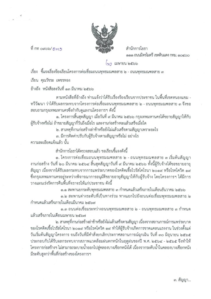 (1 พ.ค.66) นายวัชระ เพชรทอง อดีตส.ส. พรรคประชาธิปัตย์ เปิดเผยว่า ตามที่ตนได้ทำหนังสือร้องเรียนและสอบถามต่อสํานักการโยธา กทม. เรื่องโครงการต่อเชื่อมถนนพุทธมณฑลสาย 2 – 3 สิ้นสุดสัญญาไปตั้งแต่วันที่ 9 มี.ค. 66 ว่ากทม.ได้ขยายสัญญาให้ผู้รับจ้างหรือไม่ ถ้าขยายสัญญากี่วันถึงเมื่อไร และงานก่อสร้างจะแล้วเสร็จเมื่อใด