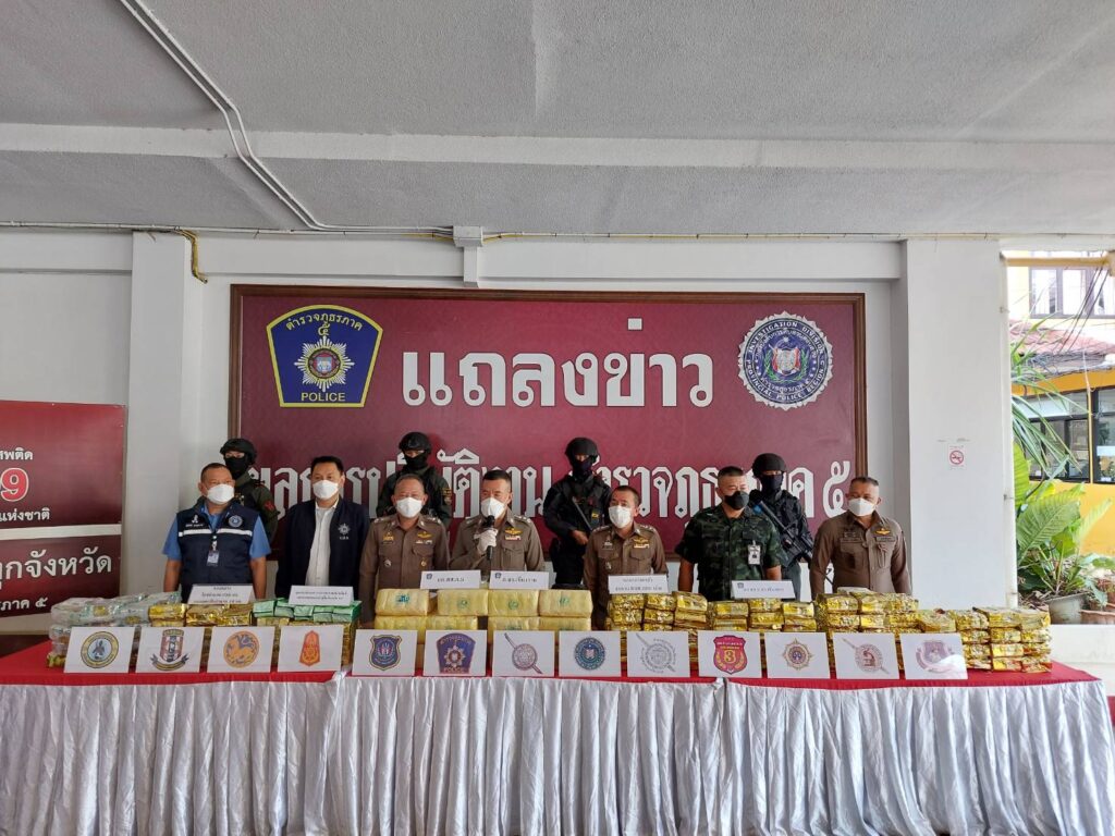 วันที่ 3 พฤษภาคม 2566 เวลา 10.00 น. ตำรวจภูธรภาค 5 โดย พล.ต.ท.ปิยะ ต๊ะวิชัย ผบช.ภ.5 ,พล.ต.ต.พฤทธิพงษ์ ประยูรศิริ รอง ผบช.ภ.5 ,พ.อ.ยอดชาย พวงวรินทร์ รอง เสธ.ศอ.ปส.ชน. ,นายดนุชา ไชยวงค์ ปปส.ภาค 5, พ.ต.อ.รุ่งศักดิ์ แสงเสียงฟ้า รอง ผบก.ภ.จว.เชียงราย ,พ.ต.อ.พิทักษ์ นาสมวาส รอง ผบก.สส.ภ.5 ได้ร่วมกันแถลงผลการจับกุมยาเสพติดรายสำคัญจำนวน 2 คดี ซึ่งเป็นผลการจับกุมบูรณาการร่วมกันของ บก.สส.ภ.5 ,กก.สส.ภ.จว.เชียงราย , สภ.แม่สรวย และ สภ.เมืองเชียงราย จว.เชียงราย โดยสามารถจับกุมผู้กระทำความผิดรวม 4 คน ตรวจยึดยาบ้ารวมกว่า 6 แสนเม็ด ยาไอซ์ 239 กก. รถยนต์จำนวน 3 คัน ดังนี้