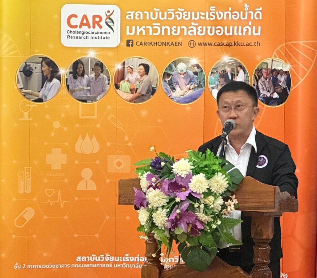 ดร.วิภารัตน์ ดีอ่อง ผู้อำนวยการสำนักงานการวิจัยแห่งชาติ (ผอ.วช.) ได้มอบหมายให้นายเอนก บำรุงกิจ รองผู้อำนวยการสำนักงานการวิจัยแห่งชาติ เข้าร่วมกิจกรรมตรวจคัดกรองพยาธิใบไม้ตับและมะเร็งท่อน้ำดีด้วยอัลตราซาวด์ พร้อมทั้งกล่าวถึงการสนับสนุนการดำเนินงานเพื่อการแก้ไขปัญหาโรคพยาธิใบไม้ตับและมะเร็งท่อน้ำดีของสำนักงานการวิจัยแห่งชาติ โดยมีนายนิติพัฒน์ ลีลาเลิศแล้ว รองผู้ว่าจังหวัดอุดรธานี เป็นประธานกล่าวเปิดงาน พร้อมด้วย ดร.ดนุช ตันเทอดทิตย์ เลขานุการรัฐมนตรีว่าการกระทรวงการอุดมศึกษา วิทยาศาสตร์ วิจัยและนวัตกรรม,ดร.ธนดร พุทธรักษ์ นายกเทศมนตรีนครอุดรธานี,นายสุทธินันท์ บุญมี ประธานคณะกรรมการเขตสุขภาพเพื่อประชาชน เขตพื้นที่ 7,นายณรงค์ พลละเอียด ประธานคณะกรรมการเขตสุขภาพเพื่อประชาชน เขตพื้นที่ 8,นายศักดา เกตุแก้ว รองนายกองค์การบริหารส่วนจังหวัดอุดรธานี,นายแพทย์เมธิพจน์ ชาตะเมธีกุล ผู้อำนวยการกองการแพทย์ เทศบาลนครอุดรธานี,นายแพทย์เรืองศิลป์ เถื่อนนาดี ประธานมูลนิธิมะเร็งท่อน้ำดี,รองศาสตราจารย์ ดร.วัชรินทร์ ลอยลม รักษาการแทนผู้อำนวยการสถาบันวิจัยมะเร็งท่อน้ำดี พร้อมทั้งภาคีเครือข่ายภาคประชาชน แขกผู้มีเกียรติ และสื่อมวลชน ร่วมเป็นเกียรติในกิจกรรมดังกล่าว
