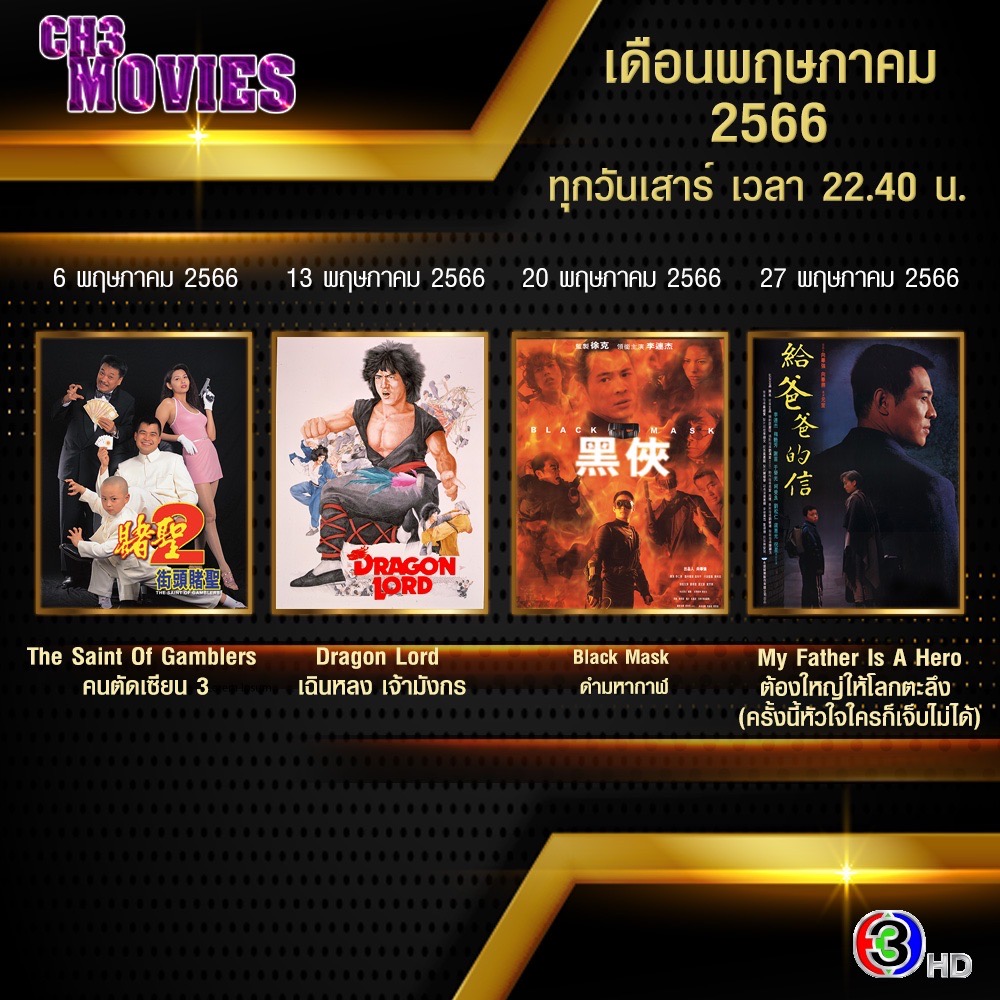 สำหรับซีรีส์เกาหลี รับชม “สัมผัสรักซ่อนวิญญาณ” (Master’s Sun) เรื่องราวจากความพิเศษของนางเอก แทกงชิล “กงฮโยจิน” ที่เกิดขึ้นหลังจากประสบอุบัติเหตุทำให้กลายเป็นคนมองเห็นวิญญาณ ต่อมาเมื่อได้มาพบกับ จูจุงวอน “โซจีซบ” เจ้าของห้างสรรพสินค้ายักษ์ใหญ่ใจกลางเมือง และค้นพบว่าเมื่ออยู่ใกล้ ๆ เขา เธอจะไม่เห็นวิญญาณ ดังนั้นทั้งสองจึงได้ทำข้อตกลงที่จะช่วยเหลือกัน โดย จูจุงวอน ขอให้ แทกงชิล ช่วยสืบหาความจริงในอดีตและเหตุการณ์ที่ทำให้แฟนสาวของเขาเสียชีวิต ต่อมาด้วยความใกล้ชิด จึงส่งผลให้ความสัมพันธ์เริ่มพัฒนาก่อเกิดความรู้สึกดี ๆ ขึ้น ติดตามวันจันทร์-ศุกร์ เวลา 02.50 น. และวันเสาร์ – อาทิตย์ เวลา 02.40 น. เริ่ม 15 พฤษภาคม 2566 และปิดสุดท้ายกับภาพยนตร์เรื่องยาว มอบความบันเทิงวันหยุดทุกคืนวันเสาร์กับช่วง “แชนแนล ทรี มูฟวี่ส์” เวลา 23.40-01.40 น. เดือนนี้มีมาให้รับชมกันถึง 4 เรื่อง เริ่มจาก วันเสาร์ที่ 6 พฤษภาคม 2566 เรื่อง The Saint Of Gamblers: คนตัดเซียน 3 นำแสดงโดย อู๋ม่งต๊ะ, ซิวซู่จิน, เอริค คอด, ดอนนี่ เยน วันเสาร์ที่ 13 พฤษภาคม 2566 เรื่อง Dragon Lord: เฉินหลง เจ้ามังกรนำแสดงโดย เฉินหลง, ซิดนีย์ ยิม วันเสาร์ที่ 20 พฤษภาคม 2566 เรื่อง Black Mask: ดำมหากาฬ นำแสดงโดย เจ็ทลี, หลิวชิงหวิน, ม่อเหยินเว่ย และ วันเสาร์ที่ 27 พฤษภาคม 2566 เรื่อง My Father Is A Hero: ต้องใหญ่ให้โลกตะลึง (ครั้งนี้หัวใจใครก็เจ็บไม่ได้) นำแสดงโดย เจ็ทลี, เหมยยั่นฟาง, เหมาเจ๋อตง