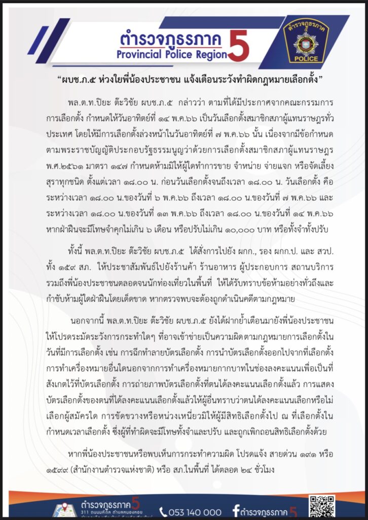 นอกจากนี้ พล.ต.ท.ปิยะ ต๊ะวิชัย ผบช.ภ.5 ยังได้ฝากย้ำเตือนมายังพี่น้องประชาชนให้โปรดระมัดระวังการกระทำใดๆ ที่อาจเข้าข่ายเป็นความผิดตามกฎหมายการเลือกตั้งในวันที่มีการเลือกตั้ง เช่น การฉีกทำลายบัตรเลือกตั้ง การนำบัตรเลือกตั้งออกไปจากที่เลือกตั้ง การทำเครื่องหมายอื่นใดนอกจากการทำเครื่องหมายกากบาทในช่องลงคะแนนเพื่อเป็นที่สังเกตไว้ที่บัตรเลือกตั้ง การถ่ายภาพบัตรเลือกตั้งที่ตนได้ลงคะแนนเลือกตั้งแล้ว การแสดงบัตรเลือกตั้งของตนที่ได้ลงคะแนนเลือกตั้งแล้วให้ผู้อื่นทราบว่าตนได้ลงคะแนนเลือกหรือไม่เลือกผู้สมัครใด การขัดขวางหรือหน่วงเหนี่ยวมิให้ผู้มีสิทธิเลือกตั้งไป ณ ที่เลือกตั้งในกำหนดเวลาเลือกตั้ง ซึ่งผู้ที่ทำผิดจะมีโทษทั้งจำและปรับ และถูกเพิกถอนสิทธิเลือกตั้งด้วย