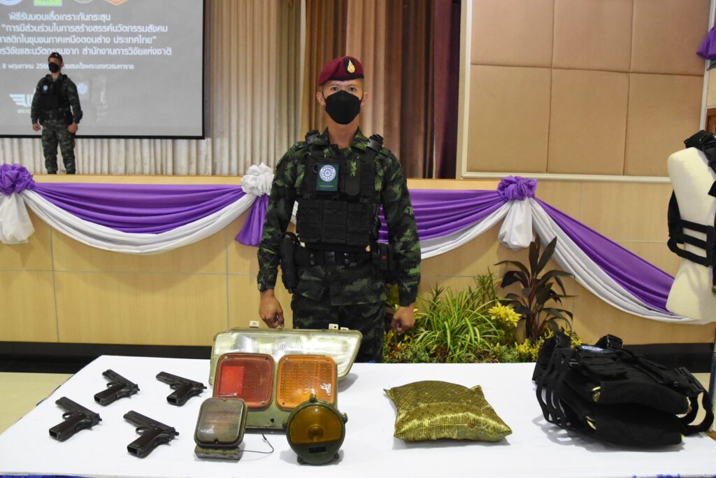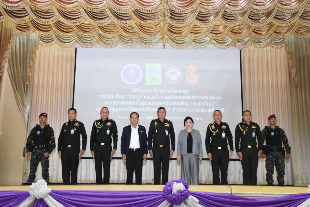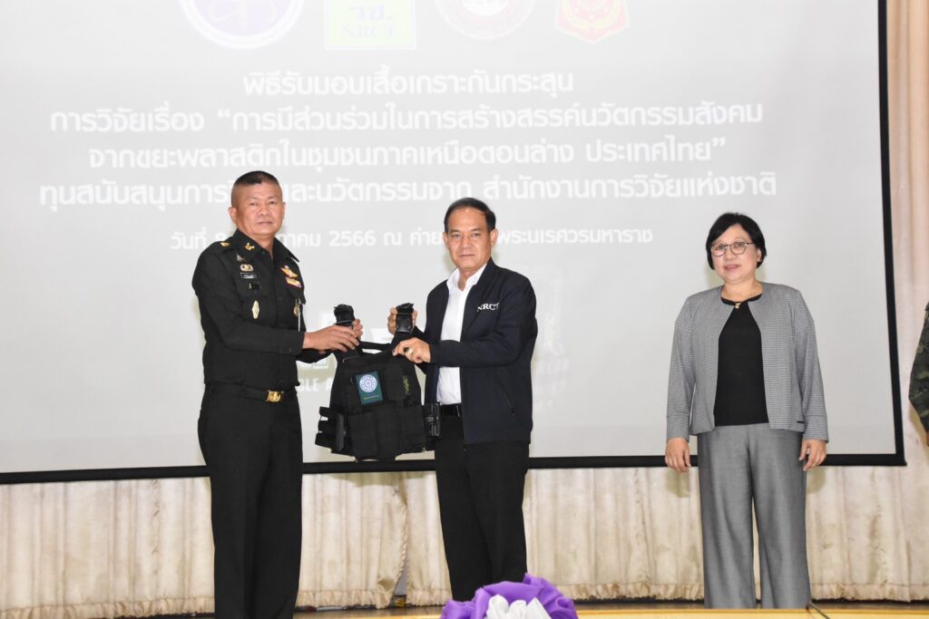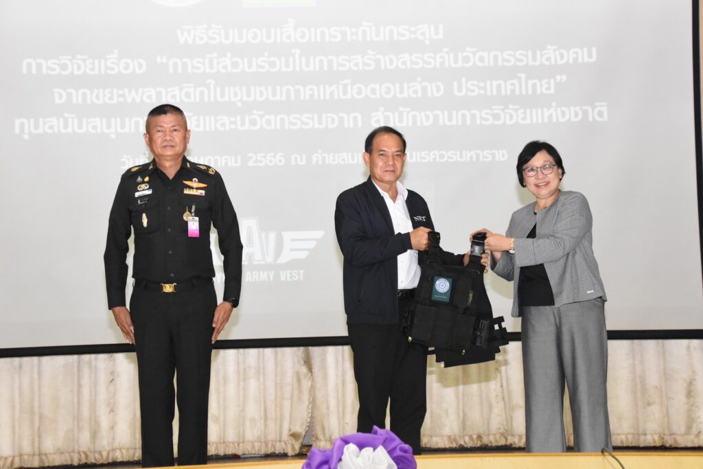 วันที่ 8 พฤษภาคม 2566 สำนักงานการวิจัยแห่งชาติ (วช.) กระทรวงการอุดมศึกษา วิทยาศาสตร์ วิจัยและนวัตกรรม (อว.) ร่วมกับ กองทัพภาคที่ 3 และ มหาวิทยาลัยนเรศวร จัดพิธีส่งมอบนวัตกรรมเสื้อเกราะกันกระสุนจากขยะพลาสติก ซึ่งเป็นผลงานภายใต้โครงการวิจัยเรื่อง “การมีส่วนร่วมในการสร้างสรรค์นวัตกรรมสังคมจากขยะพลาสติกในชุมชนภาคเหนือตอนล่าง ประเทศไทย” ที่ (วช.) ให้ทุนสนับสนุนแก่ รองศาสตราจารย์ ดร.พนิดา จงสุขสมสกุล แห่งคณะบริหารธุรกิจ เศรษฐศาสตร์และการสื่อสาร มหาวิทยาลัยนเรศวร ดำเนินโครงการฯ โดย ดร.วิภารัตน์ ดีอ่อง ผู้อำนวยการสำนักงานการวิจัยแห่งชาติ (ผอ.วช.) ได้มอบหมายให้ นายเอนก บำรุงกิจ รองผู้อำนวยการสำนักงานการวิจัยแห่งชาติ เป็นผู้ส่งมอบนวัตกรรมดังกล่าว แก่กองทัพภาคที่ 3 โดยมี พลตรี ประสาน แสงศิริรักษ์ รองแม่ทัพภาคที่ 3 เป็นผู้รับมอบ พร้อมนี้ ศาสตราจารย์ ดร.กรกนก อิงคนินันท์ รองอธิการบดีฝ่ายพัฒนางานวิจัยและนวัตกรรม มหาวิทยาลัยนเรศวร พร้อมด้วยคณะนักวิจัย ให้การต้อนรับ ณ สโมสรบันเทิงทัพ ค่ายสมเด็จพระนเรศวรมหาราช จังหวัดพิษณุโลก