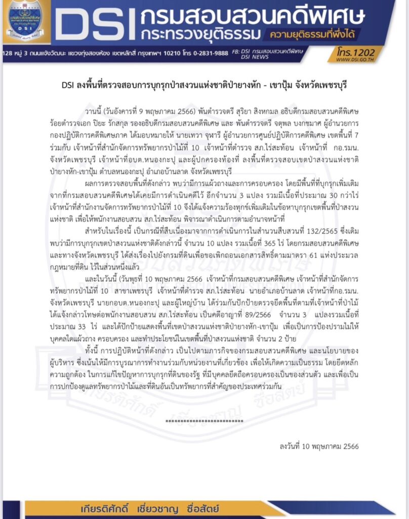 เมื่อวันอังคารที่ 9 พฤษภาคม 2566 : พันตำรวจตรี สุริยา สิงหกมล อธิบดีกรมสอบสวนคดีพิเศษ ร้อยตำรวจเอก ปิยะ รักสกุล รองอธิบดีกรมสอบสวนคดีพิเศษ และ พันตำรวจตรี จตุพล บงกชมาศ ผู้อำนวยการกองปฏิบัติการคดีพิเศษภาค ได้มอบหมายให้ นายเทวา จุฬารี ผู้อำนวยการศูนย์ปฏิบัติการคดีพิเศษ เขตพื้นที่ 7 ร่วมกับ เจ้าหน้าที่สำนักจัดการทรัพยากรป่าไม้ที่ 10, เจ้าหน้าที่ตำรวจ สภ.ไร่สะท้อน,เจ้าหน้าที่ กอ.รมน.จังหวัดเพชรบุรี,เจ้าหน้าที่อบต.หนองกะปุ และผู้ปกครองท้องที่ ลงพื้นที่ตรวจสอบเขตป่าสงวนแห่งชาติ