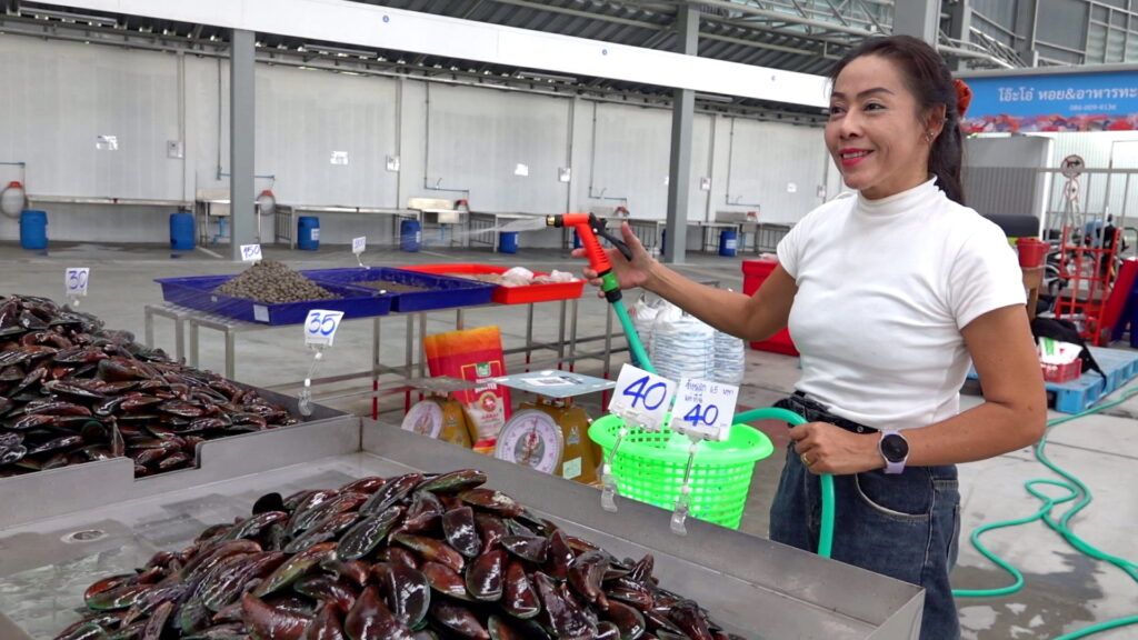 นางกัญยาณี ปานขาว ร้านโอ๊ะโอ๋หอยและอาหารทะเลแปรรูป กล่าวว่า ร้านของเราขายหอยสด รับมาจากบ่อผู้เลี้ยงหอย จ.สมุทรสาคร หอยอ้วนและสะอาดสดใหม่ ราคาถูกกว่าที่อื่น หอยไซด์นี้โดยที่อื่นส่วนใหญ่ขายที่ 60-65 บาท แต่ของเราขายที่ 40 บาท สังเกตว่าที่ร้านหอยยังมีชีวิตโดยจะอ้างปากและแลบลิ้นแสดงว่าสดจริง ฝากประชาชนทั่วไปเข้ามาอุดหนุนได้หอยเราสดใหม่ทุกวัน