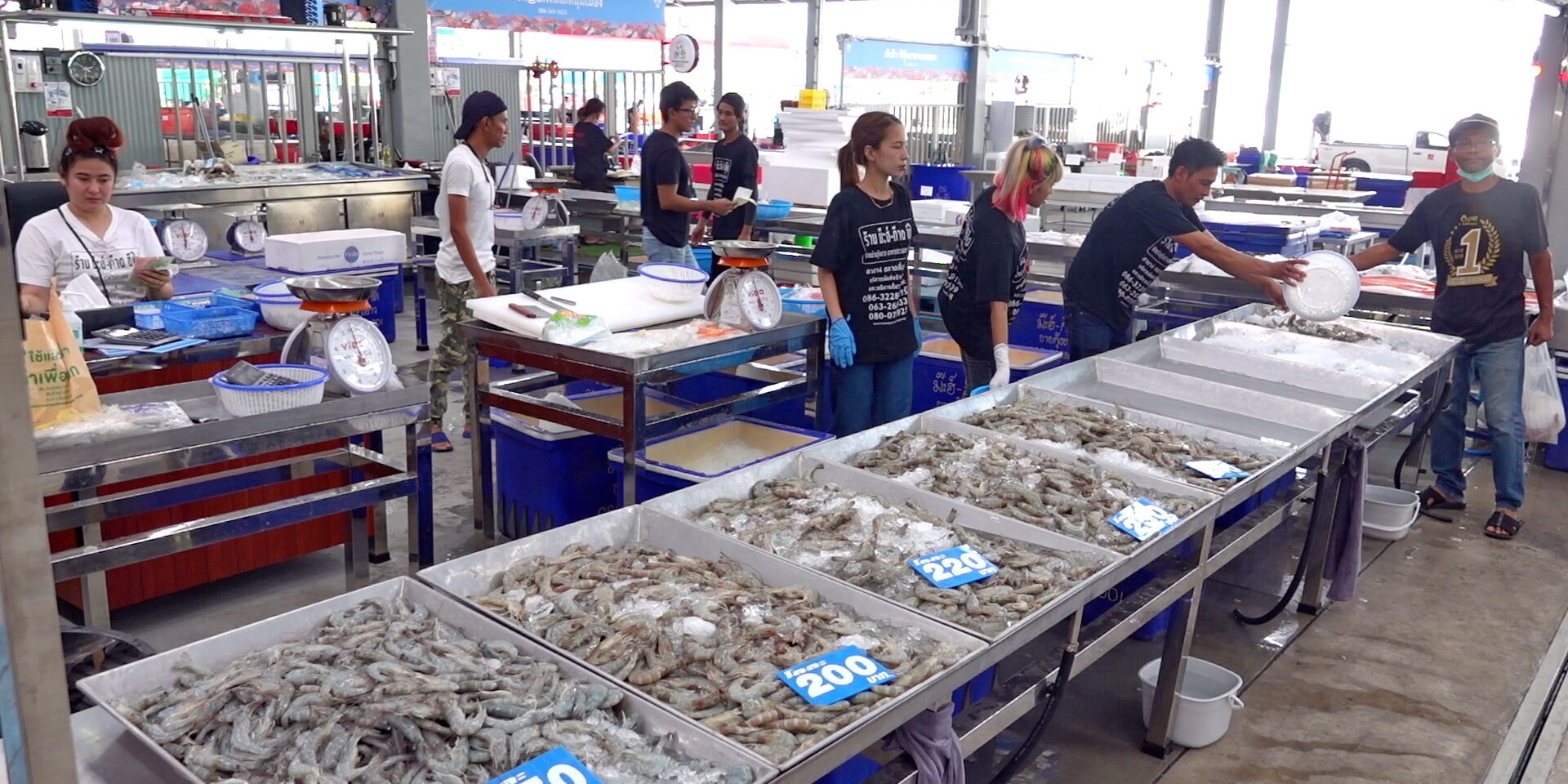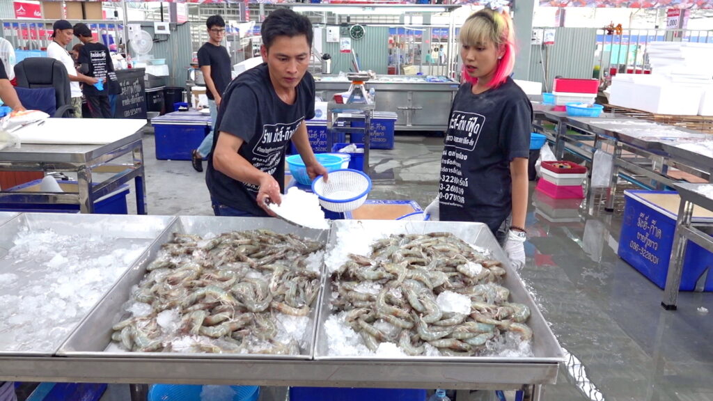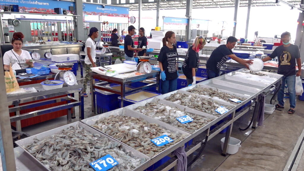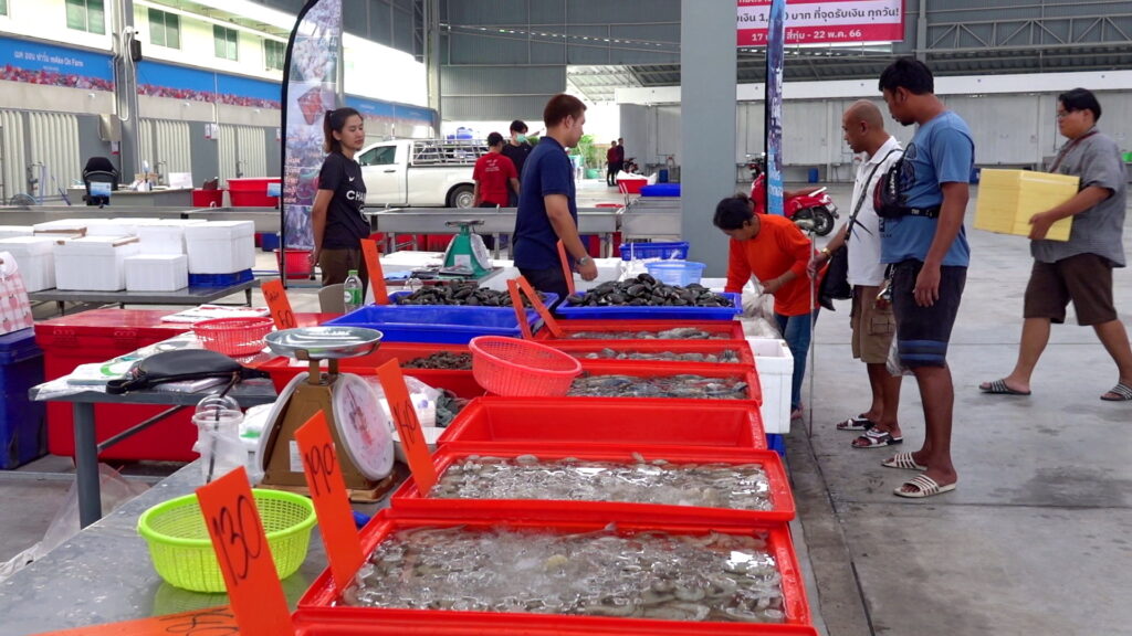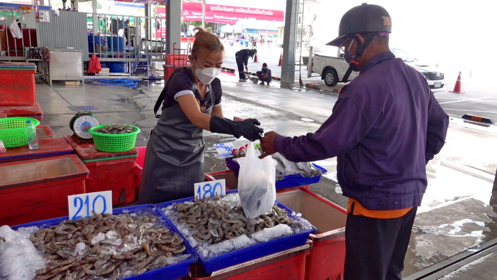 นางวันเพ็ญ เต๋าทอง ร้านแพเล็กมังกร กล่าวว่า ร้านเราขายกุ้งคุณภาพ โดยมีกุ้งมาวันต่อวันมีกุ้งทุกขนาดทุกไซด์ ราคาไม่แพง ราคากันเอง หากลูกค้าสนใจไซด์ไหนเรายังสามารถรดราคาได้อีก กุ้งที่ร้านมาจากหลายแห่ง มาจากมหาชัย แปดริ้ว ฉะเชิงเทรา ร้านเรามีประสบการณ์ขายสินค้าอาหารทะเลมานานกว่า 20 ปีแล้ว เมื่อทราบว่าที่ตลาดสี่มุมมเองเปิดโซลขายอาหารทะเลจึงเข้ามาร่วมขายอาหารทะเลที่นี่ จึงฝากชวนประชาชนทั่วไปเข้ามาซื้อหาอาหารทะเลสด ๆ ได้ที่สี่มุมเมือง