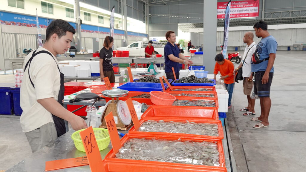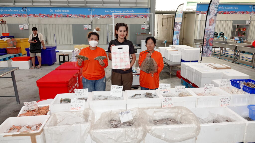 นส.ชนันภัทร คงสมุทร ร้านปูแคร๊บตรัง กล่าวว่า ร้านเรามีโปรซื้อสินค้าแลวแถมกะปิทุกออเดอร์ เป็นผลิตภัณฑ์ของชาวบ้าน จ.ตรังที่แพเราเอง สินค้าภายในร้านมาจากแพเราเอง โดยปลาหมึก กุ้ง หอย ขึ้นเราในตอนเช้า แล้วแพ็คส่งในเวลาเย็นมาถึงตลาดสี่มุมเมืองในเวลาเช้าทุกวันจะเป็นแบบนี้ สินค้ามีคุรภาพรับประกันความสดใหม่ทุกวัน ไม่มีการแช่น้ำและไม่แช่สารอันตรายปลอดภัย 100% ร้านเราอุดหนุนชาวบ้านที่ออกทะเลด้วยเรือขนาดเล็ก เป็นการช่วยเหลือชาวบ้านชาวทะเลโดยตรง ลูกค้ามาซื้อที่ร้านเราเหมือนกับซื้อราคาส่งที่ใกล้ทะเล เหมือนเราไปซื้อที่ทะเล จ.ตรัง และยังได้สนับสนุนประมงท้องถิ่นอีกด้วย นอกจากนี้ที่ร้านยังมีโปรโมชั่นขายกล่องสุ่มอาหารทะเล ราคา 499 , 999 , 1,999 บาท โดยมีจำนวนจำกัดที่ตลาดสี่มุมมเองเท่านั้นเลย