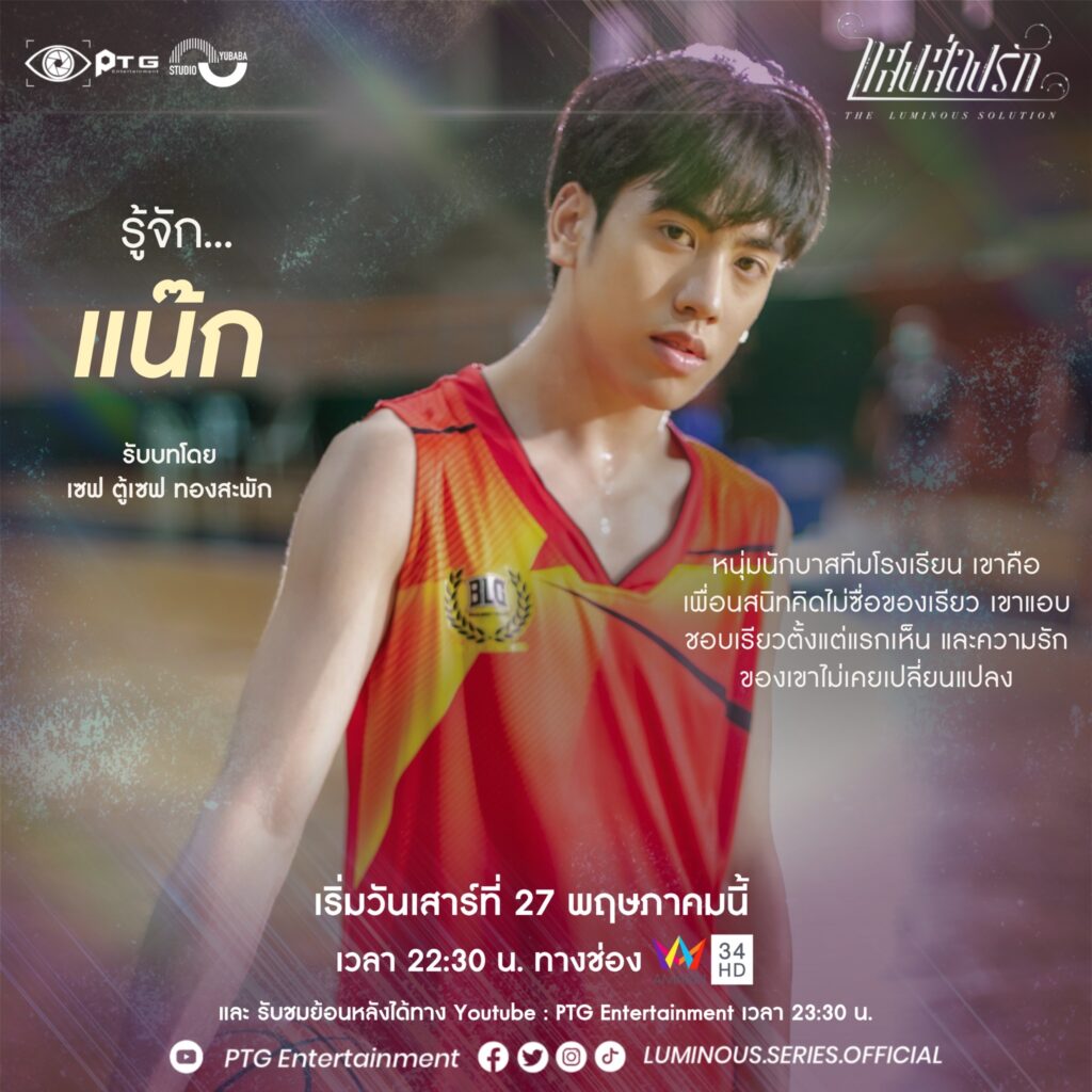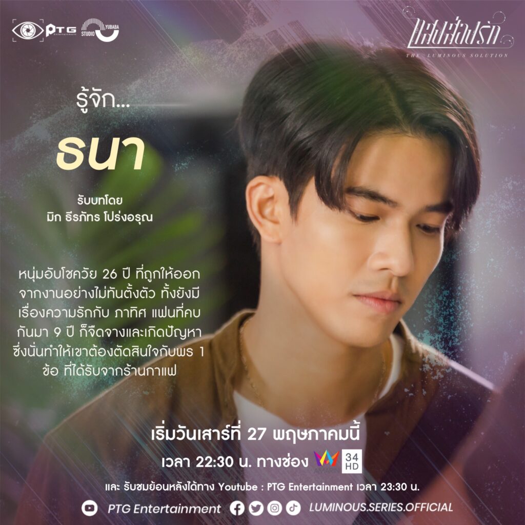ไปพิสูจน์ความสามารถด้านการแสดงของพวกเขาและเธอได้ที่ซีรีส์ “แสงส่องรัก – Series the Luminous Solution” ออกอากาศทุกวันเสาร์ เวลา 22.30 น. ทางอมรินทร์ทีวี เอชดี ช่อง 34 เริ่มวันเสาร์ที่ 27 พฤษภาคม 2566 เสนอเป็นตอนแรก และอัปเดตทุกความเคลื่อนไหวและรับชมย้อนหลังได้ที่ Youtube : PTG Entertainment เวลา 23.30 น.https://youtube.com/@ptg_entertainment Facebook & Twitter & IG & Tiktok : @Luminous.series.official @ptgentertainment.th