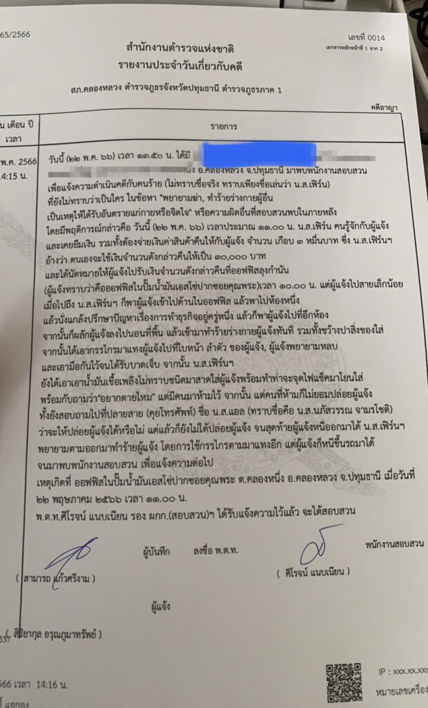 เมื่อวันที่ 22 พ.ค.66 น.ส.บิ๊ก นามสมุติ อายุ 35 ปี มาพบ พ.ต.ท.ศิโรจน์ แนบเนียน รอง ผกก.(สอบสวน) สภ.คลองหลวง เพื่อแจ้งความดำเนินคดีกับคนร้าย (ไม่ทราบชื่อจริง ทราบเพียงชื่อเล่นว่า น.ส.เฟิร์น) ที่ยังไม่ทราบว่าเป็นใคร ในข้อหา “พยายามฆ่า, ทำร้ายร่างกายผู้อื่นเป็นเหตุให้ได้รับอันตรายแก่กายหรือจิตใจ” หรือความผิดอื่นที่สอบสวนพบในภายหลัง
