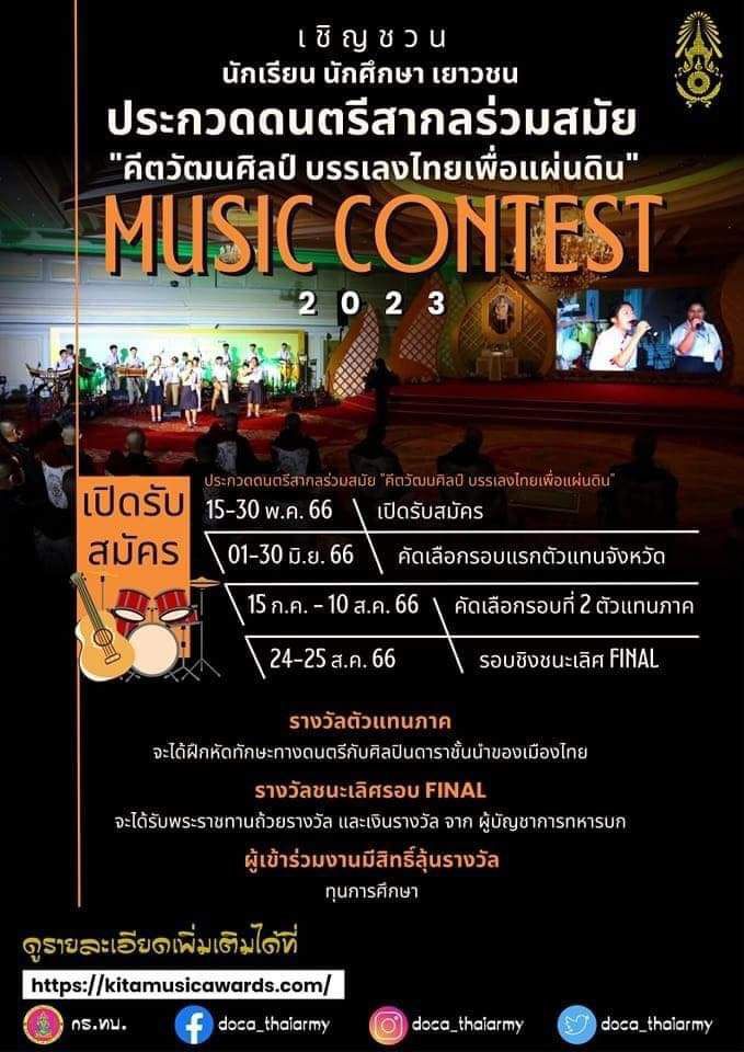 สำหรับการ ประกวดวงดนตรีสากลร่วมสมัย ระดับมัธยมศึกษา ในโครงการ “KITA คีตวัฒนศิลป์ Music Contest” ชิงถ้วยพระราชทานพระบาทสมเด็จพระเจ้าอยู่หัว ดำเนินการเปิดรับสมัครตั้งแต่วันที่ 15 พ.ค. – 30 พ.ค. 66 โดยวันที่ 1-30 มิ.ย. 66 คัดเลือกรอบแรกตัวแทนจังหวัด วันที่ 15 ก.ค. – 10 ส.ค. 66 คัดเลือกรอบที่ 2 ตัวแทนภาค และ 24-25 ส.ค. 66 รอบชิงชนะเลิศ รางวัลตัวแทนภาคจะได้ฝึกหัดทักษะทางดนตรีกับศิลปินดาราชั้นนำของเมืองไทย รางวัลชนะเลิศรอบ FINAL จะได้รับพระราชทานถ้วยรางวัล และเงินรางวัล จาก ผู้บัญชาการทหารบก ซึ่งผู้เข้าร่วมงานมีสิทธิ์ลุ้นรางวัลทุนการศึกษา สำหรับผู้สนใจสามารถดูรายละเอียดเพิ่มเติมได้ที่ http://kitamusicawards.com/