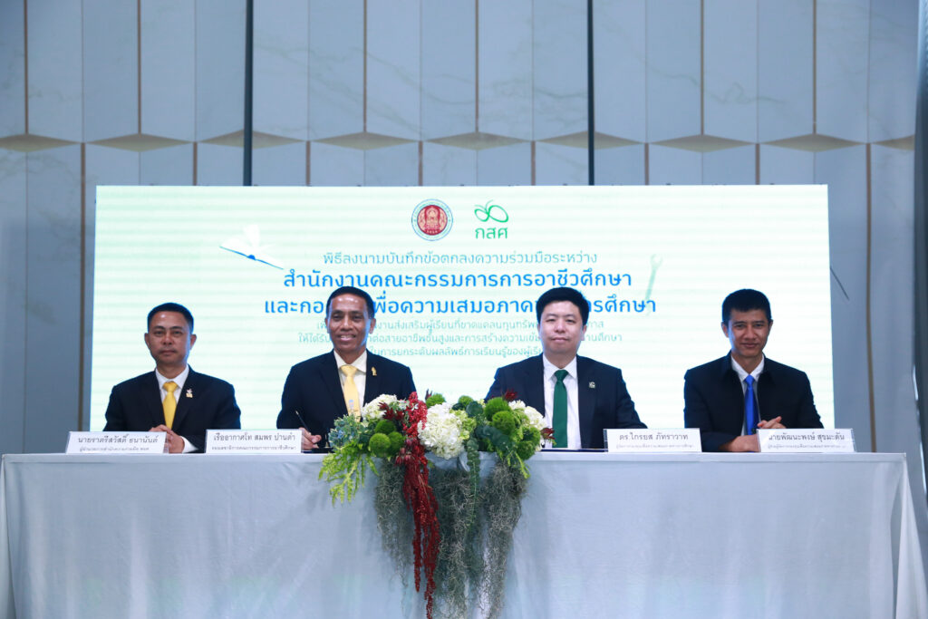 วันที่ 22 พฤษภาคม 2566 : เรืออากาศโท สมพร ปานดำ รองเลขาธิการคณะกรรมการการอาชีวศึกษา พร้อมด้วย ดร.ไกรยส ภัทราวาท ผู้จัดการกองทุนเพื่อความเสมอภาคทางการศึกษา ลงนามบันทึกข้อตกลงความร่วมมือ “เพื่อการดำเนินงานส่งเสริมผู้เรียนที่ขาดแคลนทุนทรัพย์หรือด้อยโอกาสให้ได้รับการศึกษาต่อสายอาชีพชั้นสูง และสร้างความเข้มแข็งสถานศึกษาในการยกระดับผลลัพธ์การเรียนรู้ของผู้เรียน” ณ โรงแรม เดอะ ควอเตอร์ อารีย์ กรุงเทพฯ