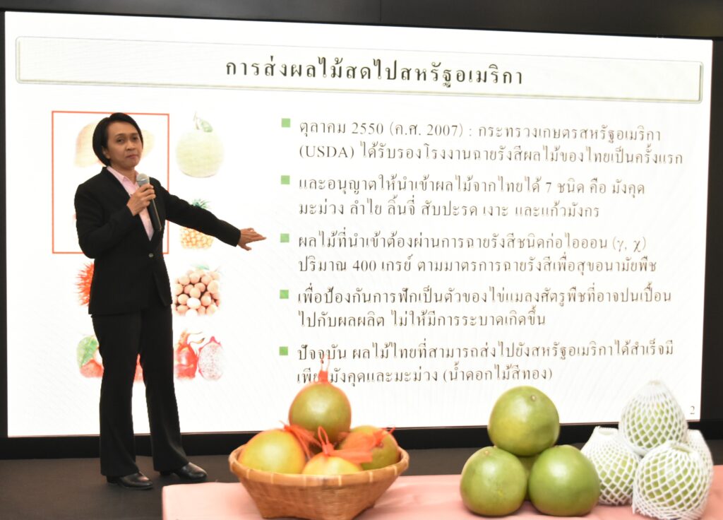 รศ.ดร.พีระศักดิ์ ฉายประสาท นักวิจัยจากมหาวิทยาลัยนเรศวร และ ดร.สุวิมล เจตะวัฒนะ นักวิจัยจาก (สทน.) เปิดเผยว่า นับตั้งแต่ปี พ.ศ.2550 สหรัฐอเมริกาได้อนุญาตให้นำเข้าผลไม้สด (fresh fruit) ของไทย 7 ชนิด ได้แก่ มะม่วง ลำไย มังคุด ลิ้นจี่ เงาะ แก้วมังกร และสับปะรด โดยจะต้องได้รับการฉายรังสีก่อนการส่งออก อันเป็นมาตรการป้องกันไม่ให้ไข่แมลงศัตรูพืชที่อาจติดไปฟักเป็นตัวและเกิดการแพร่กระจายของแมลงในประเทศปลายทาง นับเป็นการเปิดตลาดผลไม้ไทยที่สร้างความภาคภูมิใจให้แก่ประเทศชาติ และในปัจจุบันทางสหรัฐอเมริกาได้ออกกฎระเบียบเพิ่มเติมให้ไทยสามารถส่งออกส้มโอผลสดได้ตั้งแต่วันที่ 10 พฤศจิกายน 2564 จึงเกิดเป็นโจทย์วิจัยที่ท้าทายและรอคำตอบจากนักวิจัยไทยเป็นอย่างยิ่ง ปัจจุบันคณะผู้วิจัยได้ดำเนินการวัดการกระจายของรังสีดูดกลืนในบรรจุภัณฑ์ ให้สอดคล้องกับกฎระเบียบข้อกำหนดของทางสหรัฐอเมริกาไปแล้วและประสบความสำเร็จเป็นอย่างดี ส้มโอผลสดที่ผ่านการฉายรังสียังคงมีคุณภาพดี รสชาติและอายุการเก็บรักษาไม่แตกต่างจากส้มโอที่ไม่ผ่านการฉายรังสี การทำ dose mapping ทำให้ผู้ประกอบการไทยจะสามารถส่งออกส้มโอผลสดได้ตามมาตรฐานที่กำหนด และคณะผู้วิจัยมีโครงการจะนำส้มโอฉายรังสีไปจัดแสดงในงาน Natural Products Expo East 2023 ณ เมืองฟิลาเดลเฟีย รัฐเพนซิลเวเนีย ประเทศสหรัฐอเมริกา ในระหว่างวันที่ 20-23 กันยายน พ.ศ.2566 ที่จะถึงนี้ด้วย
