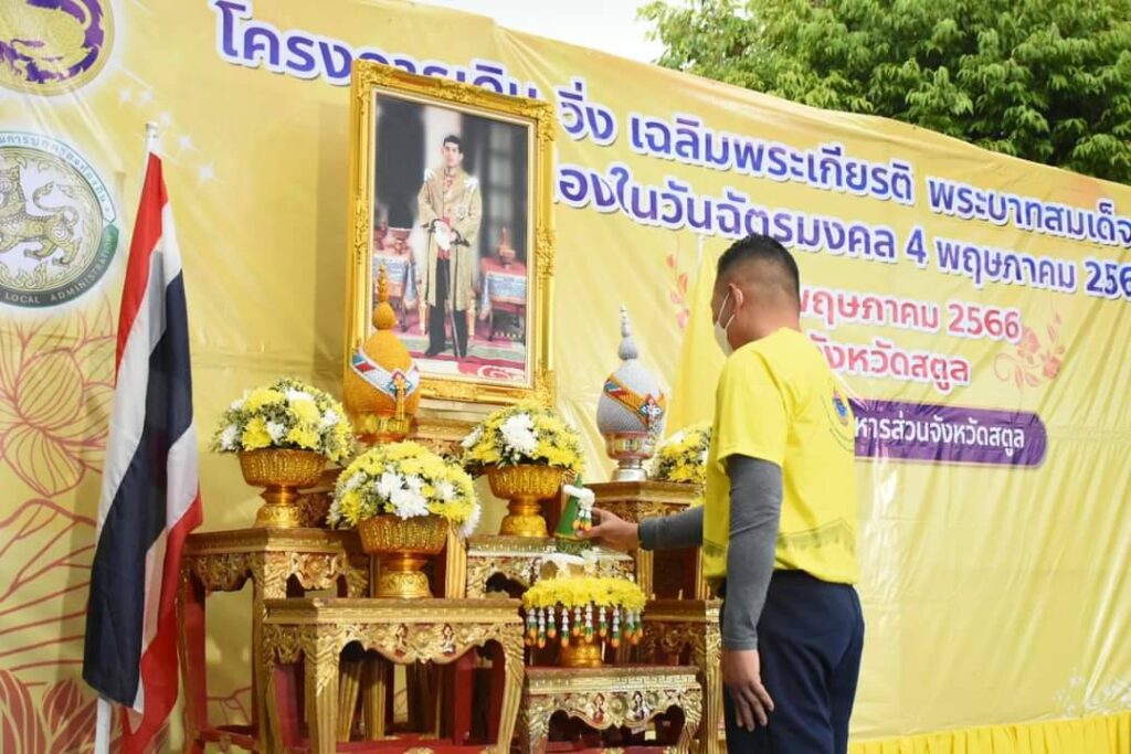 สำหรับการจัดโครงการเดิน – วิ่ง เฉลิมพระเกียรติพระบาทสมเด็จพระเจ้าอยู่หัวฯ เนื่องในวันฉัตรมงคล 4 พฤษภาคม 2566 เป็นการแสดงออกถึงความสำนึกในพระมหากรุณาธิคุณพระบาทสมเด็จพระเจ้าอยู่หัว รวมทั้งเพื่อจัดหารายได้จากการดำเนินการนำไปเป็นทุนช่วยเหลือเด็กและเยาวชน และประชาชนให้มีคุณภาพชีวิตที่ดีขึ้นสามารถพึ่งพาตนเองได้ โดยมีการวิ่งประเภท FUN RUN ระยะทาง 4 กิโลเมตร เริ่มออกสตาร์ทจากสนามกีฬาองค์การบริหารส่วนจังหวัดสตูล ไปยังสามแยกสำนักงาน กศน.จังหวัดสตูล เลี้ยวขวาวิ่งผ่านกองร้อยตำรวจตระเวนชายแดนที่ 436 ผ่านสำนักงานขนส่งจังหวัดสตูล โดยกลับตัวที่บริเวณหน้าวัดพิทักษ์คลองขุด และวิ่งกลับตามเส้นทางเดิม กลับไปยังสนามกีฬาองค์การบริหารส่วนจังหวัดสตูล มีผู้ร่วมกิจกรรมจำนวน 555 คน เงินบริจาคคนละ 500 บาทรวมเป็นเงิน 277,500 บาท โดยรายได้ทั้งหมดสมทบทุนมูลนิธิร่วมจิตน้อมเกล้าฯ เพื่อเยาวชน ในพระบรมราชินูปถัมภ์และมูลนิธิชัยพัฒนา โดยไม่หักค่าใช้จ่าย