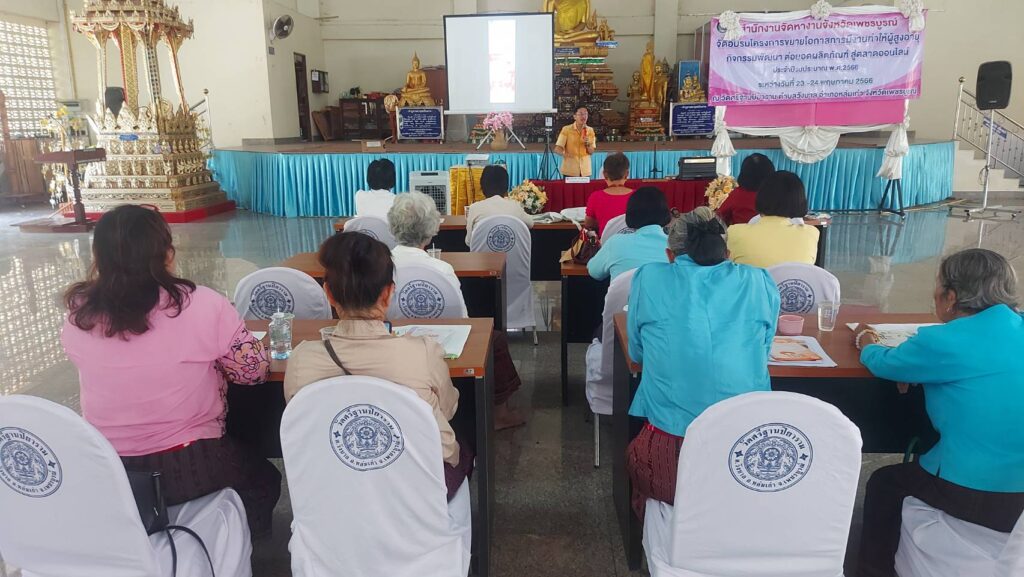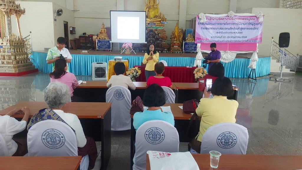 สำหรับโครงการขยายโอกาสการมีงานทำให้ผู้สูงอายุ กิจกรรมพัฒนา ต่อยอดผลิตภัณฑ์ สู่ตลาดออนไลน์ จัดขึ้นระหว่าง วันที่ 23-24 พฤษภาคม 2566 ที่วัดศรีฐานปิยารามวังบาล ตำบลวังบาล อำเภอหล่มเก่า จังหวัดเพชรบูรณ์ มีวัตถุประสงค์เพื่อส่งเสริมให้ผู้สูงอายุได้ประกอบอาชีพ/มีงานทำ มีรายได้ มีทักษะในการดำรงชีวิต มีการเรียนรู้และการพัฒนาตลอดชีวิต เป็นการเพิ่มคุณค่าและศักยภาพในการประกอบอาชีพให้ผู้สูงอายุ ซึ่งจะนำไปสู่การลดการพึ่งพิง ลดภาระการเลี้ยงดูของครอบครัวมีคุณภาพชีวิตที่ดี และเป็นทรัพยากรที่มีคุณค่าต่อระบบเศรษฐกิจและสังคมของประเทศได้อย่างภาคภูมิ เพิ่มขีดความสามารถของผู้สูงอายุด้านการทำตลาดออนไลน์และเพิ่มช่องทางการจำหน่ายสินค้า ผลิตภัณฑ์ ตลอดจนการพัฒนาสินค้า ผลิตภัณฑ์ให้มีมาตรฐาน มีคุณภาพเป็นที่ต้องการของตลาด ซึ่งการนำเนินโครงการในครั้งนี้ ได้นำผู้สูงอายุกลุ่มเป้าหมายที่มีผลิตภัณฑ์คุณภาพในชุมชน มาอบรมพัฒนาต่อยอดในการสร้างช่องทางการจำหน่าย ในเรื่องการสร้างเพจเฟซบุ๊คเพื่อขายสินค้า เทคนิคการทำตลาดออนไลน์และการสร้างคอนเทนต์การขายสินค้าให้ลูกค้าจดจำ การต่อยอดพัฒนาผลิตภัณฑ์และการทำตลาดผ่านเครือข่ายสังคมออนไลน์ ขายของบนเฟซบุ๊คยังไงให้ปัง ซึ่งจะทำให้ผู้สูงอายุที่ต้องการประกอบอาชีพอิสระสามารถทำตลาดออนไลน์และมีช่องทางการจัดจำหน่ายสินค้า/ผลิตภัณฑ์ของตนเอง
