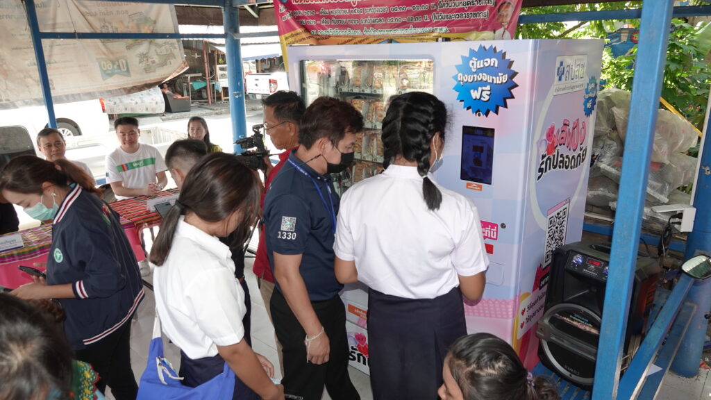 โดยมี นายสาธิต ทิมขำ ผู้อำนวยการเขต สปสช.เขต 4 สระบุรี , ดร.ศันสนีย์ สายะสนธิ ผู้อำนวยการวิทยาลัยการอาชีวศึกษาปทุมธานี , นางนัทธมนวรรณ ยิ่งเจริญสุข รองนายแพทย์สาธารณสุขจังหวัดปทุมธานี , นายประสิทธิ์ เหล่าเกษมสุขวงศ์ ประธานเจ้าหน้าที่บริการฝ่ายพัฒนาธุรกิจ , น.ส.อรกัลยา พิชชาออน หัวหน้าหน่วยรับเรื่องร้องเรียนอิสระ และตัวแทนจากเทศบาลตำบลบางพูน และผู้จัดการนิติบุคคลรังสิตซิตี้ ร่วมเปิดบริการการใช้งาน กดถุงยางอัตโนมัติฟรี “ตู้เลิฟปิ้ง รักปลอดภัย” ภายในชุมชนแฟลตปลาทอง รังสิต จ.ปทุมธานี ขั้นตอนการขอรับถุงยางอนามัยทำได้ง่ายๆ ดังนี้ 1. เสียบบัตรประจำตัวประชาชน เพื่อตรวจสอบสิทธิ 2. อ่านเงื่อนไข >> กด ”ยอมรับ” (ต้องกดยอมรับ จึงจะไปต่อ) 3. เลือกขนาดไซด์ของถุงยาง >> ไซด์ 49 / 52 / 54 / 56 (ต้องเลือกจึงจะไปต่อ) 4. ตู้จะ pop up QR code ของ สปสช. ให้ความรู้เกี่ยวกับการใช้ถุงยาง >> กด “ตกลง” หลังจาก scan เสร็จ 5. รับถุงยาง กรณีติดขัดปัญหา เกี่ยวกับการใช้งานตู้แจกถุงยางอัตโนมัติ เช่น กรอกข้อมูลสำเร็จแต่ถุงยางไม่ตกลงมา เป็นต้น สามารถแจ้งปัญหาการใช้งานได้ดังนี้ @Line @vendingplus โทรศัพท์หมายเลข 02-0090-500