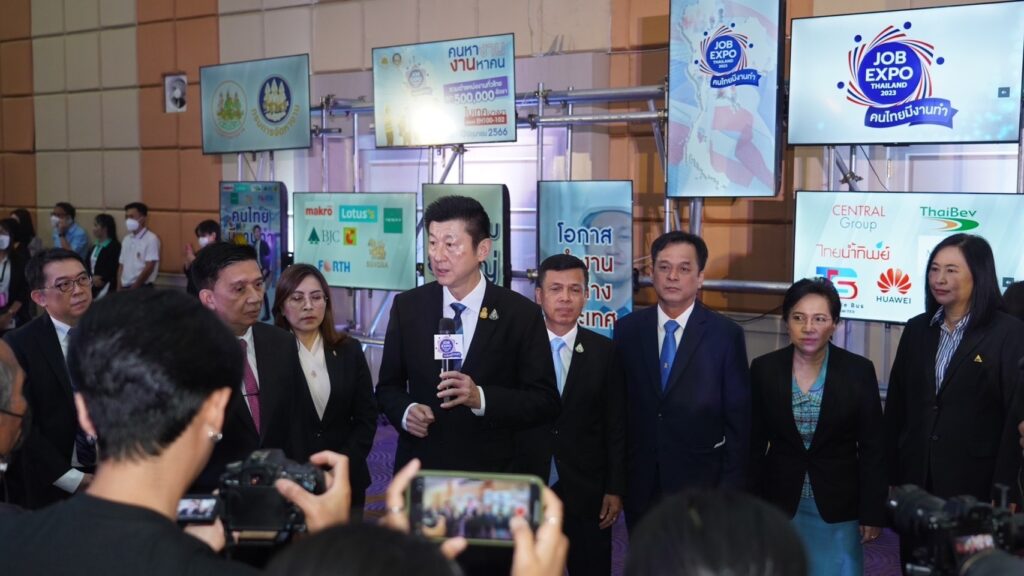 “การจัดงาน Job Expo Thailand 2023 ได้รับความร่วมมือเป็นอย่างดีจากสถานประกอบการภาคเอกชน จำนวน 395 บริษัท ที่พร้อมใจนำตำแหน่งงานมาให้ผู้สมัครเลือกช็อปภายในงาน อาทิ บริษัท หัวเว่ย เทคโนโลยี (ประเทศไทย) จำกัด บริษัท ไมเนอร์ อินเตอร์เนชั่นแนล จำกัด (มหาชน) บริษัท กลุ่มเซ็นทรัล จำกัด บริษัท ไทยเบฟเวอเรจ จำกัด (มหาชน) บริษัท เอก-ชัย ดิสทริบิวชั่น ชิสเทม จำกัด บริษัท สยามแม็คโคร จำกัด (มหาชน) บริษัท ไทย สมายส์ บัส จำกัด บริษัท เบอร์ลี่ ยุคเกอร์ จำกัด (มหาชน) บริษัท ไทยน้ำทิพย์ คอร์ปอเรชั่น จำกัด บริษัท บุญรอดบริวเวอรี่ จำกัด บริษัท ฟอร์ท เวนดิ้ง จำกัด บริษัท คอมเซเว่น จำกัด (มหาชน) บริษัท โพสเซฟี่ กรุ๊ป จำกัด ซึ่งผมเชื่อเป็นอย่างยิ่งว่าพี่น้องประชาชนทุกคนที่มาร่วมงาน มีโอกาสที่จะได้งานกลับไป และเห็นภาพทิศทางตลาดแรงงานได้ชัดขึ้น สามารถเตรียมพร้อมและพัฒนาทักษะตนเอง ให้เป็นแรงงานที่มีศักยภาพสูงขึ้น ซึ่งจะเป็นจุดเริ่มต้นในการสร้างความเข้มแข็งทางเศรษฐกิจและขยับขีดความสามารถการแข่งขันของประเทศได้อย่างยั่งยืน” ปลัด.แรงงาน กล่าว