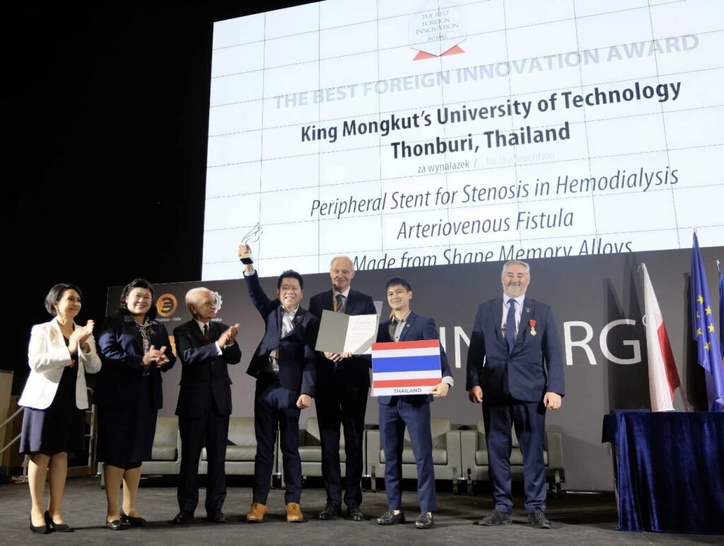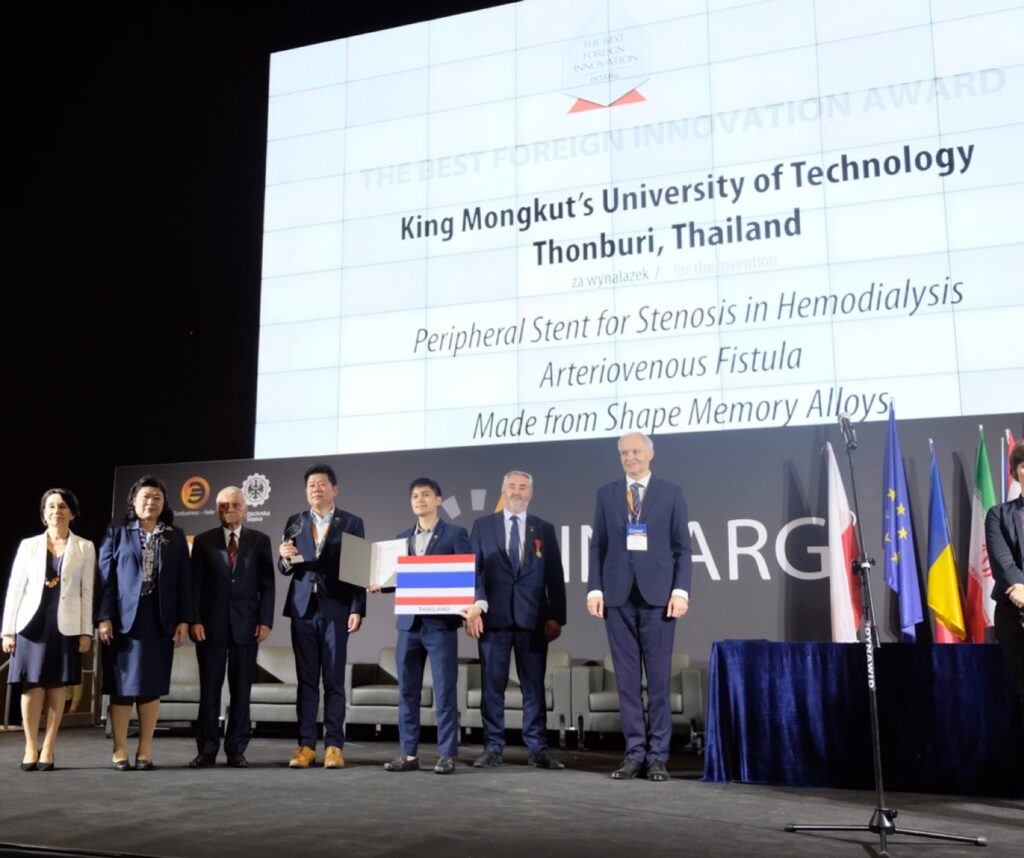 สำหรับผลงานที่ได้รับรางวัล The Best Foreign Innovation Award ได้แก่ ผลงานเรื่อง “อุปกรณ์ถ่างขยายหลอดเลือดสำหรับผู้ป่วยที่หลอดเลือดตีบตันจากการผ่าตัดทำเส้นเลือดสำหรับฟอกไตจากวัสดุโลหะผสมจำรูปนิกเกิล-ไทเทเนียม” โดย รองศาสตราจารย์ ดร.อนรรฆ ขันธะชวนะ และคณะ จากมหาวิทยาลัยเทคโนโลยีพระจอมเกล้าธนบุรี ซึ่งนวัตกรรมดังกล่าวเป็นการใช้ขดลวดถ่างขยายหลอดเลือด ซึ่งเป็นนวัตกรรมทางเลือกใหม่ ที่สามารถช่วยเหลือผู้ป่วยในการรักษาแทนบอลลูนเพื่อบรรเทาความเจ็บปวดและยืดอายุการใช้งานของหลอดเลือดฟอกไต พร้อมนี้ผลงานดังกล่าวยังได้รับรางวัลในระดับ Platinum Medal อีกด้วย