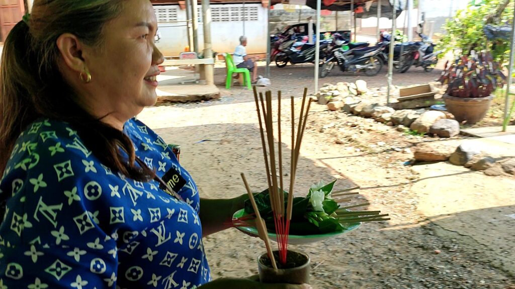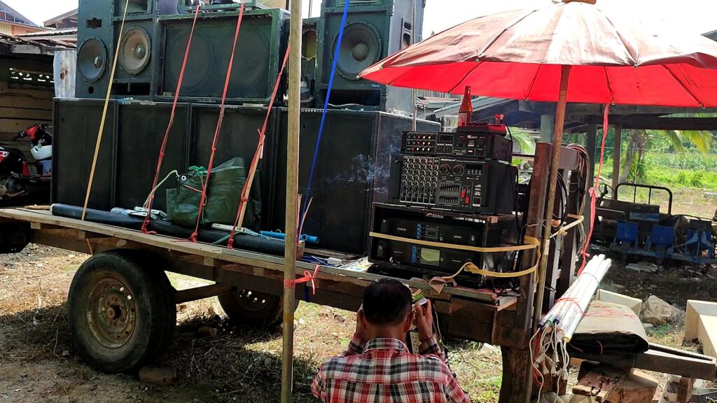 จากการสอบถาม นายบุญโฮม ปะวะเท อายุ 56 ปี เล่าว่า ทุกครั้งเวลาออกงาน ก่อนเปิดใช้งานเครื่องเสียง ในงานพิธีต่างๆ ทางเจ้าของงาน จะต้องนำดอกไม้ธูปเทียน เครื่องเซ่นไหว้ มาแต่งขันธ์ 5 เพื่อไหว้ครู และขอขมาแม่ย่านางเครื่องเสียงก่อน เพื่อไม่ให้มีอุปสรรคใดๆ สามารถเปิดใช้งานอย่างราบรื่น ตลอดการจัดงาน และโดยเฉพาะในงวดที่ผ่านมา ตนเองได้นำธูปเสี่ยงทายมาจุด ตรงที่แต่งขันธ์ 5 เพื่อขอโชค ปรากฏว่าได้เลขเด็ด ถูกรางวัลรับเงินมาจำนวนหนึ่ง พอมางวดนี้ ได้นำเครื่องเสียงมางานบวชอีกครั้ง ก็ไม่พลาดที่จะจุดธูปเสี่ยงทาย โดยมีชาวบ้านที่ทราบข่าว ได้มาติดตาม เฝ้าดูเลขเด็ดกันอย่างไม่ขาดสาย