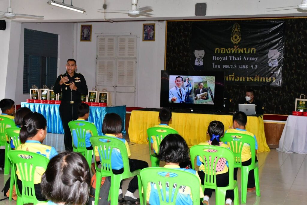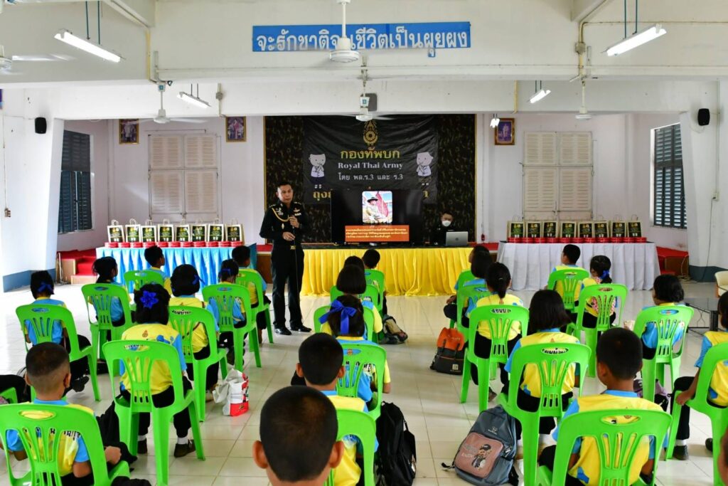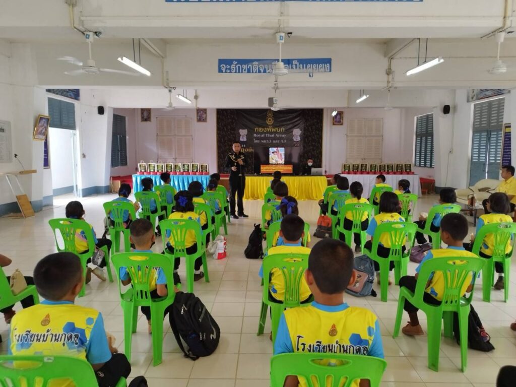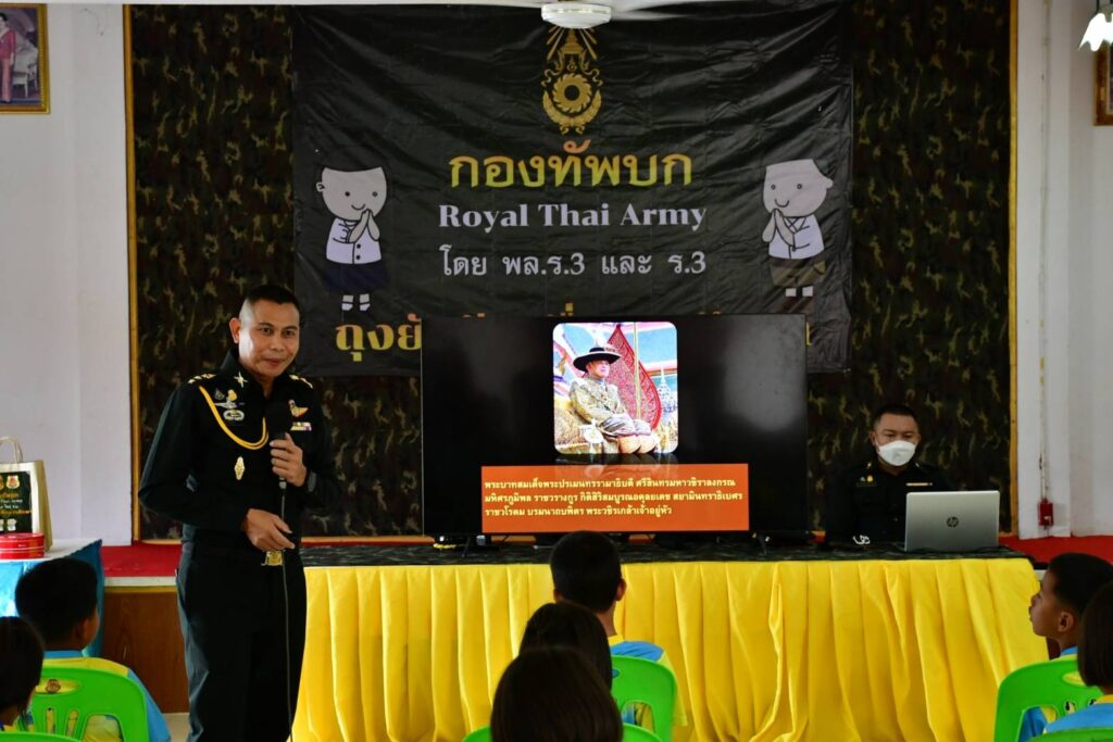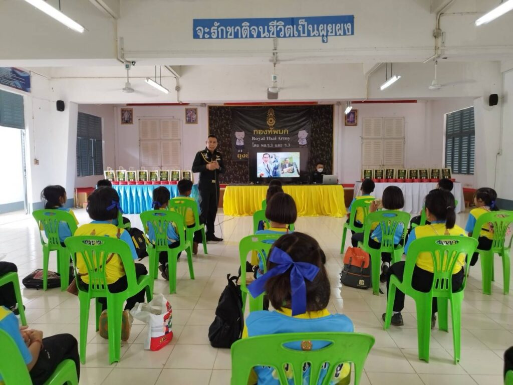 ที่ กรมทหารราบที่ 3 ค่ายกฤษณ์สีวะรา ตำบลธาตุเชิงชุม อำเภอเมือง จังหวัดสกลนคร พันเอก กัญญณัต ไชยโอชะ เสนาธิการกรมทหารราบที่ 3 บรรยายให้ความรู้ การปลูกฝังอุดมการณ์ความรักชาติ ศาสนาการสร้างความรัก ความสามัคคี และการเทิดทูนสถาบันพระมหากษัตริย์ของประเทศไทย ให้เด็กนักเรียนโรงเรียนบ้านกุดฮู หมู่ที่ 4 บ้านกุดฮู ตำบลโพธิไพศาล อำเภอกุสุมาลย์ จังหวัดสกลนคร ซึ่งเป็นโรงเรียนในโครงการพระราชดำริซึ่งอยู่ในพระราชูปถัมภ์ สมเด็จพระกนิษฐาธิราชเจ้า กรมสมเด็จพระเทพรัตนราชสุดาฯ สยามบรมราชกุมารี โดยมีวัตถุประสงค์ เพื่อเน้นการปลูกจิตสำนึก ให้น้องๆนักเรียนรวมถึงคณะครู ได้มองเห็นความสำคัญในการปกป้องสถาบัน ชาติ ศาสนา และสถาบันพระมหากษัตริย์ และสำนึกในเกียรติภูมิของชาติไทย สำนึกถึงความเป็นชาติไทย ที่มีเอกราชมาด้วย ความเสียสละ ทั้งเลือด เนื้อ และชีวิตของบรรพบุรุษไทย มาจนถึงทุกวันนี้ สร้างจิตสำนึก ตระหนักในความสำคัญของสถานบันพระมหากษัตริย์ มีความซาบซึ้งเกิดจิตสำนึกขึ้นในจิตใจของตนเองที่จะปกป้อง และเทิดทูนสถาบันพระมหากษัตริย์ สร้างจิตสำนึกที่ดี รู้รักสามัคคีเสียสละเพื่อชาติศาสนา พระมหากษัตริย์ เพื่อให้เป็นสิ่งยึดเหนี่ยวทางจิตใจ เกิดแรงจูงใจ มีความภาคภูมิใจส่งเสริมทัศนคติ รวมทั้งยึดมั่นในการปกครองในระบอบประชาธิปไตย อันมีพระมหากษัตริย์ทรงเป็นประมุข ทั้งนี้ได้เผยแพร่พระราชประวัติและพระราชกรณียกิจ ตลอดจนพระปรีชาสามารถของบูรพมหากษัตริยาธิราชเจ้าของไทยในอดีตจนถึงสมเด็จพระเจ้าอยู่หัวมหาวชิราลงกรณ บดินทรเทพยวรางกูร รัชกาลที่ 10 ที่ทรงปกป้อง รักษาความเป็นเอกราชของชาติไทยมาจนถึงปัจจุบัน