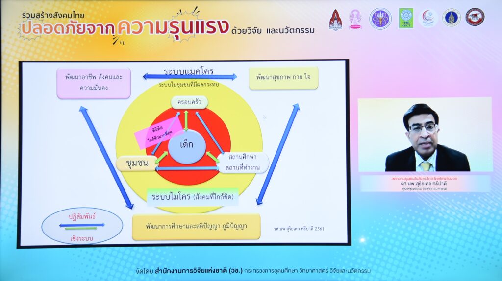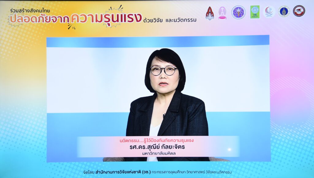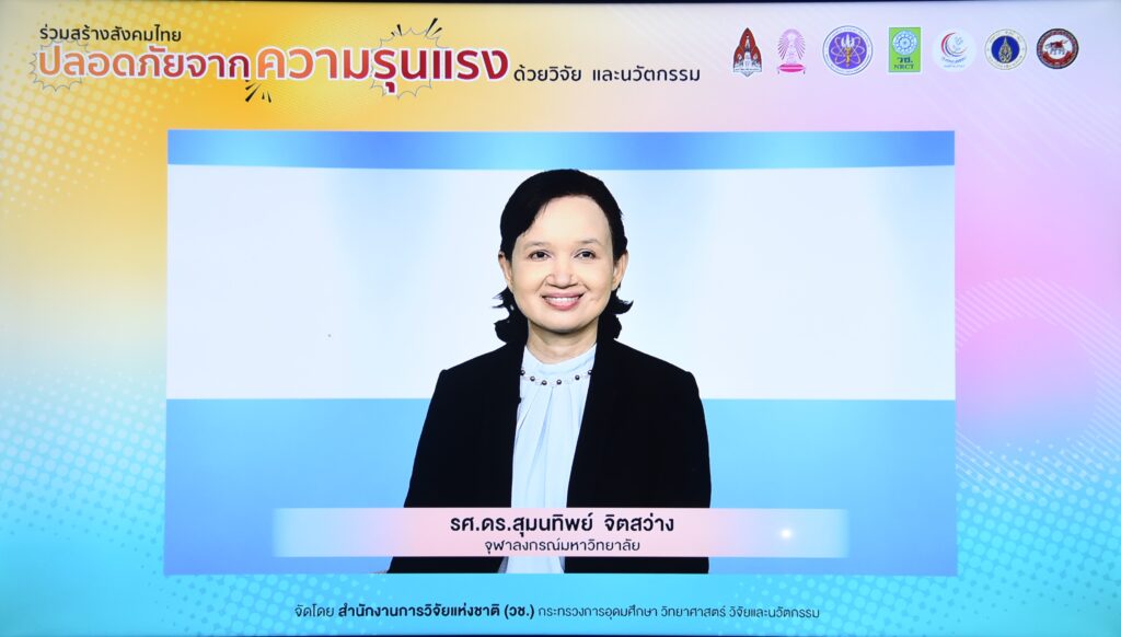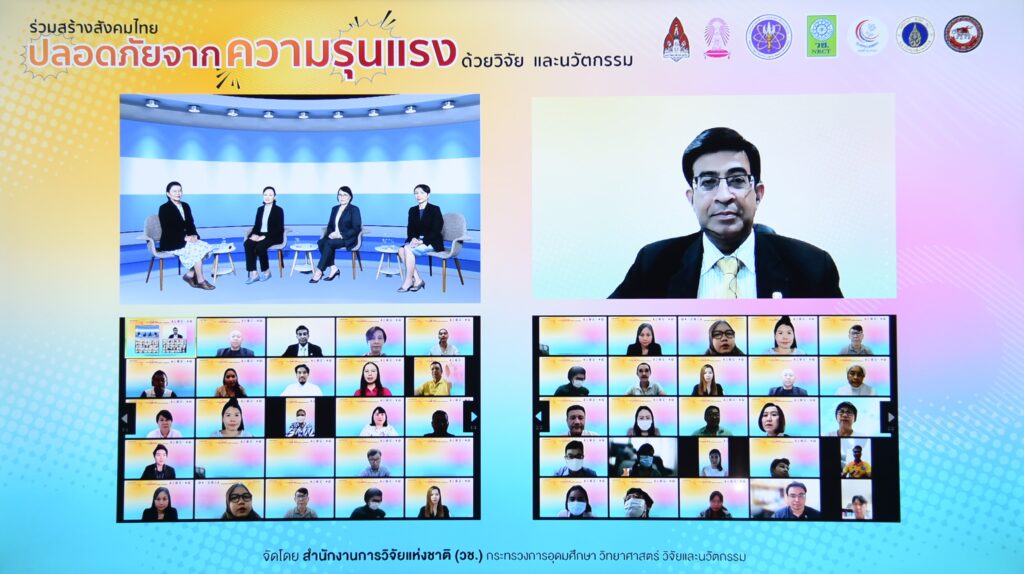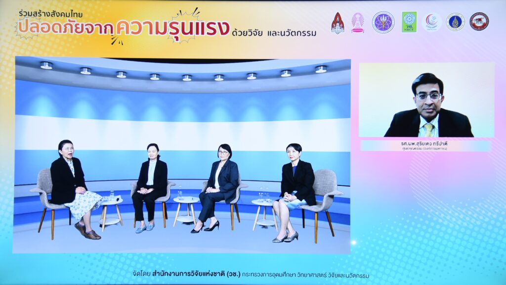 เมื่อวันที่ 1 มิถุนายน 2566 : สำนักงานการวิจัยแห่งชาติ (วช.) กระทรวงการอุดมศึกษาวิทยาศาสตร์ วิจัยและนวัตกรรม (อว.) จัดการเสวนาเรื่อง “ร่วมสร้างสังคมไทยปลอดภัยจากความรุนแรง ด้วยวิจัยและนวัตกรรม” เพื่อเป็นเวทีแลกเปลี่ยนความรู้ และเผยแพร่ผลงานวิจัยและนวัตกรรมที่ได้ให้ทุนสนับสนุน ในประเด็นด้านสังคมไทยปลอดภัยจากความรุนแรง และอยู่ร่วมกันอย่างสันติ โดยมี ดร.วิภารัตน์ ดีอ่อง ผู้อำนวยการสำนักงานการวิจัยแห่งชาติ (ผอ.วช.) เป็นประธานกล่าวเปิดงานเสวนา ผู้ร่วมเสวนาและประเด็นที่น่าสนใจประกอบด้วยประเด็น “ลดความรุนแรงในสังคมไทย โดยใช้พลังบวก” โดย รองศาสตราจารย์ นายแพทย์สุริยเดว ทรีปาตี ผู้อำนวยการศูนย์คุณธรรม (องค์การมหาชน) ประเด็น “ความรุนแรงในสังคมไทย : ภัยเงียบที่ควรรู้” โดย รองศาสตราจารย์ ดร.สุมนทิพย์ จิตสว่าง จุฬาลงกรณ์มหาวิทยาลัย ประเด็น “นวัตกรรม…รู้ไว้ป้องกันภัยความรุนแรง” โดย รองศาสตราจารย์ ดร.สุณีย์ กัลยะจิตร มหาวิทยาลัยมหิดล และ ประเด็น “สื่อสร้างสรรค์ รังสรรค์สังคมปลอดภัย” โดย รองศาสตราจารย์ ดร.พนิดา จงสุขสมสกุล มหาวิทยาลัยนเรศวร ดำเนินรายการเสวนา โดย รองศาสตราจารย์ ดร.ศุภวัฒนากร วงศ์ธนวสุ มหาวิทยาลัยขอนแก่น ณ ห้องประชุมจอมพลสฤษดิ์ ธนะรัชต์ สำนักงานการวิจัยแห่งชาติ ถนนพหลโยธิน กรุงเทพมหานคร และผู้ร่วมรับฟังการเสวนา ผ่านรูปแบบออนไลน์สื่ออิเล็กทรอนิกส์ Zoom Meeting และ Facebook Live