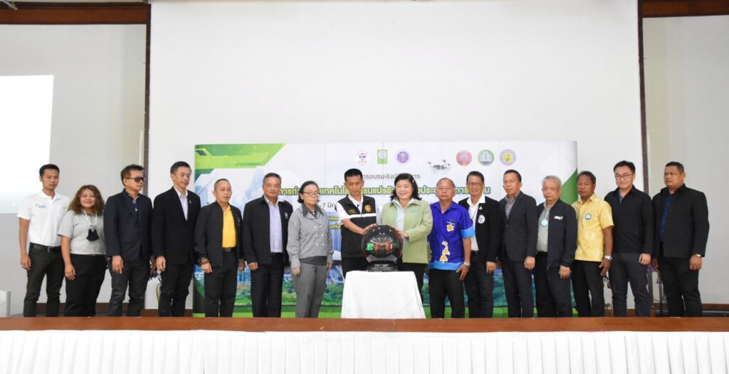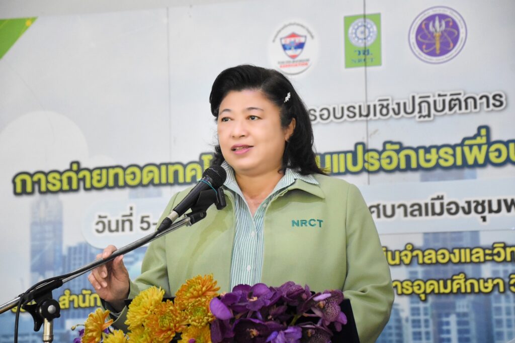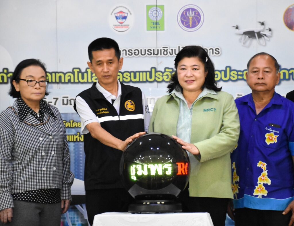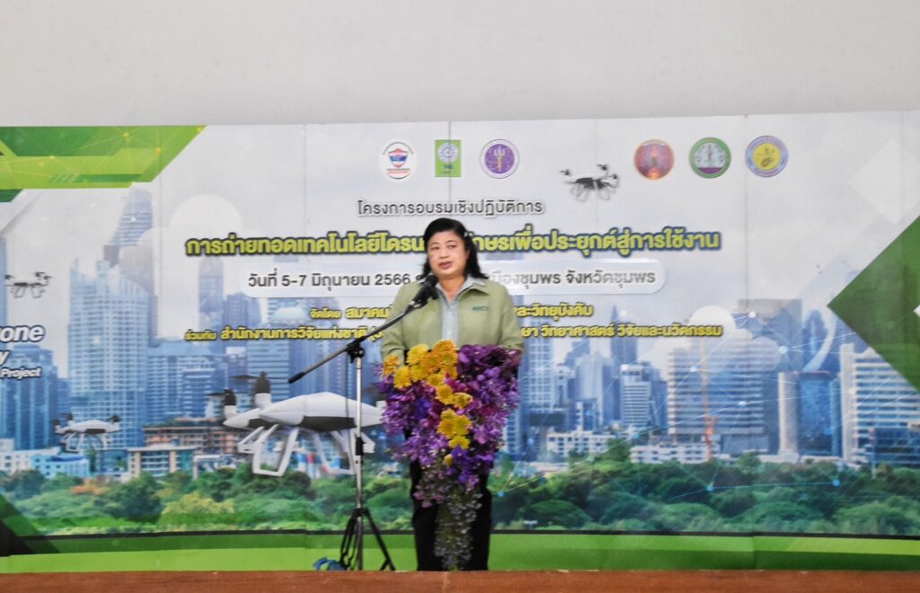 วันที่ 5 มิถุนายน 2566 สำนักงานการวิจัยแห่งชาติ (วช.) กระทรวงการอุดมศึกษา วิทยาศาสตร์ วิจัยและนวัตกรรม (อว.) ร่วมกับ สมาคมกีฬาเครื่องบินจำลองและวิทยุบังคับ จัดพิธีเปิดกิจกรรมส่งเสริมและสนับสนุนการวิจัยและนวัตกรรม “การอบรมเชิงปฏิบัติการถ่ายทอดเทคโนโลยีโดรนแปรอักษรเพื่อประยุกต์สู่การใช้งาน” ภาคใต้ ครั้งที่ 1 ระหว่างวันที่ 5–7 มิถุนายน 2566 โดยมี ดร.วิภารัตน์ ดีอ่อง ผู้อำนวยการสำนักงานการวิจัยแห่งชาติ (ผอ.วช.) เป็นประธานในพิธีเปิดการอบรมฯ เพื่อถ่ายทอดองค์ความรู้เทคโนโลยีที่ทันสมัยเกี่ยวกับ “โดรนแปรอักษร” และการพัฒนาซอฟแวร์โดรนเพื่อนำไปประยุกต์ใช้งาน พร้อมนี้ นายวิสาห์ พูลศิริรัตน์ ผู้ว่าราชการจังหวัดชุมพร,นายพิศิษฐ์ มิตรเกื้อกูล นายกสมาคมกีฬาเครื่องบินจำลองและวิทยุบังคับ,นายศรีชัย วีระนรพานิช นายกเทศมนตรีเมืองชุมพร พร้อมด้วย ผู้บริหารหน่วยงานในจังหวัดชุมพร คณะผู้ทรงคุณวุฒิ (วช.) และสื่อมวลชน เข้าร่วมในพิธีฯ ณ เทศบาลเมืองชุมพร จังหวัดชุมพร