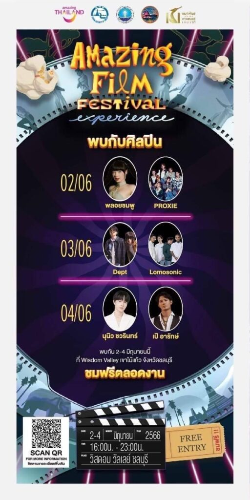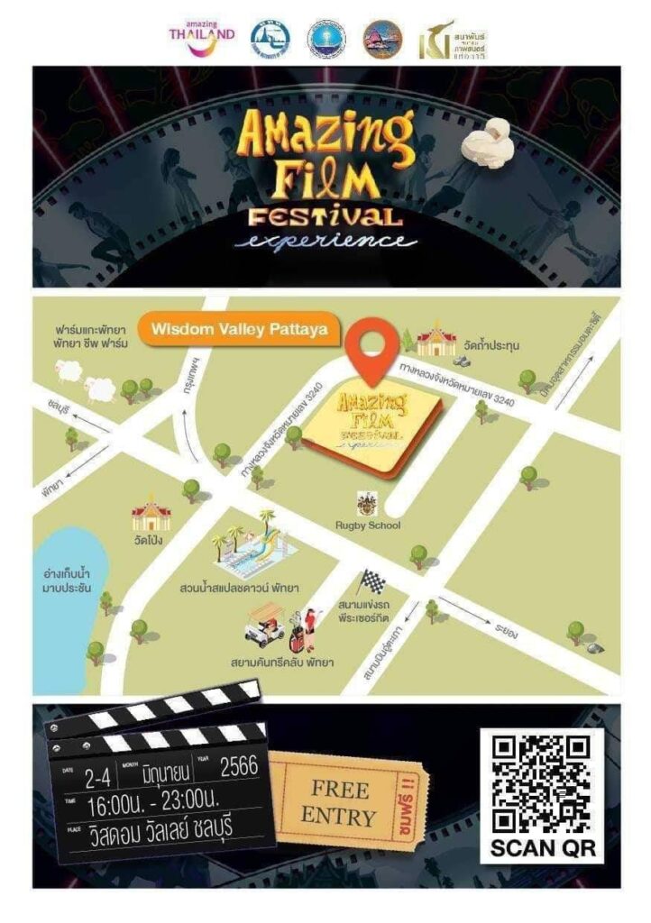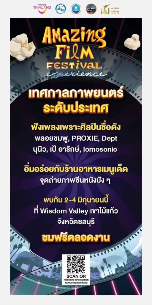 งานเทศกาลภาพยนตร์ Amazing Film Festival Experience จัดขึ้นระหว่างวันที่ 2-4 มิถุนายน 2566 ณ Wisdom Valley จังหวัดชลบุรี ภายใต้แนวคิด World Best Film Destination สื่อถึงแนวคิดสร้างสรรค์และการส่งเสริมเอกลักษณ์เพื่อนำประเทศไทยสู่การเป็นเมืองแห่งภาพยนตร์ระดับโลก ภายในงานมีกิจกรรมที่น่าสนใจมากมาย อาทิ การจัดนิทรรศการภาพยนตร์ (Film Showcase & Exhibition) โดยได้รับเกียรติจากผู้เชี่ยวชาญด้านภาพยนตร์มาร่วมแชร์ความรู้เกี่ยวกับขั้นตอนการผลิตผลงาน การประกวดหนังสั้น (Short Film Events) การจัดแสดงศิลปะและประติมากรรมภาพยนตร์ (Installation Art Film) การแสดงภาพยนตร์ (Film Presentation) ทั้งไทยและต่างประเทศกว่า 20 เรื่อง และกิจกรรมไฮไลท์ ททท. จะพาผู้เข้าร่วมงานสัมผัสประสบการณ์รับชมภาพยนตร์กลางแจ้งมิติใหม่ใน 4 รูปแบบ ครั้งแรกในประเทศไทย ได้แก่ 1. ชมภาพยนตร์จอยักษ์ริมทะเลสาบ เช่น ภาพยนตร์เรื่อง The Beach, พี่มาก…พระโขนง, Top Gun, Elvis , La La Land ภาพยนตร์สั้นเรื่อง Hairdresser