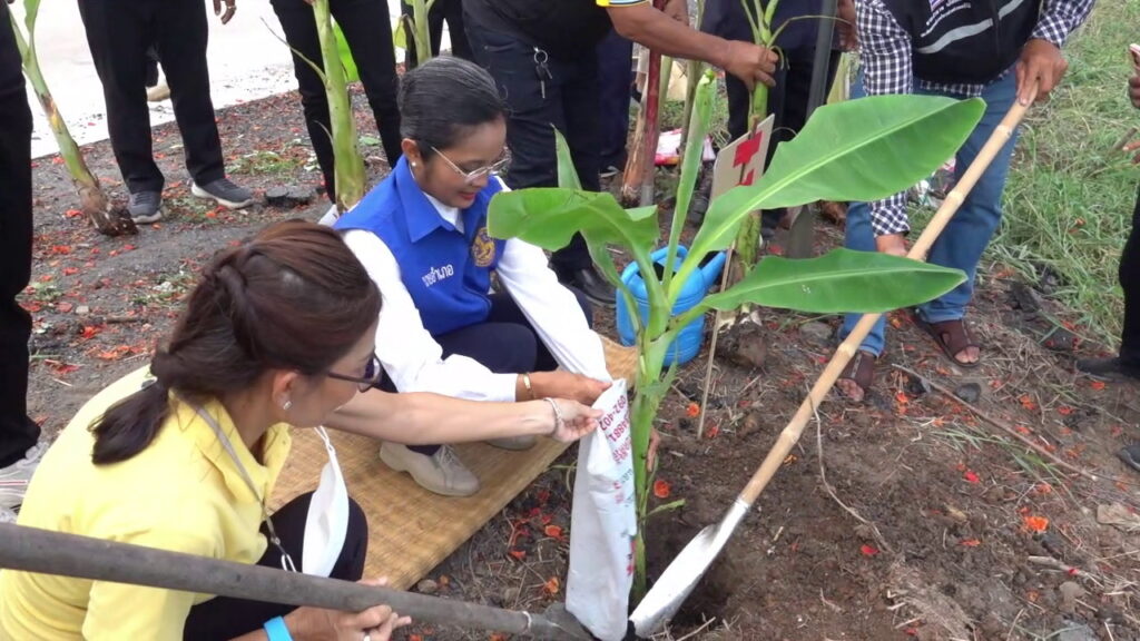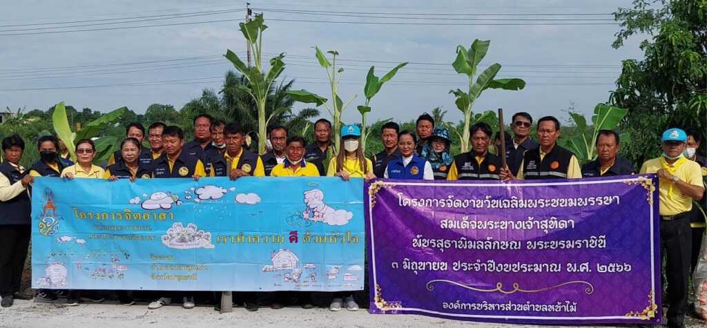 บรรยากาศการร่วมกิจกรรมปลูกต้นกล้วย กล้วยน้ำว้าพันธุ์มะลิอ่อง กล้วยหอมทอง จำนวน 200 ต้น เพิ่มพื้นทีสีเขียวเพื่ออนุรักษ์สิ่งแวดล้อมและสร้างความเข้มแข็งทางเศรษฐกิจ ลดความเหลื่อมล้ำสร้างอาชีพและรายได้พัฒนาคุณภาพชีวิตคุณในชุมชนอย่างยั่งยืน มีข้าราชการ ผู้นำท้องถิ่น และประชาชนจิตอาสาในโครงการจิตอาสาเราทำความดีด้วยหัวใจ มาร่วมกิจกรรมกว่า 100 คน และร่วมเฉลิมพระชนมพรรษา สมเด็จพระนางเจ้าสุทิดา พัชรสุธาพิมลลักษณ พระบรมราชินี วันที่ 3 มิถุนายน 2566 ประชาชนใกล้เคียงสามารถช่วยดูแล และหากมีผลออกมา สามารถเก็บรับประทานได้ฟรี