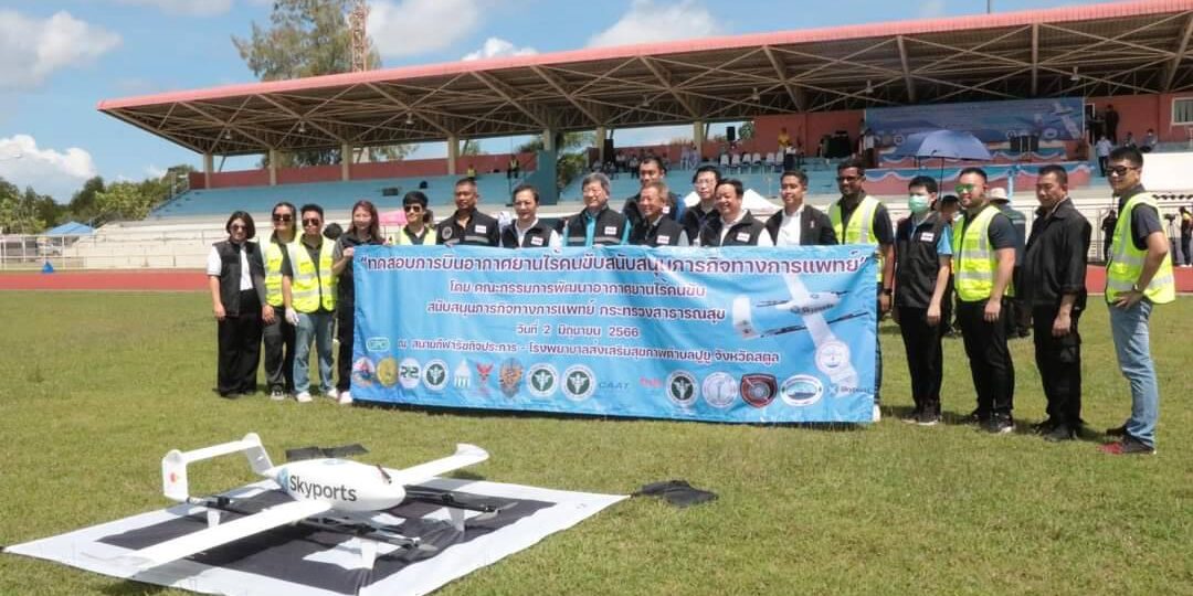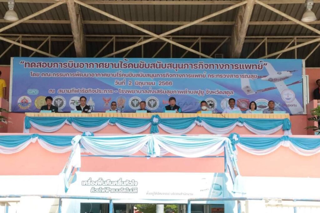 กระทรวงสาธารณสุข ร่วมกับภาคีเครือข่าย ทดสอบระบบการบินอากาศยานไร้คนขับ ครั้งแรกของไทย ขนส่งยาและเวชภัณฑ์บินข้ามทะเล จากรพ.สตูล-รพ.สต.ปูยู ระยะทาง 12 กม. โดยทีม Skyports จากสิงคโปร์ และคณะกรรมการพัฒนาอากาศยานไร้คนขับสนับสนุนภารกิจทางการแพทย์ ร่วมปฏิบัติการยกระดับระบบบริการสุขภาพ ประชาชนในพื้นที่ห่างไกล เข้าถึงยาและเวชภัณฑ์ได้รวดเร็ว นำไปใช้เป็นโมเดลกลางสำหรับพื้นที่อื่นทั่วประเทศต่อไป