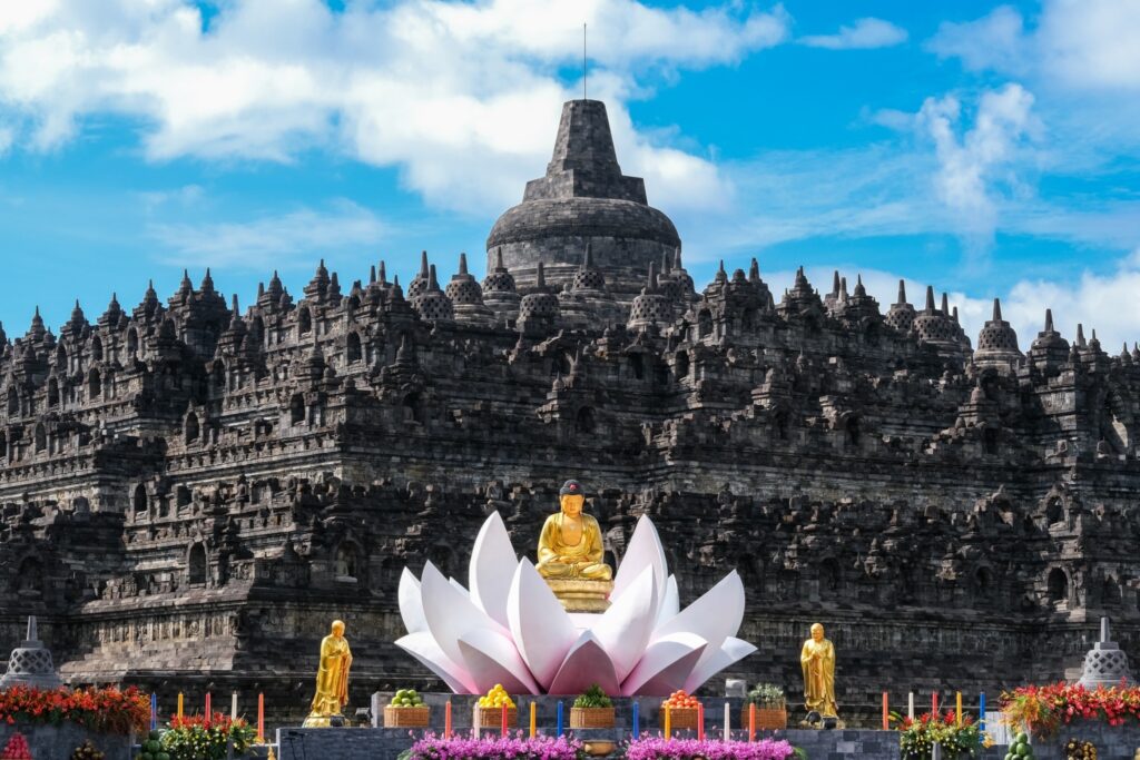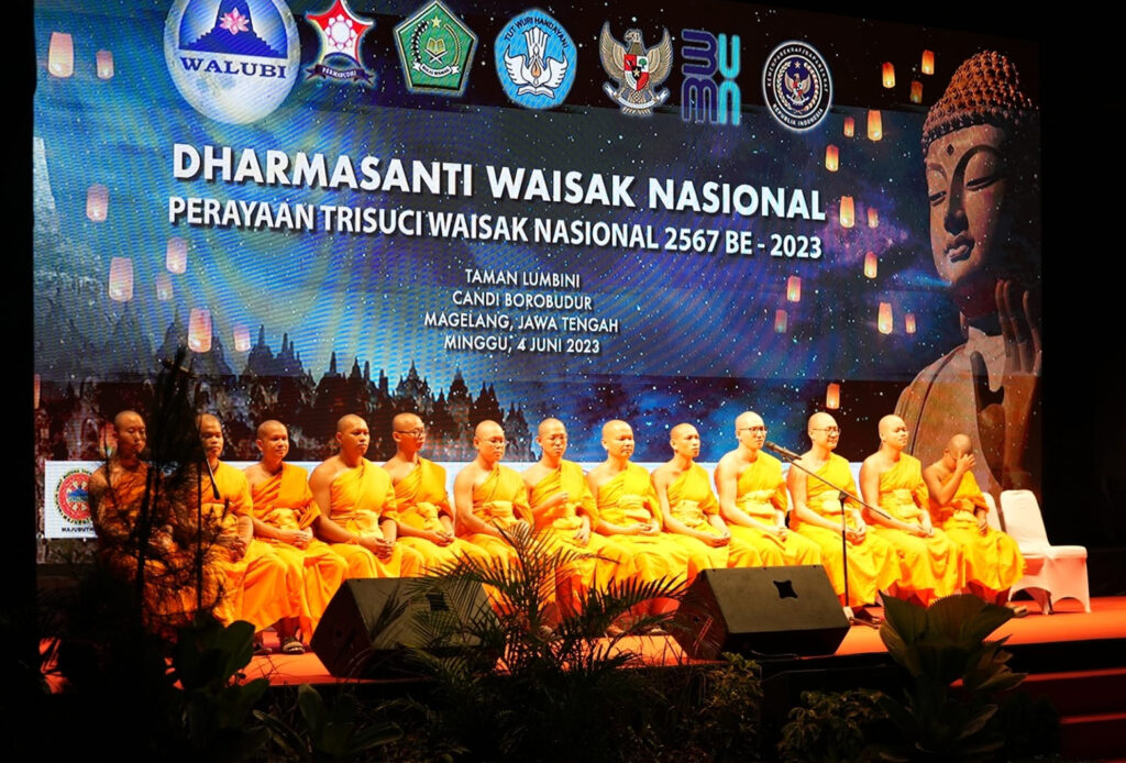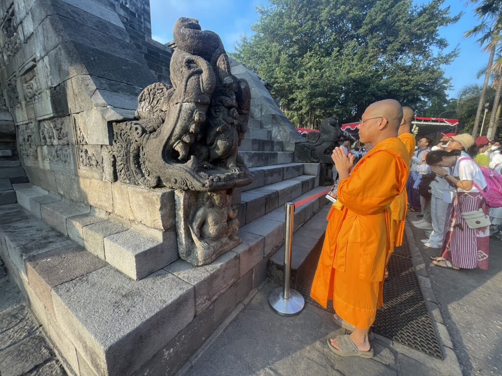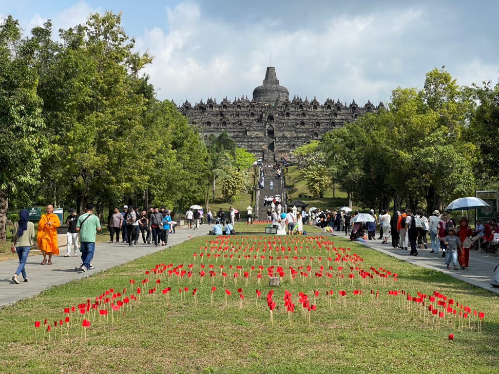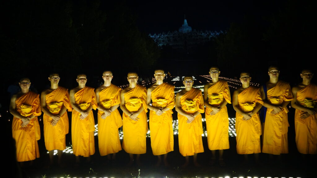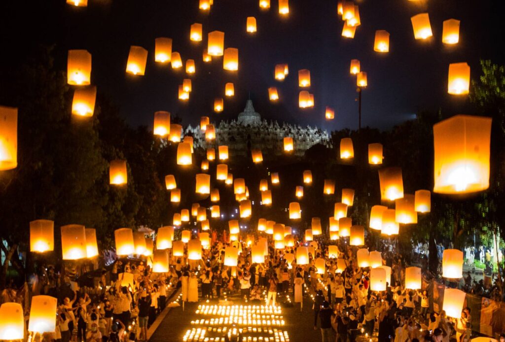 บรรยากาศงาน WAISAK NASIONAL LIGHT OF PEACE วันวิสาขบูชาที่ยิ่งใหญ่ เพื่อรำลึกถึงพระคุณอันไม่มีประมาณขององค์พระสัมมาสัมพุทธเจ้า ซึ่งเน้นในการสอนสมาธิเป็นหลัก ก่อนจุดโคมไฟภายนอก และจุดความสว่างภายใน ด้วยการเจริญสมาธิภาวนา โดยในปีนี้จัดตรงกับวันที่ 4 มิถุนายน ตามคำเชิญของสมาคมชาวพุทธชื่อ “Walubi” ซึ่งมีการปิดถนนให้ริ้วขบวนพาเหรดเดินผ่าน ระยะทางเกือบ 5 กิโลเมตร สิ่งที่น่าตื่นตาตื่นใจชาวอินโดนีเซียหลายศาสนา เช่นศาสนาอิสลาม คริสต์ ฮินดู ฯลฯต่างมายืนริมถนนเพื่อคอยชมริ้วบวนพาเหรด ในวันสำคัญทางพระพุทธสาสนา วันวิสาขบูชา ตลอดเส้นทาง ซึ่งมีคณะสงฆ์จากประเทศไทย เวียดนาม อินโดนีเซีย เนปาล ศรีลังกา พม่า ลาว และกัมพูชา เป็นต้นเข้าร่วมพิธี ซึ่งริ้วขบวนรถบุปผาชาติและสมาคมชาวพุทธ กว่า 20 องค์กร อัญเชิญ น้ำและไฟศักดิ์สิทธิ์ จากวัดเมนดุตไปยังมหาเจดีย์บรมพุทโธ ระยะทาง 4 กิโลเมตร เพื่อถวายเป็นพุทธบูชาภาคกลางคืนก็จะมีการนั่งสมาธิ ลอยโคมเพื่อถวายเป็นพุทธบูชา ซึ่งที่นี้จะทำร่วมกันทั้งมหายาน มหานิกาย ธรรมยุต เป็น “สังฆสามัคคี”