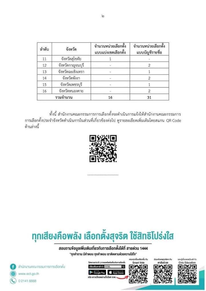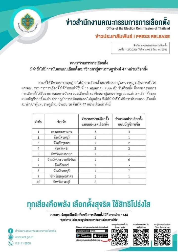 1.กรุงเทพมหานคร นับคะแนนใหม่ ส.ส. แบบแบ่งเขตเลือกตั้ง หน่วยเลือกตั้งที่ 40 แขวงบางซื่อ เขตบางซื่อ เขตเลือกตั้งที่ 7 , หน่วยเลือกตั้งที่ 15 แขวงคลองกุ่ม เขตบึงกุ่ม เขตเลือกตั้งที่ 15 และ หน่วยเลือกตั้งที่ 7 แขวงแสนแสบ เขตมีนบุรี เขตเลือกตั้งที่ 18 แบบบัญชีรายชื่อ หน่วยเลือกตั้งที่ 3 แขวงบ้านบาตร เขตป้อมปราบศัตรูพ่าย เขตเลือกตั้งที่ 1 , หน่วยเลือกตั้งที่ 7 แขวงสะพานสอง เขตวังทองหลาง เขตเลือกตั้งที่ 5 และ หน่วยเลือกตั้งที่ 11 แขวงคลองต้นไทร เขตคลองสาน เขตเลือกตั้งที่ 24