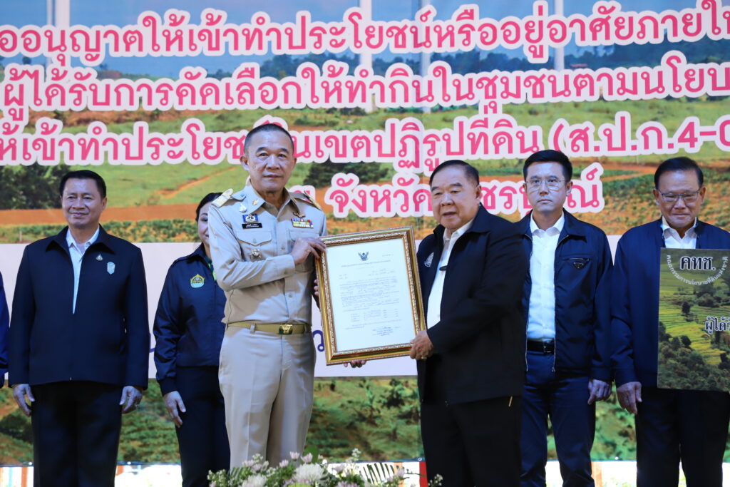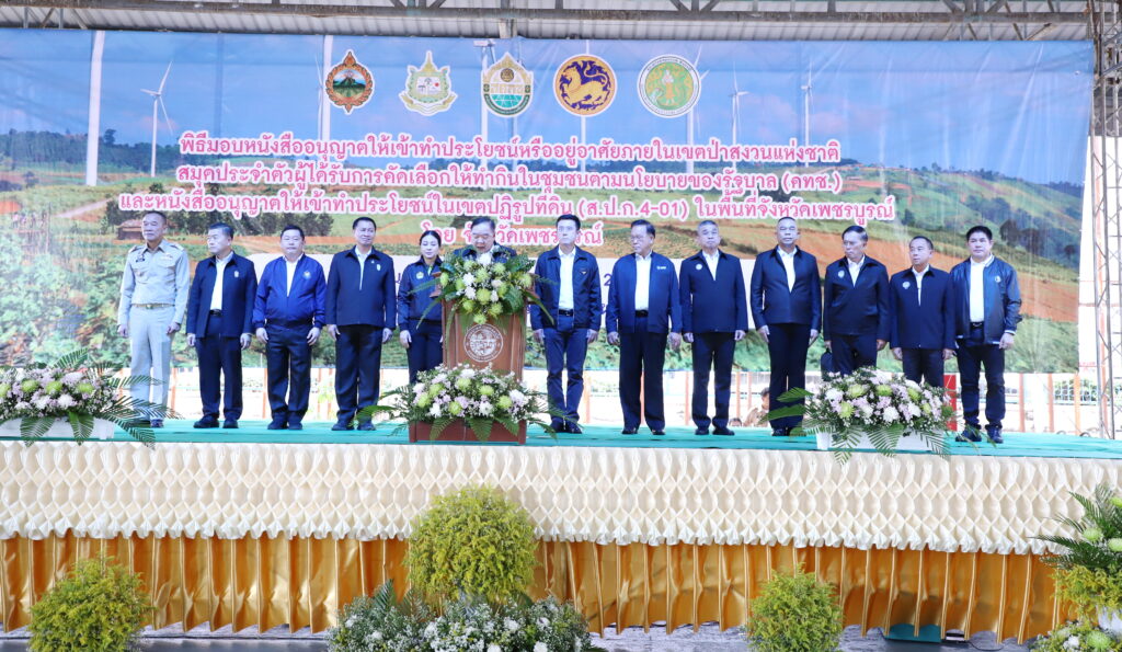 ในโอกาสนี้ นายกฤษณ์ คงเมือง ผู้ว่าราชการจังหวัดเพชรบูรณ์ ในฐานะประธาน คทช. จังหวัดเพชรบูรณ์ ได้กล่าวต้อนรับและรายงานความเป็นมา ภูมิสังคม รวมถึงผลการดำเนินงานการจัดที่ดินทำกินให้ชุมชน ตามนโยบายรัฐบาล ในภาพรวมจังหวัดเพชรบูรณ์ จากนั้น พลเอก ประวิตร วงษ์สุวรรณ รองนายกรัฐมนตรี ได้มอบหนังสืออนุญาตให้เข้าทำประโยชน์หรืออยู่อาศัยภายในเขตป่าสงวนแห่งชาติ จำนวน 13 พื้นที่ (9 ป่า) ประกอบด้วย 1) ป่าวังโป่ง ป่าชนแดน และป่าวังกำแพง เนื้อที่ 45,302 – 0 – 29 ไร่ 2) ป่าเขาโปลกหล่น เนื้อที่ 3,560 – 2 – 40 ไร่ 3) ป่าเขาปางก่อและป่าวังชมภู เนื้อที่ 22,787 – 0 – 61 ไร่ 4) ป่าน้ำหนาว เนื้อที่ 22,580 – 2 -19 ไร่ 5) ป่าสองข้างทางสายชัยวิบูลย์ เนื้อที่ 5,427 – 0 – 0 ไร่ 6) ป่าโคกซำซาง เนื้อที่ 3,256 – 3 – 41 ไร่ 7) ป่าลำกงและป่าคลองตะโก เนื้อที่ 12,391 – 2 – 60 ไร่ 8) ป่าลุ่มน้ำป่าสัก เนื้อที่ 14,288 – 3 – 10 ไร่ 9) ป่าฝั่งซ้ายแม่น้ำป่าสัก เนื้อที่ 80,921 – 2 – 23 ไร่ พร้อมทั้งสมุดประจำตัวผู้ได้รับการคัดเลือกให้ทำกินในชุมชนตามนโยบายรัฐบาล (คทช.) พื้นที่ป่าสงวนแห่งชาติ ป่าฝั่งซ้ายแม่น้ำป่าสัก จำนวน 3,906 ราย ให้กับผู้แทนประชาชนจากอำเภอหนองไผ่ อำเภอบึงสามพัน อำเภอวิเชียรบุรี และอำเภอศรีเทพ จังหวัดเพชรบูรณ์