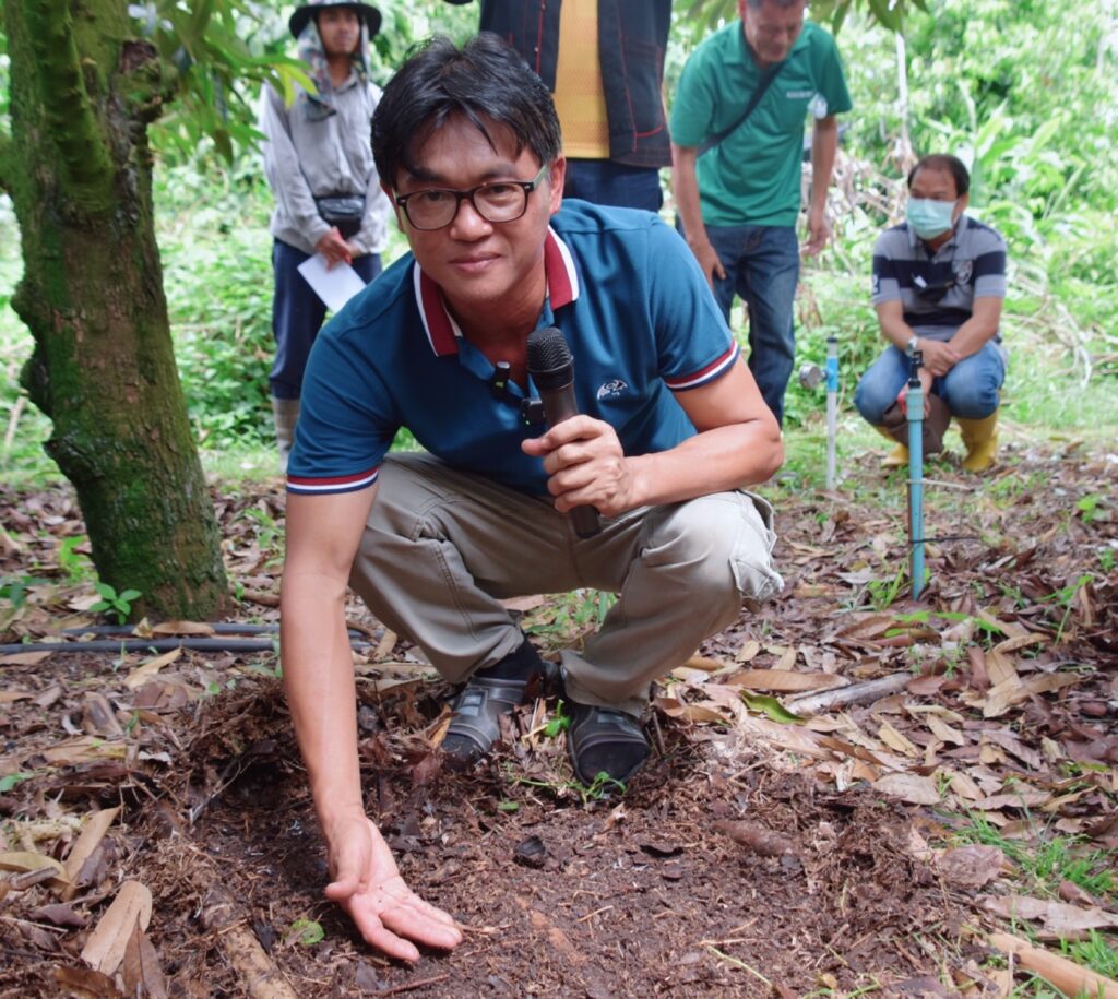 รศ.ดร.วรภัทร วชิรยากรณ์ ผู้บริหารจัดการโครงการวิจัย เปิดเผยว่า ได้นำนวัตกรรมการให้น้ำทุเรียนแบบ Basin Fertigation และนวัตกรรมการสร้างระบบนิเวศชักนำรากลอย มาถ่ายทอดให้กับ นายสุชาติ วงษ์สุเทพ เจ้าของสวนเกษตรไฮเปอร์ ตำบลไม้เค็ด อำเภอเมือง จังหวัดปราจีนบุรี เนื่องจาก 2 ปีที่แล้ว ต้นทุเรียนของสวนเกษตรไฮเปอร์ ประสบปัญหาใบโทรม ใบเล็ก ยอดทุเรียนแห้งเป็นก้านธูป บางแปลงมีโรครากเน่า โคนเน่า จึงนำนวัตกรรมดังกล่าวมาปรับใช้จนประสบความสำเร็จ ต้นทุเรียนฟื้นกลับมามีสุขภาพแข็งแรง มีภูมิต้านทานโรคและแมลงได้ด้วยตัวเอง ไม่กลับมาเป็นโรคซ้ำ กิ่งแต่ละกิ่งสามารถแตกยอดได้ 3 ครั้งในหนึ่งปี เมื่อถึงเวลาออกดอกไม่ต้องกักน้ำและราดสารควบคุมการเจริญเติบโต ดอกสามารถออกมาเองเมื่อกระทบหนาวตามธรรมชาติและความสมบูรณ์ของต้น จากระบบนิเวศของรากที่พึ่งพา กับจุลินทรีย์ช่วยตรึงธาตุอาหาร เป็นผลให้สามารถลดการใช้ปุ๋ยและสารเคมีเกษตรจากเดิมเหลือแค่ไม่เกินราคาฟางแห้งก้อนเดียว