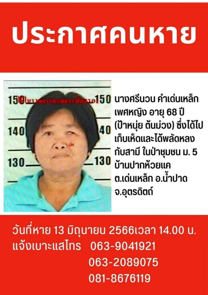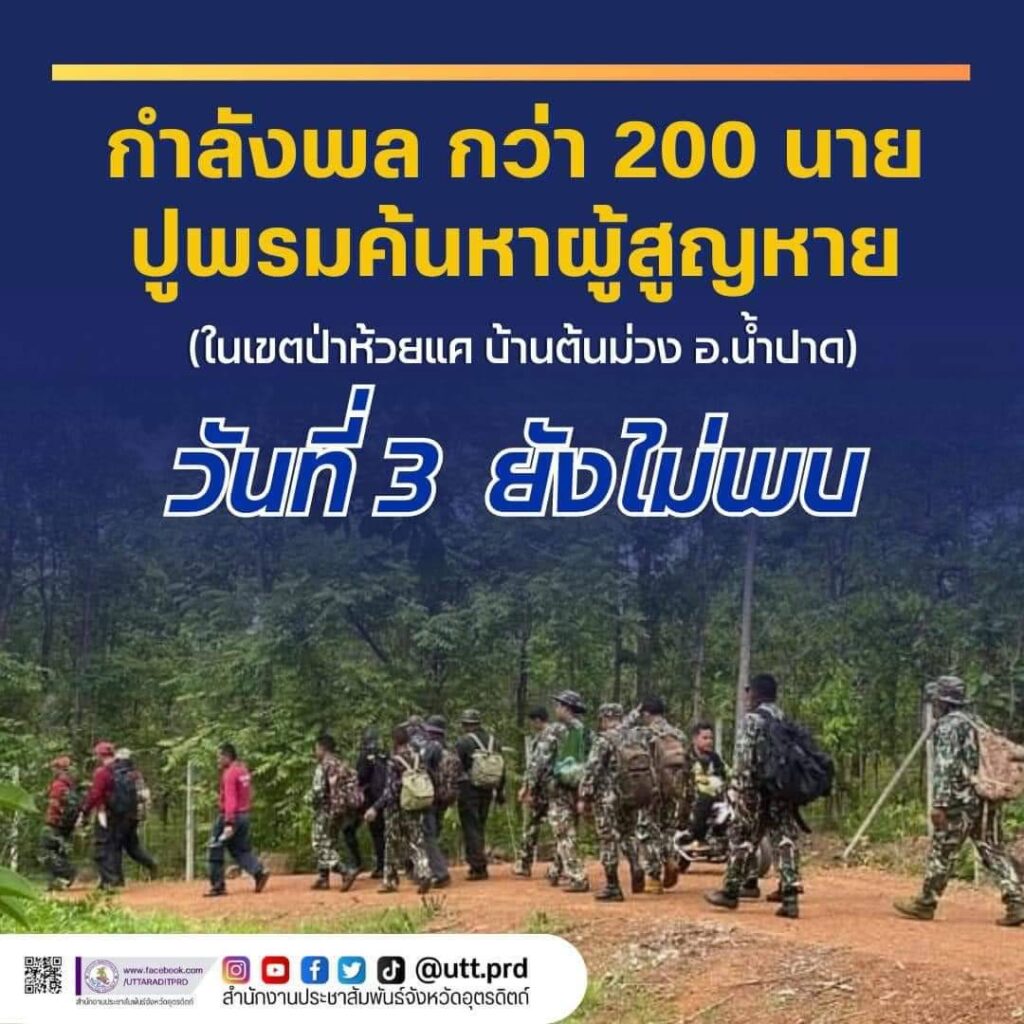 หน่วยงานในพื้นที่ ได้ปฏิบัติการค้นหาผู้สูญหายในป่า กรณี นางศรีนวน อายุ 68 ปี โดยในวันนี้ได้รับการสนับสนุนกำลังพลจากหน่วยกู้ภัยมูลนิธิอุตรดิตถ์สงเคราะห์ , หน่วยกู้ภัยหมอนไม้ , เจ้าหน้าที่ป้องกันภัย , ตชด. , ตำรวจ , เจ้าหน้าที่ป่าไม้ , ชาวบ้าน ฯลฯ ประมาณ 200 นาย , เครือข่ายมอเตอร์ไซด์วิบากกว่า 20 คัน พร้อมเครื่องมืออุปกรณ์