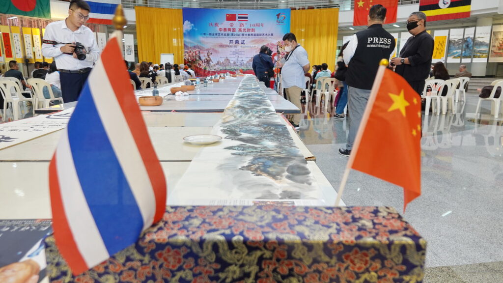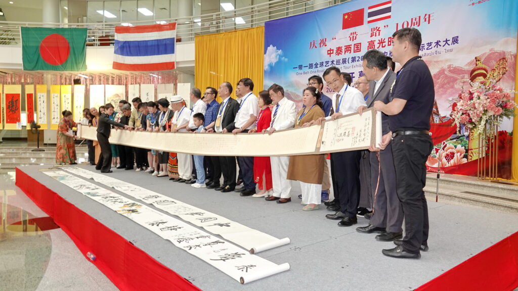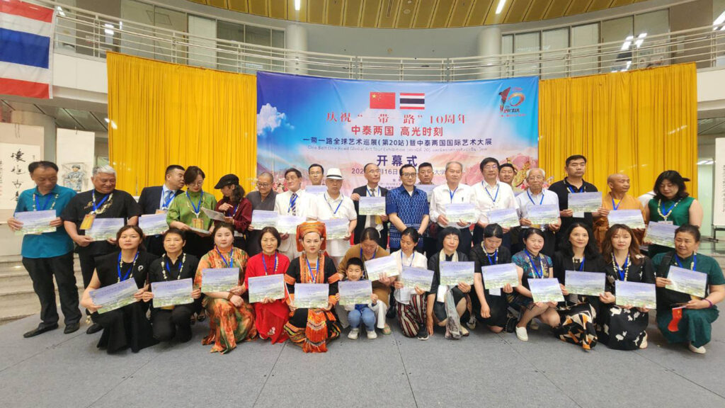 บรรยากาศของนิทศรรศการศิลปะ ไทย-จีน “One Belt and One Road Global Art Tour” ครั้งที่ 20 มีผู้ที่ชื่นชอบศิลปะ นักวิชาการ และสมาชิกในชุมชนท้องถิ่น ตัวแทนเครือข่ายศิลปะในประเทศไทย 3 สถาบัน ได้แก่ 1. มหาวิทยาลัยศิลปากร 2.มหาวิทยาลัยเทคโนโลยีราชมงคลธัญบุรี และ 3.มหาวิทยาลัยธุรกิจบัณฑิต ร่วมโชว์ผลงานจิตรกรรมจากประเทศจีนและประเทศไทย เป็นสัญลักษณ์ของความสัมพันธ์อันแน่นแฟ้นระหว่างมหาวิทยาลัยและชุมชนศิลปะของทั้งสองประเทศ และเป็นการนำเสนอการแสดงออกทางศิลปะและมุมมองที่หลากหลาย ผู้เข้าชมนิทรรศการมีโอกาสสัมผัสโลกแห่งศิลปะไทยและจีนที่มีชีวิตชีวา และความลุ่มลึกของทั้งสองวัฒนธรรม โดยเน้นที่เทคนิค ธีม และลวดลายทางวัฒนธรรมอันเป็นเอกลักษณ์ที่แยกความแตกต่างของศิลปะไทยและจีน