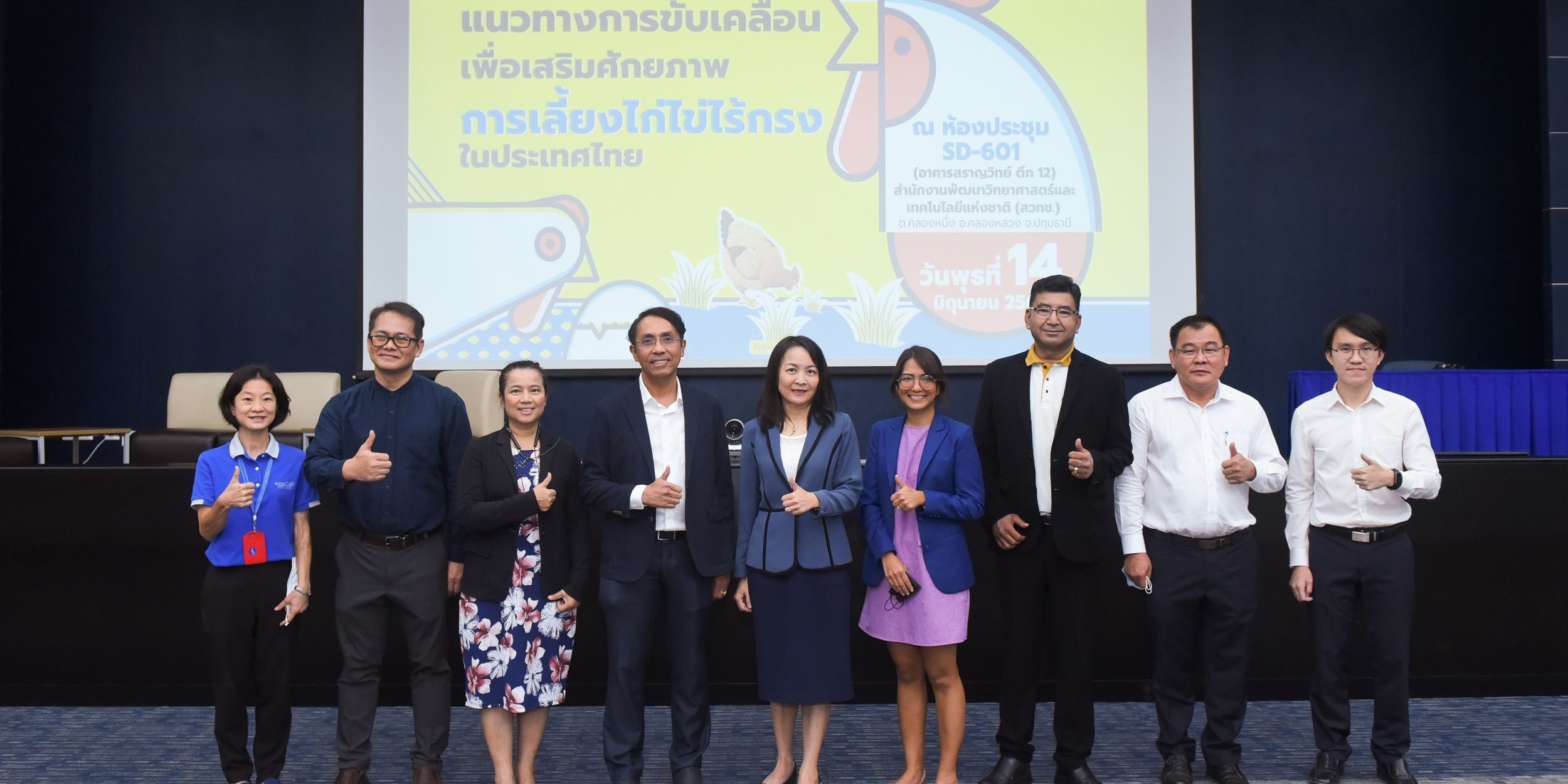 เมืรอวันที่ 14 มิถุนายน 2566 ณ ห้องประชุม SD 601 อุทยานวิทยาศาสตร์ประเทศไทย จ.ปทุมธานี : สำนักงานพัฒนาวิทยาศาสตร์และเทคโนโลยีแห่งชาติ (สวทช.) โดยโปรแกรมสนับสนุนการพัฒนาเทคโนโลยีและนวัตกรรม (ITAP) ร่วมกับ นักวิจัยด้านเทคโนโลยีชีวภาพทางอาหารศูนย์พันธุวิศวกรรมและเทคโนโลยีชีวภาพแห่งชาติ (ไบโอเทค) นักวิชาการจากสถาบันการจัดการเทคโนโลยีและนวัตกรรมเกษตร (สวทช.) อาจารย์จากภาควิชาสัตวบาล คณะเกษตร มหาวิทยาลัยเกษตรศาสตร์ และบริษัท คะตะลิสต์ จำกัด ซึ่งเป็นบริษัทธุรกิจเพื่อสังคม จัดสัมมนา แนวทางการขับเคลื่อนเพื่อเสริมศักยภาพการเลี้ยงไก่ไข่ไร้กรงในประเทศไทย โดยมีผู้ประกอบการฟาร์มไก่ไข่ทั่วทุกภูมิภาค และผู้สนใจเข้าร่วมฟังสัมมนาทั้งแบบออนไลน์และออนไซต์กว่า 200 คน