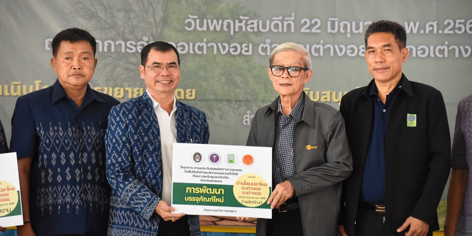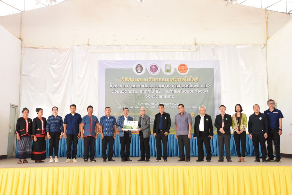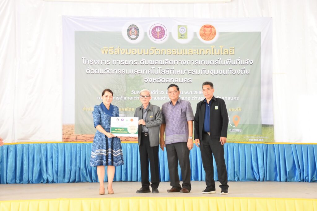 เมื่อวันที่ 22 มิถุนายน 2566 สำนักงานการวิจัยแห่งชาติ (วช.) กระทรวงการอุดมศึกษา วิทยาศาสตร์ วิจัยและนวัตกรรม ร่วมกับ คณะกรรมาธิการการอุดมศึกษา วิทยาศาสตร์ วิจัยและนวัตกรรม วุฒิสภา,จังหวัดสกลนคร และมหาวิทยาลัยราชภัฏสกลนคร (มรภ.สกลนคร) จัดพิธีส่งมอบนวัตกรรมและเทคโนโลยี ในโครงการ “การยกระดับผลผลิตทางการเกษตรในพื้นที่แล้งด้วยนวัตกรรมและเทคโนโลยีที่เหมาะสมกับชุมชนท้องถิ่นจังหวัดสกลนคร” ให้แก่วิสาหกิจชุมชนต่างๆ ในพื้นที่จังหวัดสกลนคร เพื่อยกระดับผลผลิตทางการเกษตรในพื้นที่แล้งด้วยนวัตกรรมและเทคโนโลยีที่เหมาะสม โดยมี พล.อ.อ.ประจิน จั่นตอง ประธานคณะกรรมาธิการการอุดมศึกษา วิทยาศาสตร์ วิจัยและนวัตกรรม วุฒิสภา มอบหมายให้ รศ.ศักดิ์ไทย สุรกิจบวร รองประธานคณะอนุกรรมาธิการบูรณาการบริการวิชาการอุดมศึกษาฯ เป็นประธาน พร้อมนี้ ดร.วิภารัตน์ ดีอ่อง ผู้อำนวยการสำนักงานการวิจัยแห่งชาติ (ผอ.วช.) มอบหมายให้ นายธีรวัฒน์ บุญสม ผู้อำนวยการกองส่งเสริมและสนับสนุนการวิจัยและนวัตกรรม ร่วมการส่งมอบนวัตกรรมดังกล่าว และนางจุรีรัตน์ เทพอาสน์ ผู้ว่าราชการจังหวัดสกลนคร มอบหมายให้ นายกฤษฎิ์ โสมปัดทุม นายอำเภอเต่างอย เป็นผู้แทนรับมอบนวัตกรรม ทั้งนี้ ผศ.ชาคริต ชาญชิตปรีชา รักษาราชการแทนอธิการบดีมหาวิทยาลัยราชภัฏสกลนคร พร้อมด้วยผู้บริหารหน่วยงานต่างๆ ในพื้นที่ให้การต้อนรับ ณ ที่ว่าการอำเภอเต่างอย จังหวัดสกลนคร