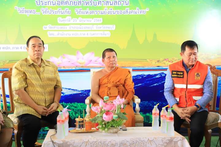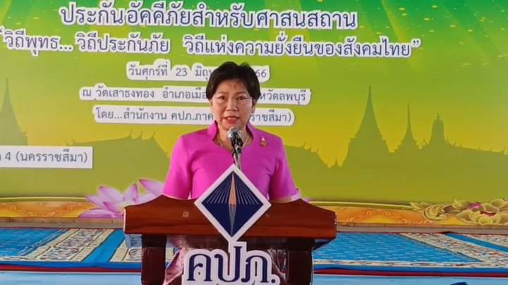วันที่ 23 มิถุนายน 2566 เวลา เวลา 9.00 น. ที่ศาลาอเนกประสงค์ วัดเสาธงทอง อำเภอเมือง จังหวัดลพบุรี นางเพชรรัตน์ เลิศรัตน์ รองผู้ว่าราชการจังหวัดลพบุรี เป็นประธานเปิด โครงการ 1 ภาค 1 ผลิตภัณฑ์ ประกันอัคคีภัยสำหรับศาสนสถาน“วิถีพุทธ…วิถีประกันภัย คือวิถีแห่งความยั่งยืนของสังคมไทย” โดยมี พระครูสิริจริยาภรณ์ เจ้าคณะอำเภอเมือง เจ้าอาวาสวัดเสาธงทอง จังหวัดลพบุรี เป็นประธานฝ่ายสงฆ์ และคณะสงฆ์ พร้อมด้วย นางสาวสุมาลี รัตนเรืองประทีป ผู้อำนวยการฝ่ายอาวุโส ฝ่ายยุทธศาสตร์การส่งเสริม นายไมตรี ชนูดหอม ผู้อำนวยการสำนักงาน คปภ. ภาค 4 (นครราชสีมา) หัวหน้าส่วนราชการ ไวยาวัจกร กรรมการวัด อพปร. ผู้นำชุมชน หน่วยกู้ภัยและผู้ที่เกี่ยวข้องจากหน่วยงานภาครัฐ จำนวน 150 คน เข้าร่วมโครงการ