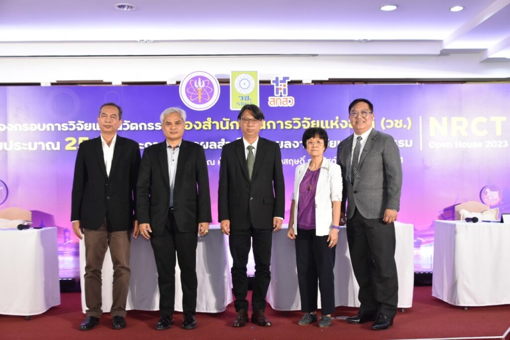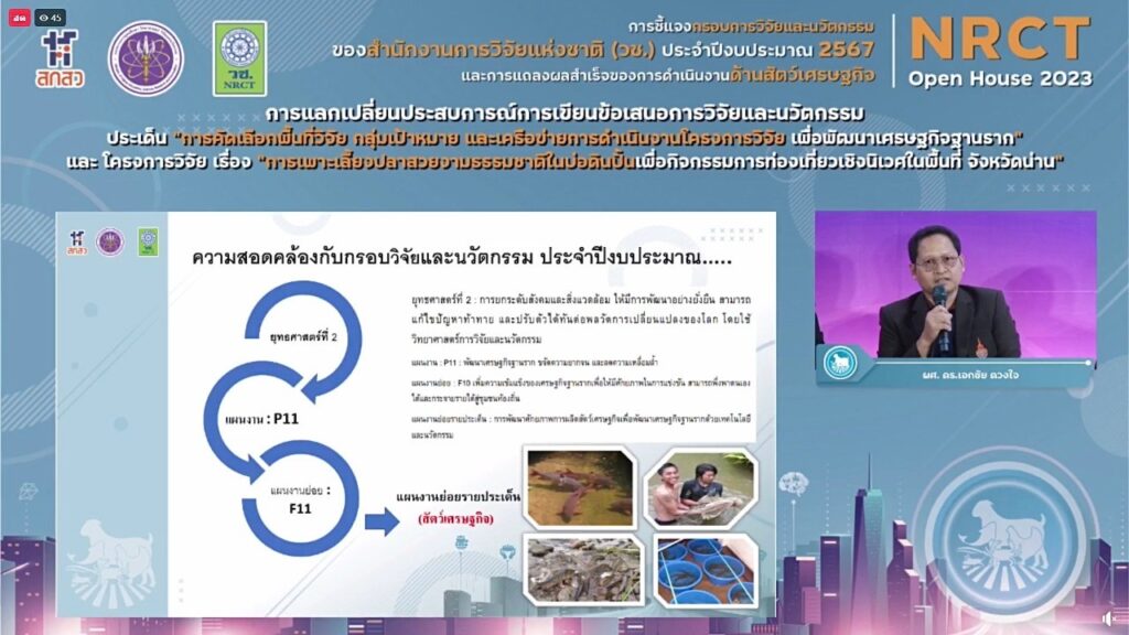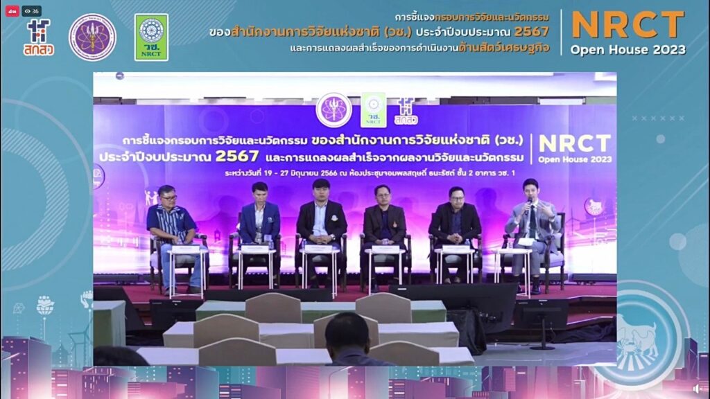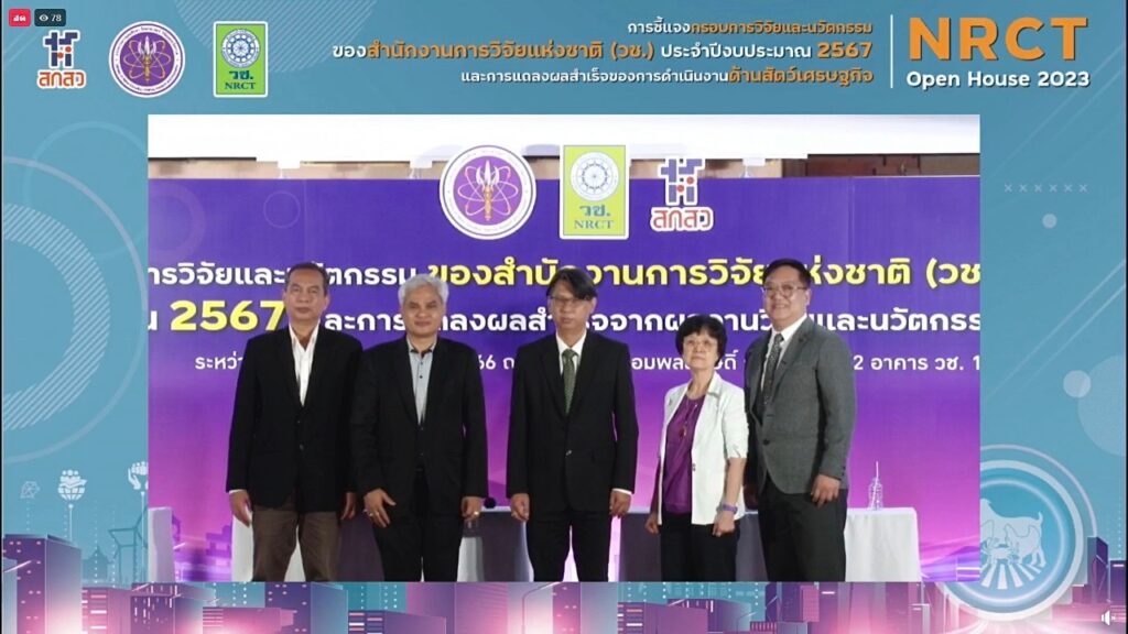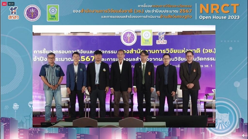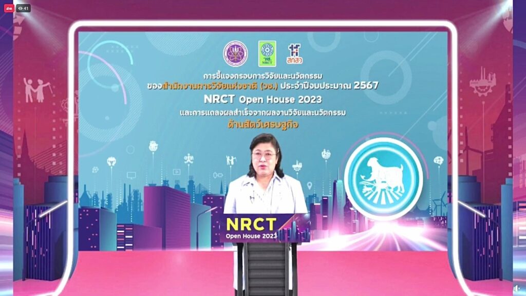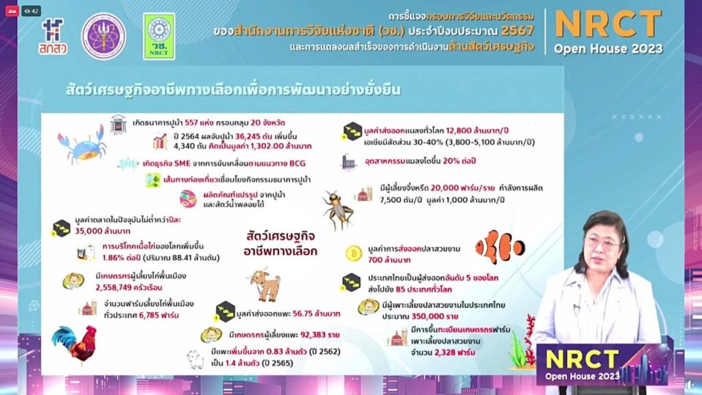ดร.วิภารัตน์ ดีอ่อง ผู้อำนวยการสำนักงานการวิจัยแห่งชาติ (ผอ.วช.) กล่าวว่า (วช.) ภายใต้กระทรวง (อว.) เป็นหน่วยงานหลักในการบริหารทุนวิจัยและนวัตกรรมของประเทศ โดยมุ่งเน้นผลสำเร็จจากการวิจัยที่สามารถนำไปใช้ประโยชน์ในมิติต่างๆ ทั้งมิติด้านวิชาการ ด้านเศรษฐกิจ ด้านสังคมและชุมชน และด้านนโยบาย เพื่อใช้เป็นกลไกในการพัฒนาและแก้ปัญหาเร่งด่วนสำคัญของประเทศ เพื่อให้บรรลุเป้าหมายการพัฒนาที่ยั่งยืน การจัดงานชี้แจงกรอบการวิจัยและนวัตกรรม ปี 2567 และการแถลงผลสำเร็จจากการวิจัยและนวัตกรรม NRCT Open House ระหว่างวันที่ 19–27 มิถุนายน 2566 ซึ่งในวันนี้เป็นวันที่ห้า จะเป็นด้านสัตว์เศรษฐกิจ การสร้างการรับรู้ รวมถึงการแนะนำการเขียนข้อเสนอทางการวิจัยในประเด็นด้านสัตว์เศรษฐกิจ เนื่องจากสถานการณ์ปัจจุบันการส่งออกสินค้าสัตว์เศรษฐกิจ ถือได้ว่าเป็นส่วนสำคัญในการขับเคลื่อนเศรษฐกิจของประเทศ จากการระบาดของเชื้อไวรัสโคโรนา หรือ โควิด-19 ส่งผลกระทบทำให้หลายธุรกิจปิดตัวลง เกิดการว่างงานและเดินทางกลับถิ่นฐานจากสถานการณ์ (วช.) จึงให้ความสำคัญในการสนับสนุนทุนวิจัยและนวัตกรรมด้านสัตว์เศรษฐกิจ โดยมุ่งเน้นสัตว์เศรษฐกิจอาชีพทางเลือกหรืออาชีพเสริม โดยคัดเลือกสัตว์เศรษฐกิจใหม่ที่มีขีดความสามารถในการแข่งขันสูง ต้นทุนต่ำ ในการส่งเสริมเป็นอาชีพทางเลือกหรืออาชีพเสริมให้เกษตรกร ได้แก่ ไก่พื้นเมืองและไก่ลูกผสมพื้นเมือง เป็นสัตว์ที่เกษตรเลี้ยงกว่า 2.5 ล้านครัวเรือน คิดเป็น 30% ของครัวเรือนเกษตรกร มีฟาร์มเลี้ยง 6,785 ฟาร์ม มูลค่าตลาดไม่ต่ำกว่าปีละ 35,000 ล้านบาท โดยความต้องการบริโภคของโลกเพิ่มขึ้น 1.86% ต่อปี จิ้งหรีด เป็นแหล่งโปรตีนสูงทางเลือกชนิดใหม่ของโลก การเติบโตของอุตสาหกรรม 20% ต่อปี ไทยมีผู้เลี้ยง 20,000 ฟาร์มหรือรายกำลังการผลิต 7,500 ตันต่อปี คิดเป็นมูลค่า 1,000 ล้านบาทต่อปี สัตว์น้ำ และพรรณไม้น้ำสวยงาม เป็นสัตว์ที่มีมูลค่าและสร้างรายได้สูง มีตลาดกว่า 85 ประเทศทั่วโลก มูลค่าการส่งออกไม่ต่ำกว่า 700 ล้านบาทต่อปี มีผู้เพาะเลี้ยงในไทย ประมาณ 350,000 ราย และฟาร์มที่ขึ้นทะเบียน 2,328 ฟาร์ม แพะ ความต้องการอาหารฮาลาลเพิ่มมากขึ้นในทุกๆ ปี และการผลิตไม่พอต่อความต้องการ ประเทศไทยส่งออกแพะคิดเป็นมูลค่า 56.75 ล้านบาทต่อปี มีเกษตรกรผู้เลี้ยงแพะ 92,383 ราย จากการสนับสนุนทุนวิจัยของ (วช.) ทำให้มีแพะเพิ่มขึ้นจาก 0.83 ล้านตัว (ปี 2562) เป็น 1.4 ล้านตัว (ปี 2565) ปูม้า เนื่องจากปริมาณปูม้าลดลงจากเดิมอย่างมาก ครม. มีมติให้ (วช.) เป็นเจ้าภาพในการขยายผลธนาคารปูม้าเพื่อ “คืนปูม้าสู่ทะเลไทย” ทำให้เก