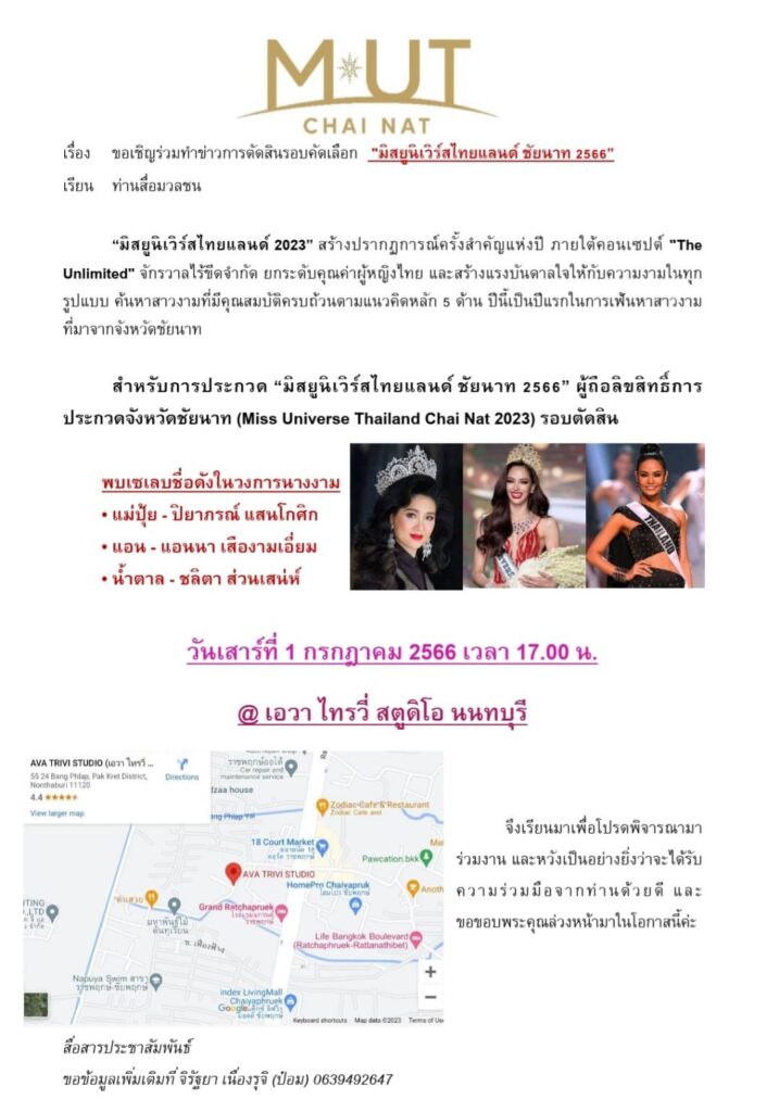 สำหรับเวทีการประกวดมิสยูนิเวิร์สไทยแลนด์ 2023 CD (City Directors) ผู้ถือลิขสิทธิ์การประกวด “มิสยูนิเวิร์สไทยแลนด์ ชัยนาท 2566” (Miss Universe Thailand