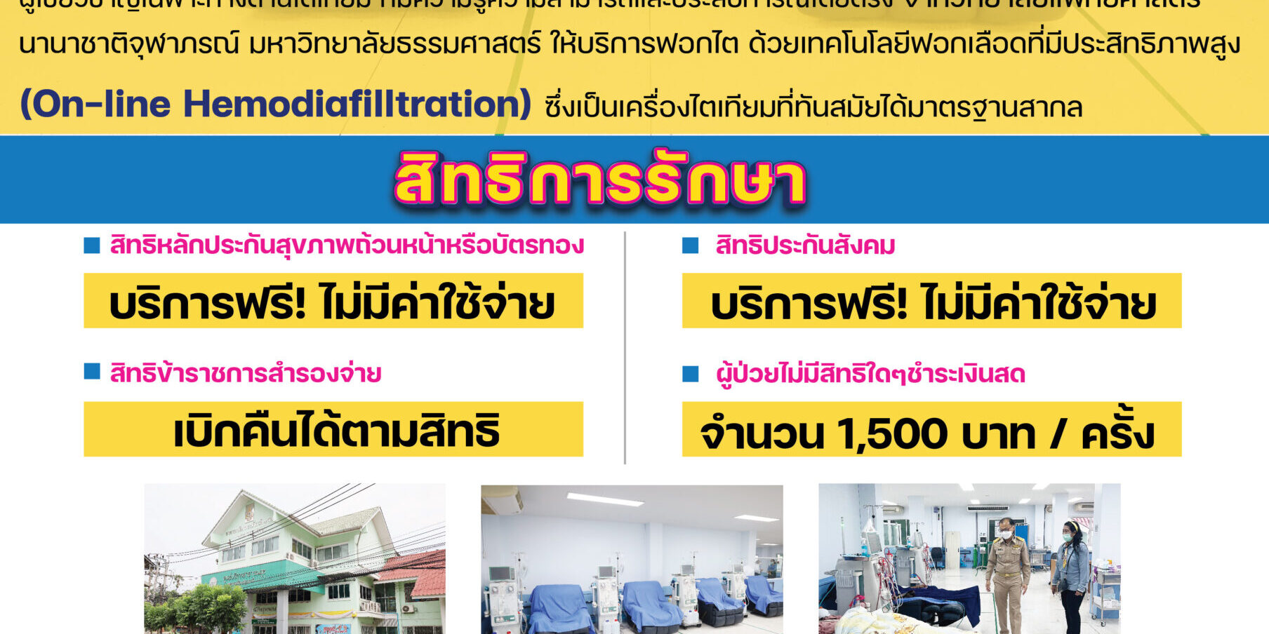 โดยมีทีมแพทย์และพยาบาล ผู้เชี่ยวชาญเฉพาะทางด้านไตเทียมที่มีความรู้ความสามารถ และประสบการณ์โดยตรง จากวิทยาลัยแพทย์ศาสตร์นานาชาติจุฬาภรณ์ มหาวิทยาลัยธรรมศาสตร์ ให้บริการฟอกไต ด้วยเทคโนโลยีฟอกเลือดที่มีประสิทธิภาพสูง รับทุกสิทธิการรักษา สิทธิหลักประกันสุขภาพถ้วนหน้าหรือบัตรทอง สิทธิประกันสังคม บริการฟรีไม่มีค่าใช้จ่ายสิทธิข้าราชการ สำรองจ่าย เบิกคืนได้ตามสิทธิผู้ไม่มีสิทธิใดๆชำระเงินสด จำนวน 1,500 บาทต่อครั้ง เปิดให้บริการ วันจันทร์-วันเสาร์ วันละ 3 รอบ ตั้งแต่เวลา 06.00 น.- 18.00 น. รอบที่ 1 เวลา 06.00 น.รอบที่ 2 เวลา 10.00 น. รอบที่ 3 เวลา 14.00 น.