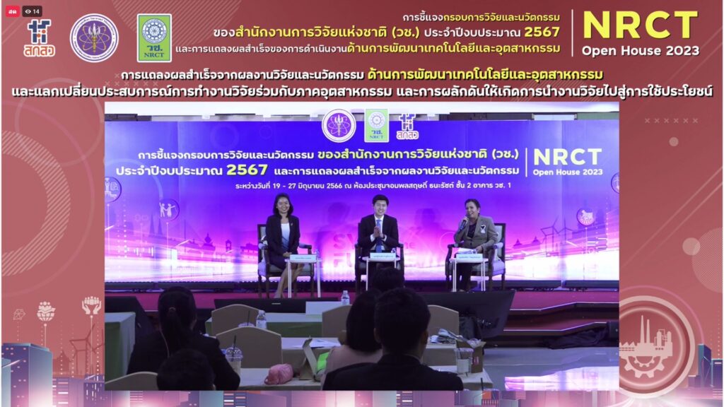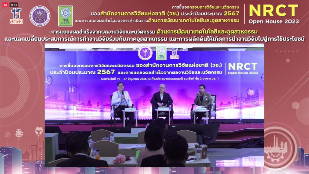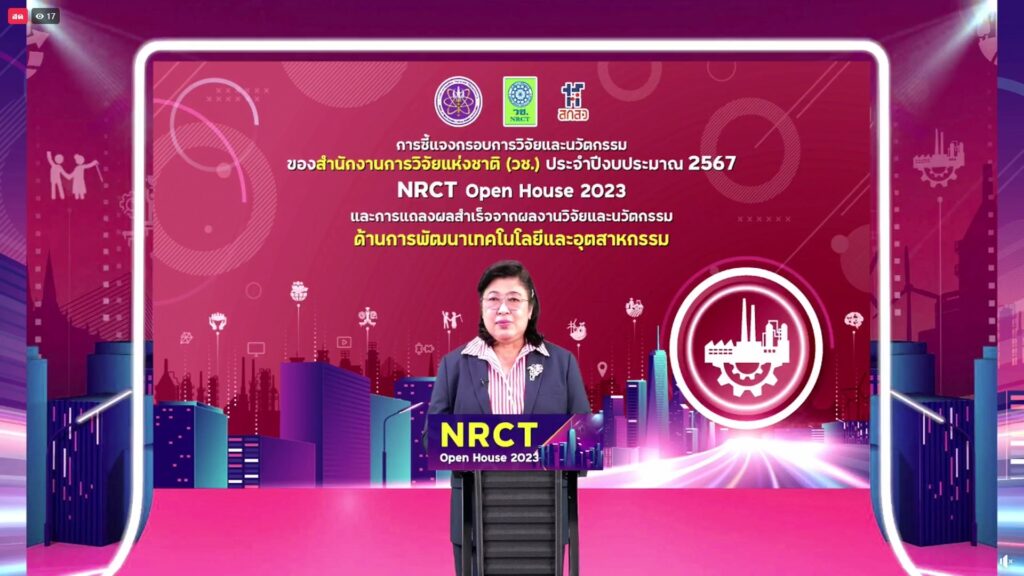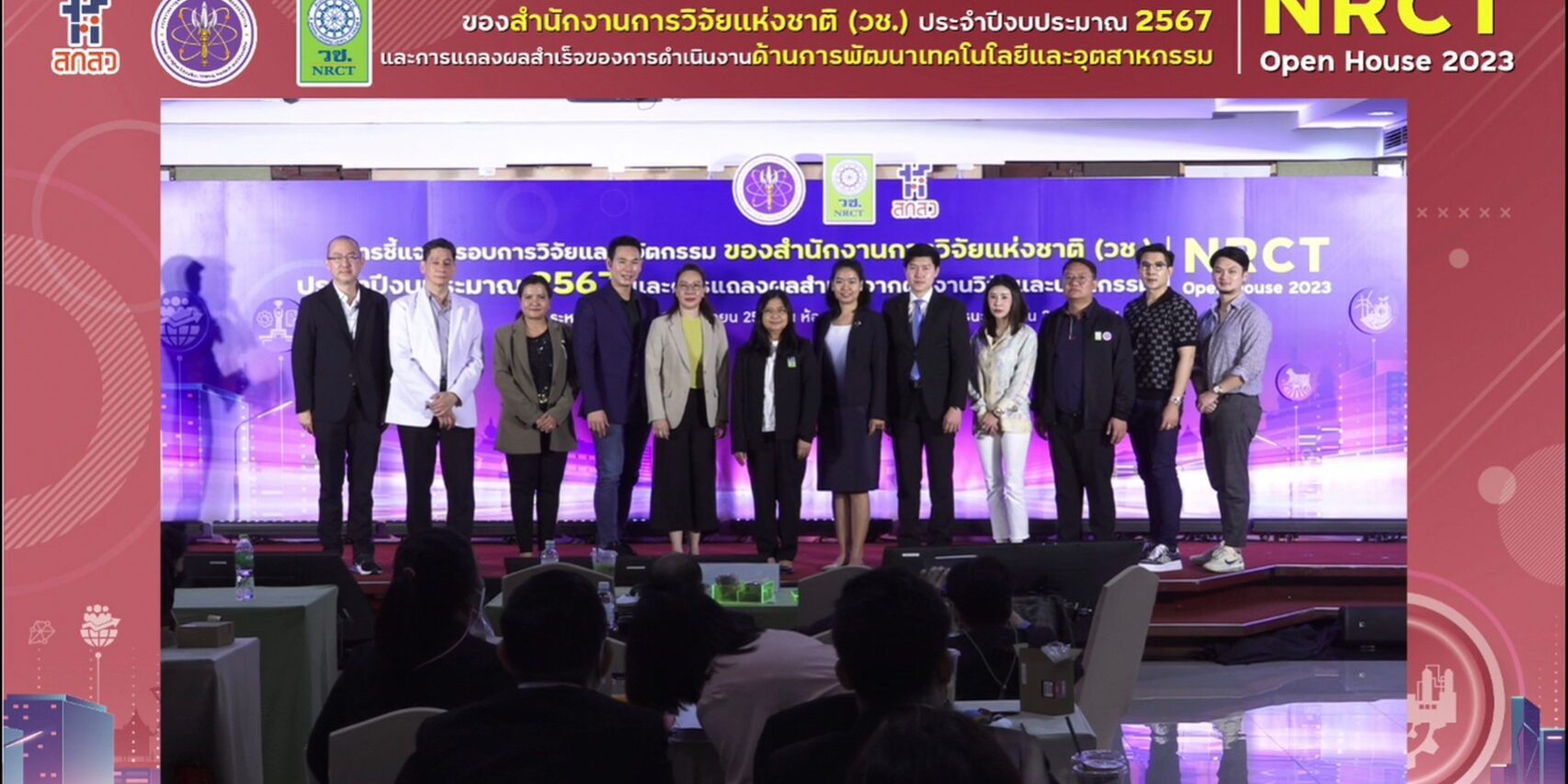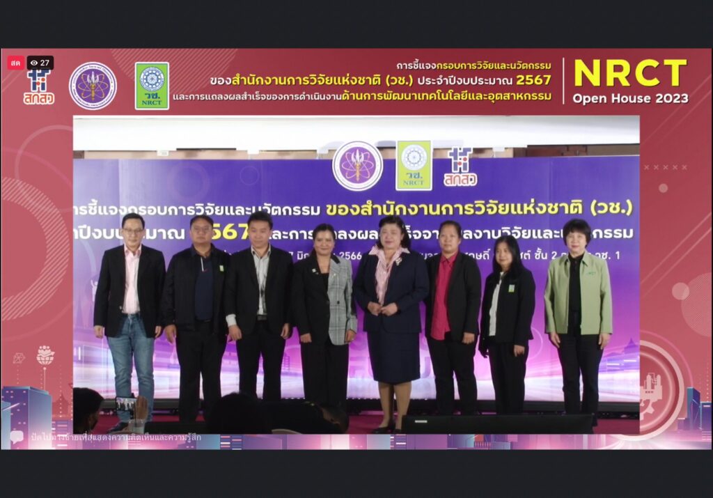 เมื่อวันที่ 25 มิถุนายน 2566 : สำนักงานการวิจัยแห่งชาติ (วช.) กระทรวงการอุดมศึกษา วิทยาศาสตร์ วิจัยและนวัตกรรม (อว.) จัดการประชุมชี้แจงกรอบการวิจัยและนวัตกรรม ประจำปีงบประมาณ 2567 และแถลงผลสำเร็จจากการวิจัยและนวัตกรรม NRCT Open House 2023 โดยมี ดร.วิภารัตน์ ดีอ่อง ผู้อำนวยการสำนักงานการวิจัยแห่งชาติ (ผอ.วช.) เป็นประธานเปิดการประชุมฯ เพื่อประชาสัมพันธ์เกี่ยวกับการรับข้อเสนอการวิจัยและนวัตกรรม และกรอบการวิจัยและนวัตกรรมที่ (วช.) ให้การสนับสนุนทุนการวิจัยและนวัตกรรม ประจำปีงบประมาณ 2567 ซึ่งกิจกรรมดังกล่าว จัดขึ้นระหว่างวันที่ 19 – 27 มิถุนายน 2566 ในรูปแบบ onsite ณ ห้องจอมพลสฤษดิ์ ธนะรัชต์ ณ อาคาร วช.1 และในรูปแบบออนไลน์ผ่าน (VDO Conference) ด้วยระบบ Zoom การถ่ายทอดสด (Live Streaming) ผ่านช่องทางออนไลน์ Facebook ของสำนักงานการวิจัยแห่งชาติ ซึ่งกิจกรรมในวันนี้จัดขึ้นเป็นวันที่ 7 ใน “ด้านการพัฒนาเทคโนโลยีและอุตสาหกรรม”