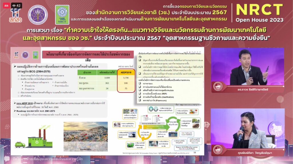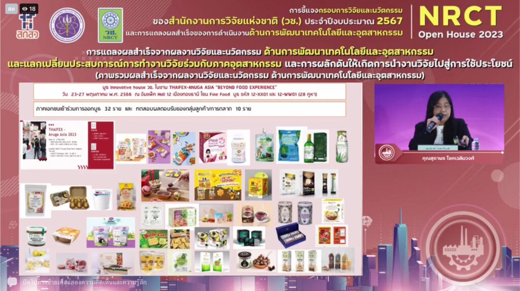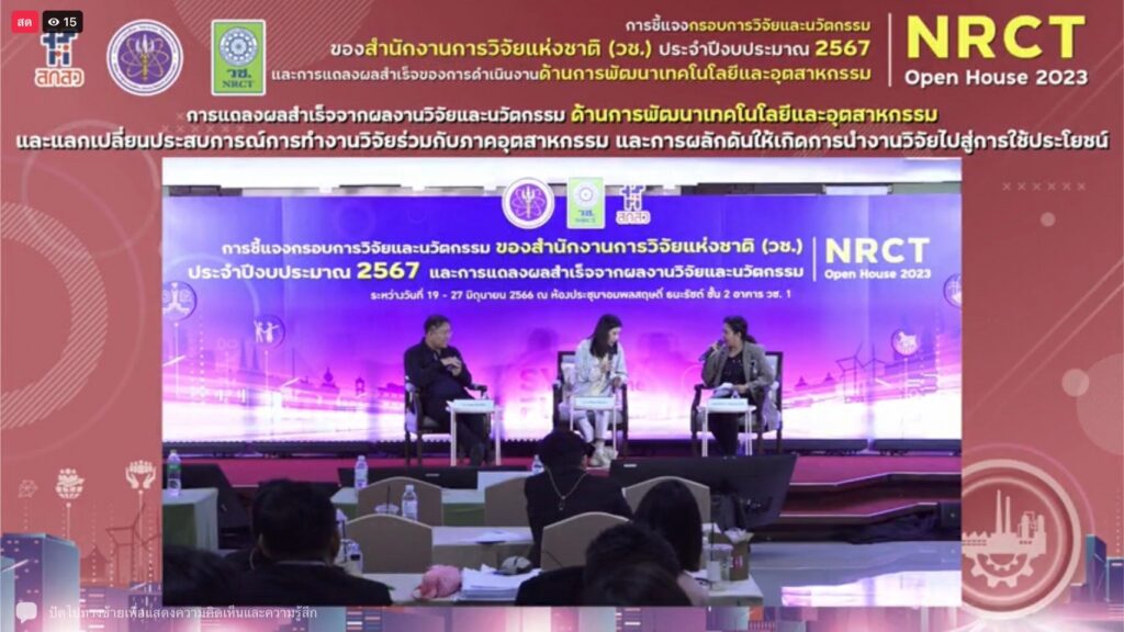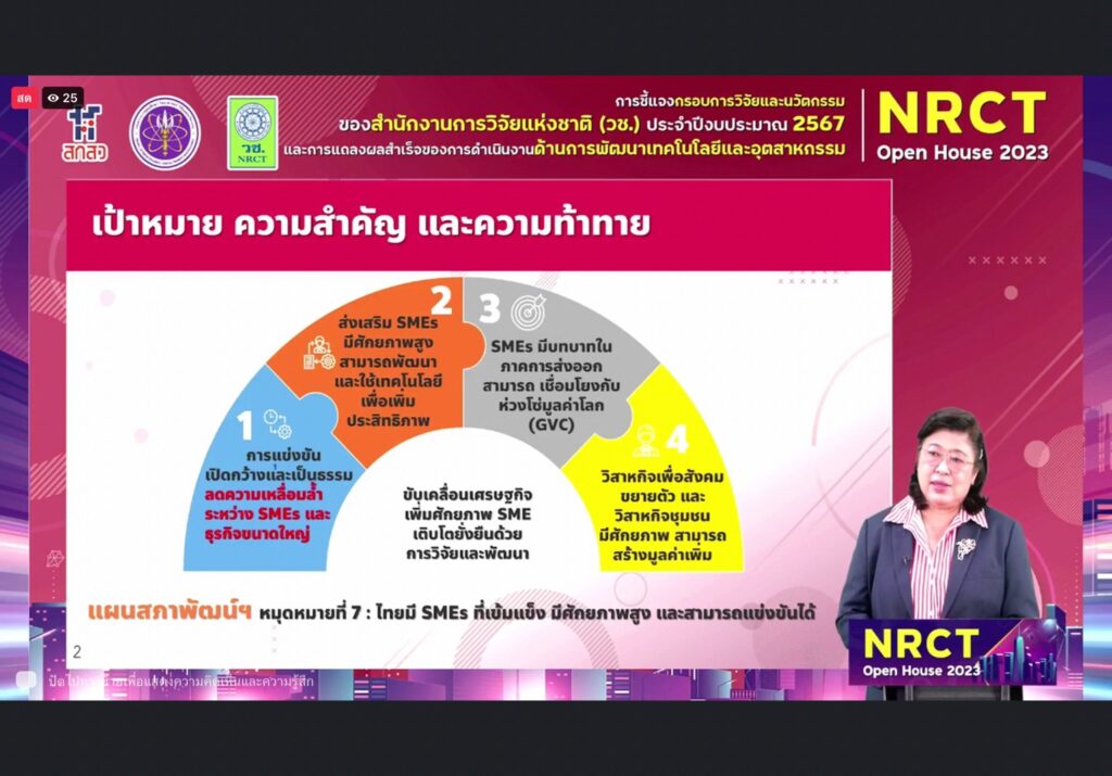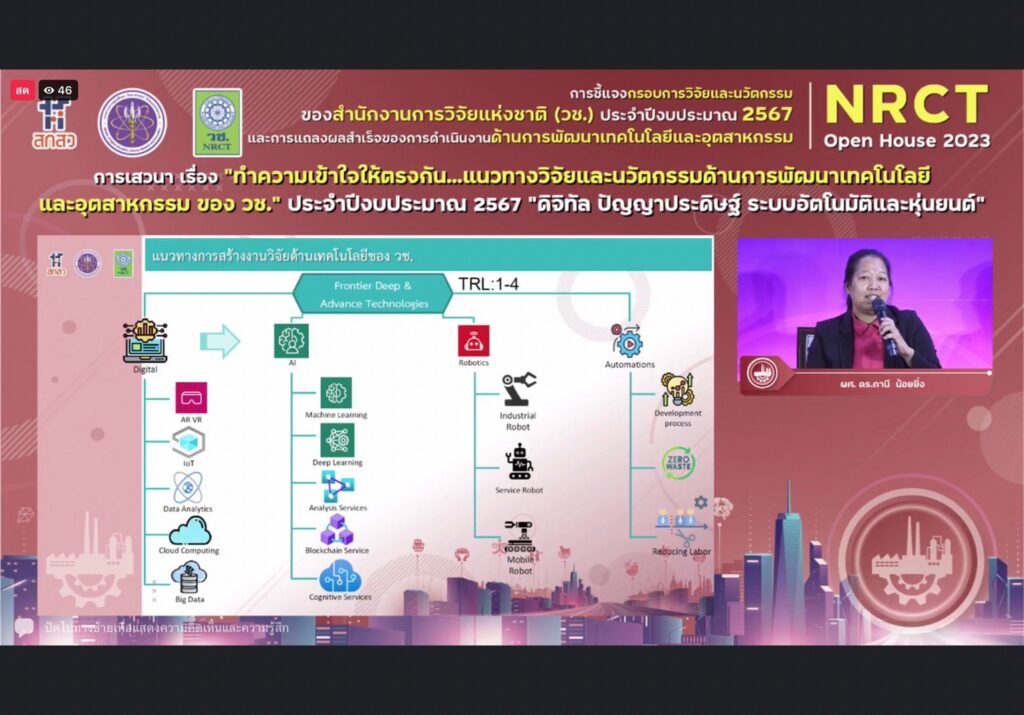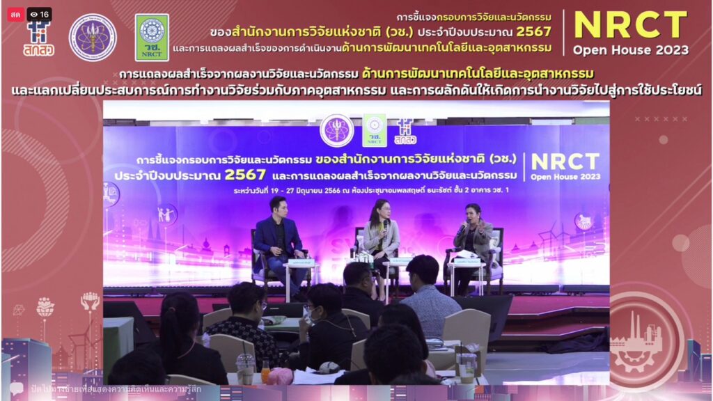 เมื่อวันที่ 25 มิถุนายน 2566 : สำนักงานการวิจัยแห่งชาติ (วช.) กระทรวงการอุดมศึกษา วิทยาศาสตร์ วิจัยและนวัตกรรม (อว.) จัดการประชุมชี้แจงกรอบการวิจัยและนวัตกรรม ประจำปีงบประมาณ 2567 และแถลงผลสำเร็จจากการวิจัยและนวัตกรรม NRCT Open House 2023 โดยมี ดร.วิภารัตน์ ดีอ่อง ผู้อำนวยการสำนักงานการวิจัยแห่งชาติ (ผอ.วช.) เป็นประธานเปิดการประชุมฯ เพื่อประชาสัมพันธ์เกี่ยวกับการรับข้อเสนอการวิจัยและนวัตกรรม และกรอบการวิจัยและนวัตกรรมที่ (วช.) ให้การสนับสนุนทุนการวิจัยและนวัตกรรม ประจำปีงบประมาณ 2567 ซึ่งกิจกรรมดังกล่าว จัดขึ้นระหว่างวันที่ 19 – 27 มิถุนายน 2566 ในรูปแบบ onsite ณ ห้องจอมพลสฤษดิ์ ธนะรัชต์ ณ อาคาร วช.1 และในรูปแบบออนไลน์ผ่าน (VDO Conference) ด้วยระบบ Zoom การถ่ายทอดสด (Live Streaming) ผ่านช่องทางออนไลน์ Facebook ของสำนักงานการวิจัยแห่งชาติ ซึ่งกิจกรรมในวันนี้จัดขึ้นเป็นวันที่ 7 ใน “ด้านการพัฒนาเทคโนโลยีและอุตสาหกรรม”