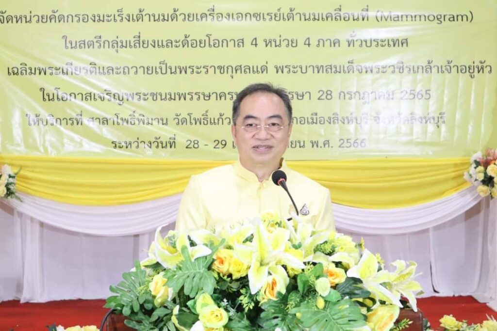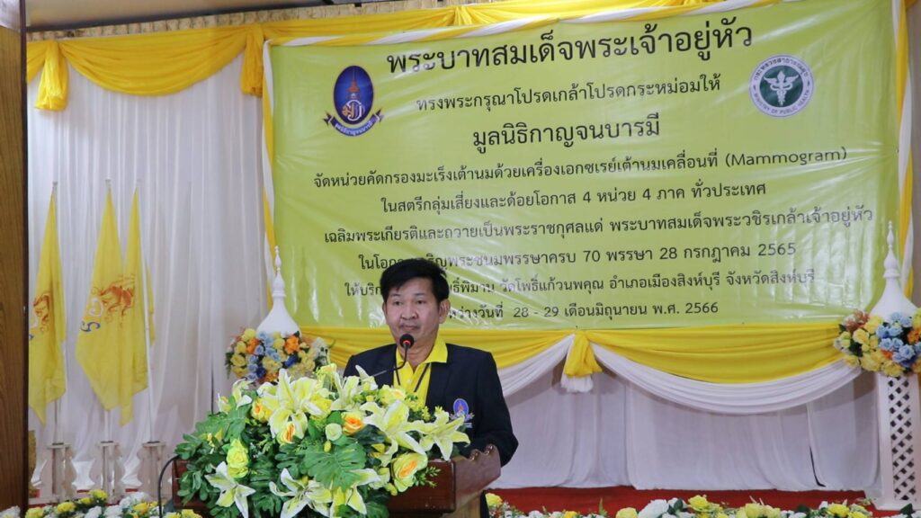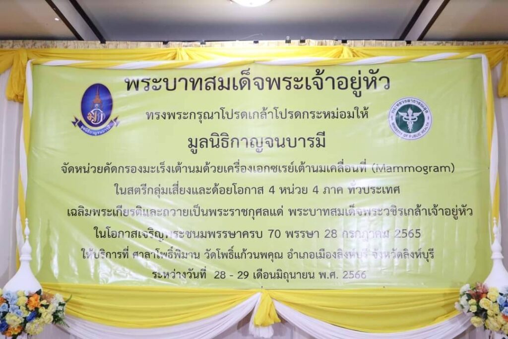 วันที่ 28 มิถุนายน 2566 เวลา 9.00 น.นายสุพจน์ ยศสิงห์คำ ผู้ว่าราชการจังหวัดสิงห์บุรี เป็นประธานเปิดกิจกรรมโครงการคัดกรองมะเร็งเต้านมโดยเครื่องเอกซเรย์เต้านมเคลื่อนที่ Mammogram ในสตรีกลุ่มเสี่ยงและด้อยโอกาส 4 หน่วย 4 ภาค ทั่วประเทศ เฉลิมพระเกียรติและถวายเป็นพระราชกุศลแด่พระบาทสมเด็จพระวชิรเกล้าเจ้าอยู่หัวในโอกาสเจริญพระชนมพรรษาครบ 70 พรรษา 28 กรกฏาคม 2565 ณ ศาลาโพธิ์พิมาน วัดโพธิ์แก้วนพคุณ จังหวัดสิงห์บุรี โดย นายแพทย์โชคชัย สาครพานิช นายแพทย์สาธารณสุขจังหวัดสิงห์บุรี ร่วมกับนายแพทย์ผดุงสิทธิ์ ละมัยเกศ มูลนิธิกาญจนบารมี จัดกิจกรรมในระหว่างวันที่ 28-29 มิถุนายน 2566 ณ ศาลาโพธิ์พิมาน วัดโพธิ์แก้วนพคุณ อำเภอเมืองสิงห์บุรีและในวันที่ 30 มิถุนายน 2566 ณ หอประชุมอำเภออินทร์บุรี