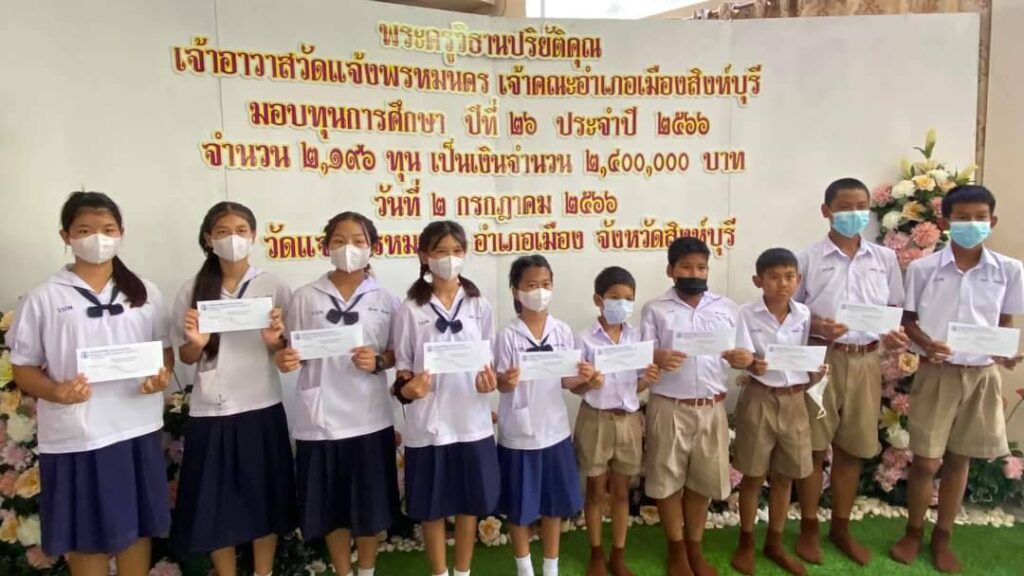 ทุนการศึกษาที่มอบให้กับโรงเรียนในเขตจังหวัดสิงห์บุรี จังหวัดลพบุรีจังหวัดเพชรบูรณ์จังหวัดอ่างทองจังหวัดชัยนาทจังหวัดสุพรรณบุรีจังหวัดนครสวรรค์จังหวัดอุทัยธานีและจังหวัดนครพนม ในการนี้ นายวิทยา ยางสุดผู้อำนวยการสำนักงานเขตพื้นที่การศึกษาประถมศึกษาสิงห์บุรี นางเกตุชญา วงศ์เพิก นางสาวกุลธิดา อ่อนมี รองผู้อำนวยการ สำนักงานเขตพื้นที่การศึกษาประถมศึกษาสิงห์บุรีพร้อมคณะ ได้ถวายโล่ประกาศเกียติรคุณ พร้อมเกียรติบัตร แด่พระครูวิธานปริยัติคุณ เจ้าอาวาสวัดแจ้งพรหมนคร เจ้าคณะอำเภอเมืองสิงห์บุรี ได้มอบทุนการศึกษา ให้โรงเรียนในสังกัด ๙๐ โรงเรียนจำนวน ๗๙๗ ทุน จำนวนเงิน ๔๐๕,๕๐๐ บาท( สี่แสนห้าพันห้าร้อยบาทถ้วน) และมอบกองทุนปันน้ำใจ สพป. สิงห์บุรี เป็นจำนวนเงิน ๑๐,๐๐๐ บาท (หนึ่งหมื่นบาทถ้วน)และ สำนักงานเขตพื้นที่การศึกษามัธยมศึกษา สิงห์บุรีอ่างทอง นายสุรินทร์ นามอยู่ และนางขวัญพัฒน์ พรมดอนกลอย รองผู้อำนวยการสำนักงานเขตพื้นที่การศึกษามัธยมศึกษาสิงห์บุรี อ่างทองพร้อมคณะได้ถวายโล่ประกาศเกียรติคุณ ที่ได้มอบทุนการศึกษาให้โรงเรียนในสังกัด สพม. สิงห์บุรี อ่างทอง