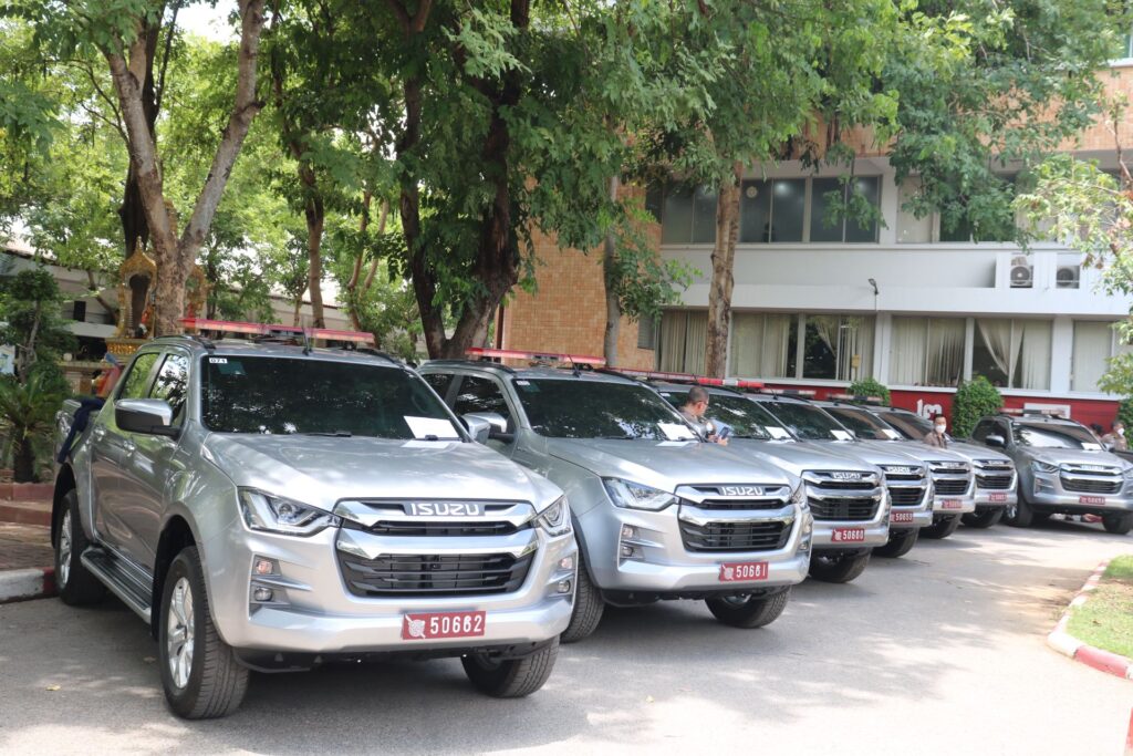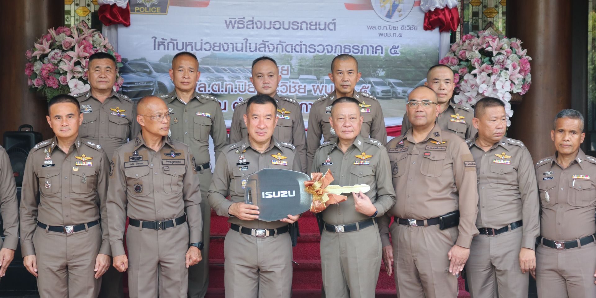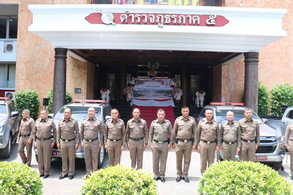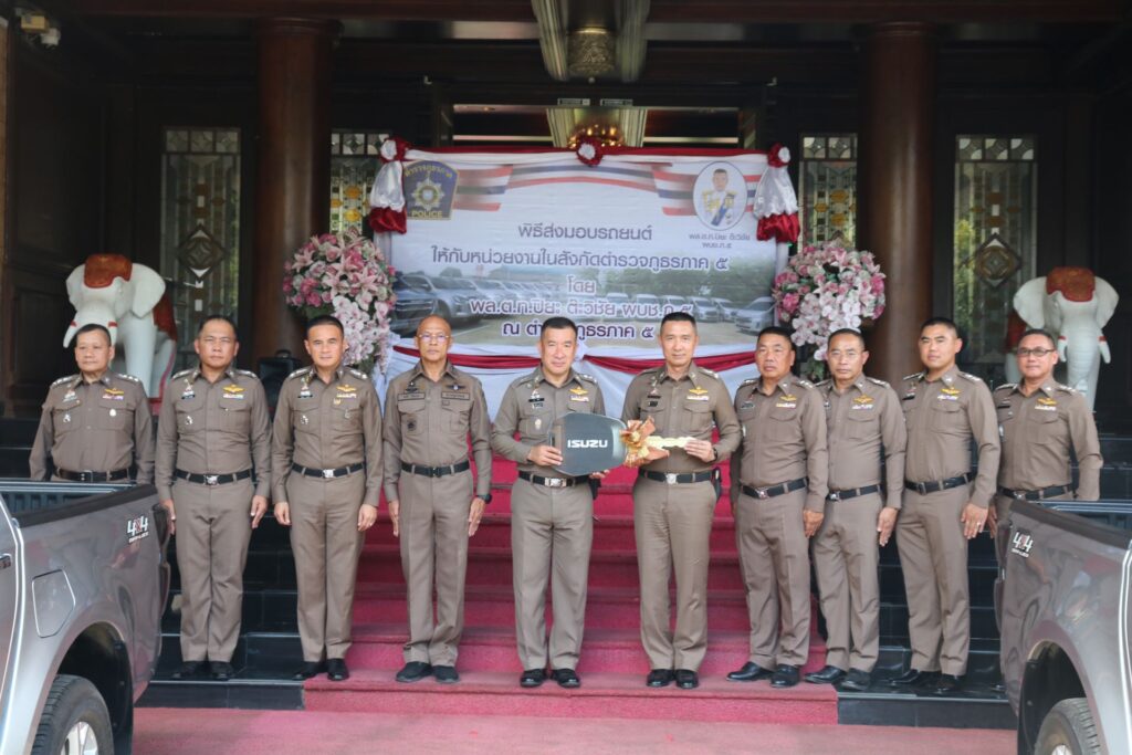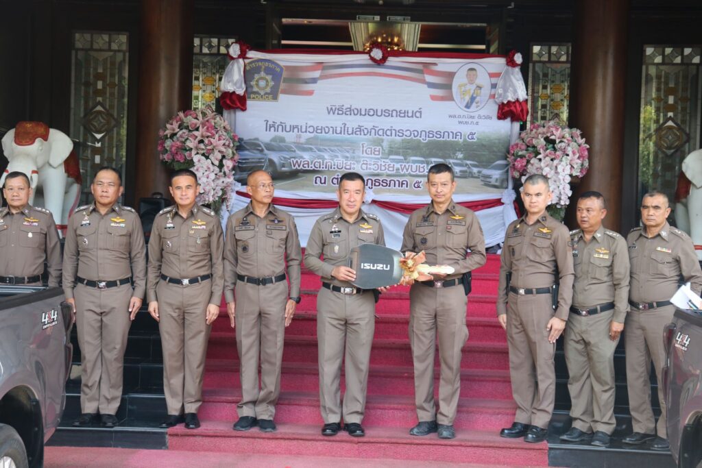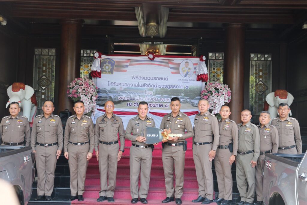 พล.ต.ท.ปิยะ ต๊ะวิชัย ผบช.ภ.5 ,พล.ต.ท.ธนธัช น้อยนาค ผทค.พิเศษ ตร.ปฏิบัติราชการ รอง ผบช.ภ.5 ,พล.ต.ต.วีรชน บุญทวี รอง ผบช.ภ.5 และ พล.ต.ต.มานพ เสนากูล ผบก.อก.ภ.5 พิธีส่งมอบรถยนต์กระบะขับเคลื่อน 4 ล้อ จำนวน 21 คัน รถตู้ จำนวน 6 คัน ให้กับหน่วยงานในสังกัดตำรวจภูธรภาค 5 ประกอบด้วย ภ.จว.เชียงใหม่ ,ภ.จว.เชียงราย ,ภ.จว.น่าน และ ภ.จว.แม่ฮ่องสอน ซึ่งมีภูมิประเทศเป็นภูเขาสูง การเดินทางยากลำบาก โดยรถยนต์ดังกล่าว พล.ต.ท.ปิยะ ต๊ะวิชัย ผบช.ภ.5 เป็นผู้ประสานขอรับการสนับสนุนจากสำนักงานตำรวจแห่งชาติ เพื่อนำมาให้กับสถานีตำรวจในสังกัด ภ.5 ณ ตำรวจภูธรภาค 5 อ.เมืองเชียงใหม่