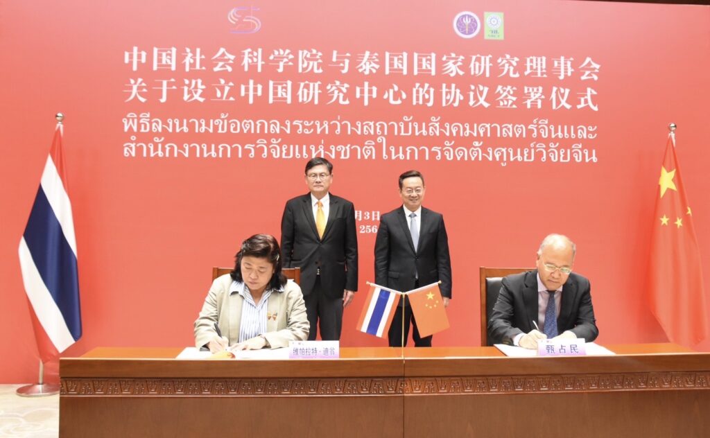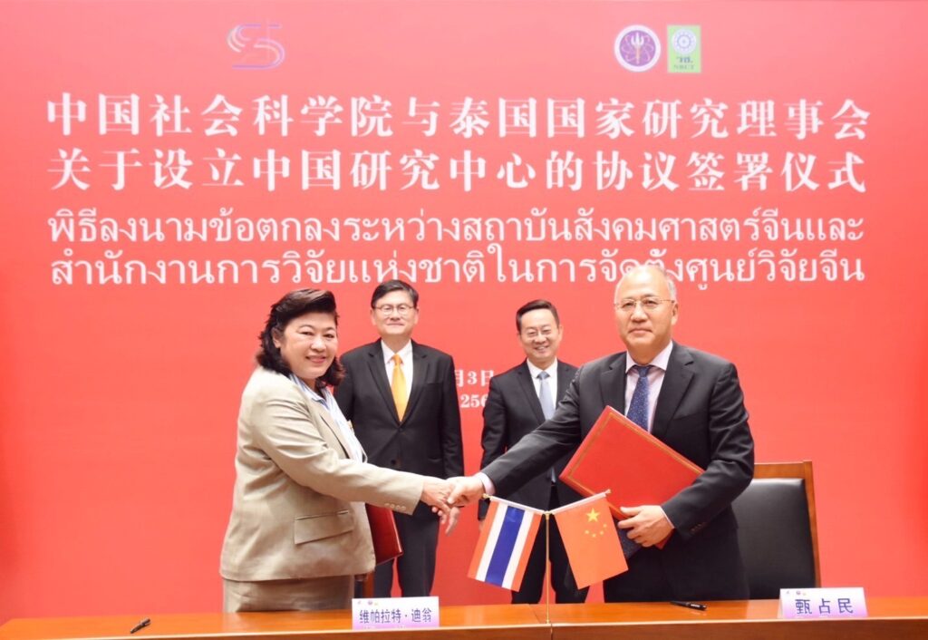 จากความสำเร็จของการประชุม Think Tank Forum ครั้งที่ 3 ที่จัดขึ้นเมื่อวันที่ 30 มิถุนายน 2566 ณ สถาบันสังคมศาสตร์จีน (Chinese Academy of Social Sciences,CASS) ต่อมาเมื่อวันที่ 3 กรกฎาคม 2566 ได้มีพิธีลงนามการจัดตั้ง “ศูนย์วิจัยจีน สำนักงานการวิจัยแห่งชาติ สถาบันสังคมศาสตร์จีน (CASS-NRCT Centre of China Studies) ณ สำนักงานการวิจัยแห่งชาติ” โดยมี ดร.วิภารัตน์ ดีอ่อง ผู้อำนวยการสำนักงานการวิจัยแห่งชาติ (ผอ.วช.) และ Mr. Zhen Zhanmin รองประธานสถาบันสังคมศาสตร์จีน (CASS) เป็นผู้ลงนามฝ่ายไทยและฝ่ายจีนตามลำดับ ณ สถาบันวิจัยประวัติศาสตร์ (Chinese Academy of History, CAH),CASS กรุงปักกิ่ง สาธารณรัฐประชาชนจีน นอกจากนี้ ศาสตราจารย์(พิเศษ) ดร.เอนก เหล่าธรรมทัศน์ รัฐมนตรีว่าการกระทรวงการอุดมศึกษา วิทยาศาสตร์ วิจัยและนวัตกรรม (อว.) ได้ให้เกียรติเข้าร่วมและเป็นสักขีพยานร่วมกับ