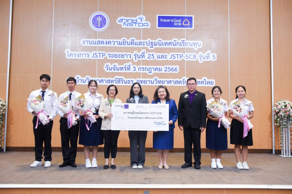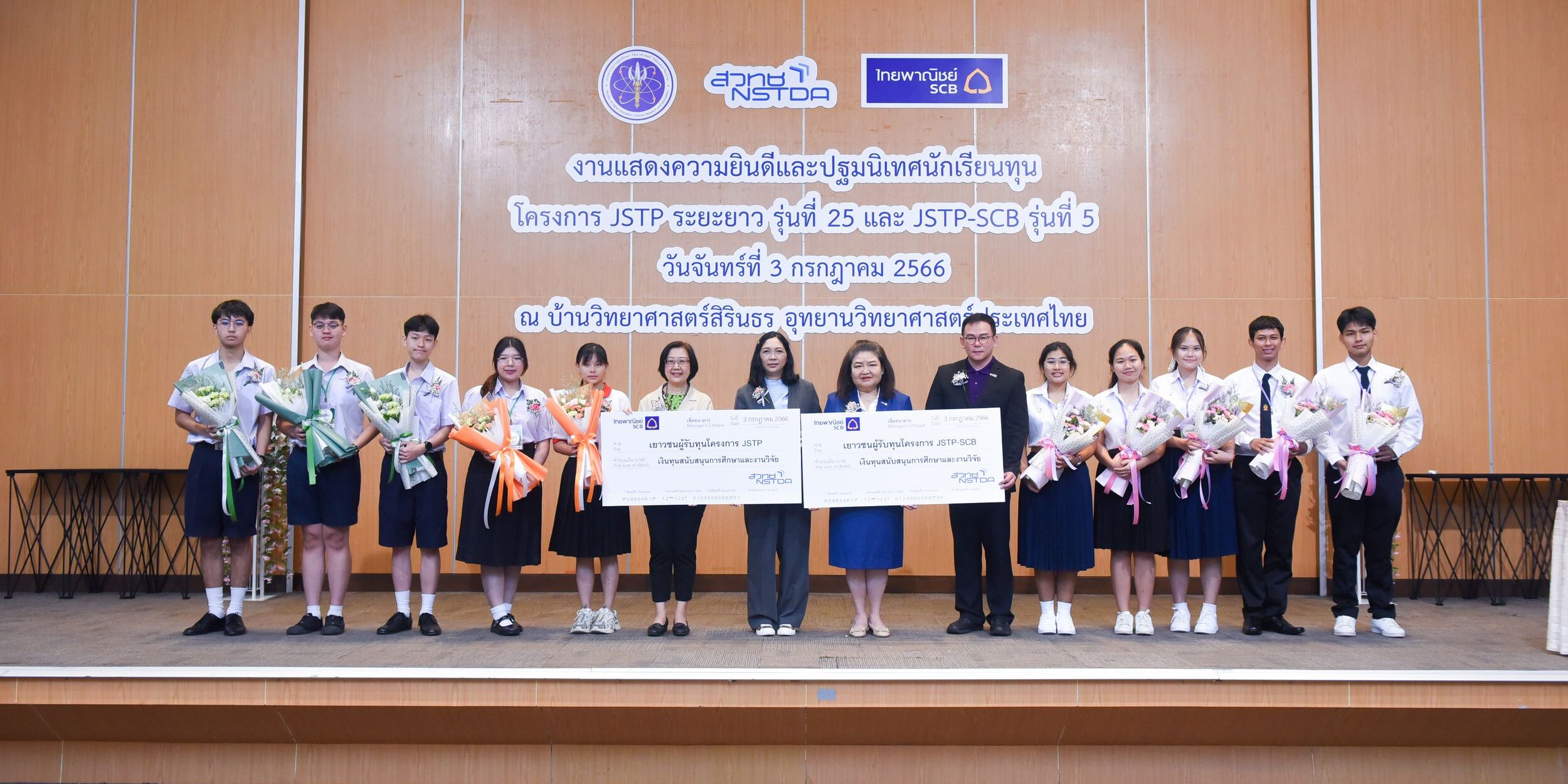 เมื่อวันที่ 3 กรกฎาคม 2566 ณ บ้านวิทยาศาสตร์สิรินธร อุทยานวิทยาศาสตร์ประเทศไทย จ.ปทุมธานี: สำนักงานพัฒนาวิทยาศาสตร์และเทคโนโลยีแห่งชาติ (สวทช.) โดยฝ่ายส่งเสริมและพัฒนาเด็กและเยาวชนที่มีศักยภาพสูง จัดพิธีแสดงความยินดีและปฐมนิเทศนักเรียนทุนโครงการพัฒนาอัจฉริยภาพทางวิทยาศาสตร์และเทคโนโลยีสำหรับเด็กและเยาวชน (Junior Science Talent Project : JSTP) ระยะยาวรุ่นที่ 25 และ JSTP-SCB รุ่นที่ 5 โดยสนับสนุนทุนการศึกษาและทุนวิจัยให้แก่เด็กและเยาวชนที่มีศักยภาพทางวิทยาศาสตร์ ที่ได้รับการคัดเลือก จนจบการศึกษาในระดับปริญญาเอกจากสถาบันการศึกษาในประเทศ และดำเนินโครงการสนับสนุนนักเรียนที่มีศักยภาพสูงเพื่อรับการบ่มเพาะผ่านกิจกรรมของโครงการพัฒนาอัจฉริยภาพทางวิทยาศาสตร์และเทคโนโลยีเพื่อเข้าสู่อาชีพวิจัย ภายใต้การสนับสนุนจากธนาคารไทยพาณิชย์ จำกัด (มหาชน) (JSTP-SCB) โดยหลังจากกิจกรรมปฐมนิเทศแล้ว เยาวชนทั้งหมดจะได้เดินทางไปเข้าร่วมกิจกรรม ณ ศูนย์ฝึกอบรมธนาคารไทยพาณิชย์ หาดตะวันรอน จ.ชลบุรี วันที่ 3 -5 กรกฎาคม 2566 โดยวิทยากรจากธนาคารไทยพาณิชย์ จะมาให้ความรู้ที่เป็นประโยชน์ต่อเยาวชนในเรื่อง “ความรู้ทางการเงินและการวางแผนทางการเงิน และการจัดการสินทรัพย์” พร้อมด้วยกิจกรรมทัศนศึกษาแหล่งเรียนรู้ธรรมชาติ อีกด้วย