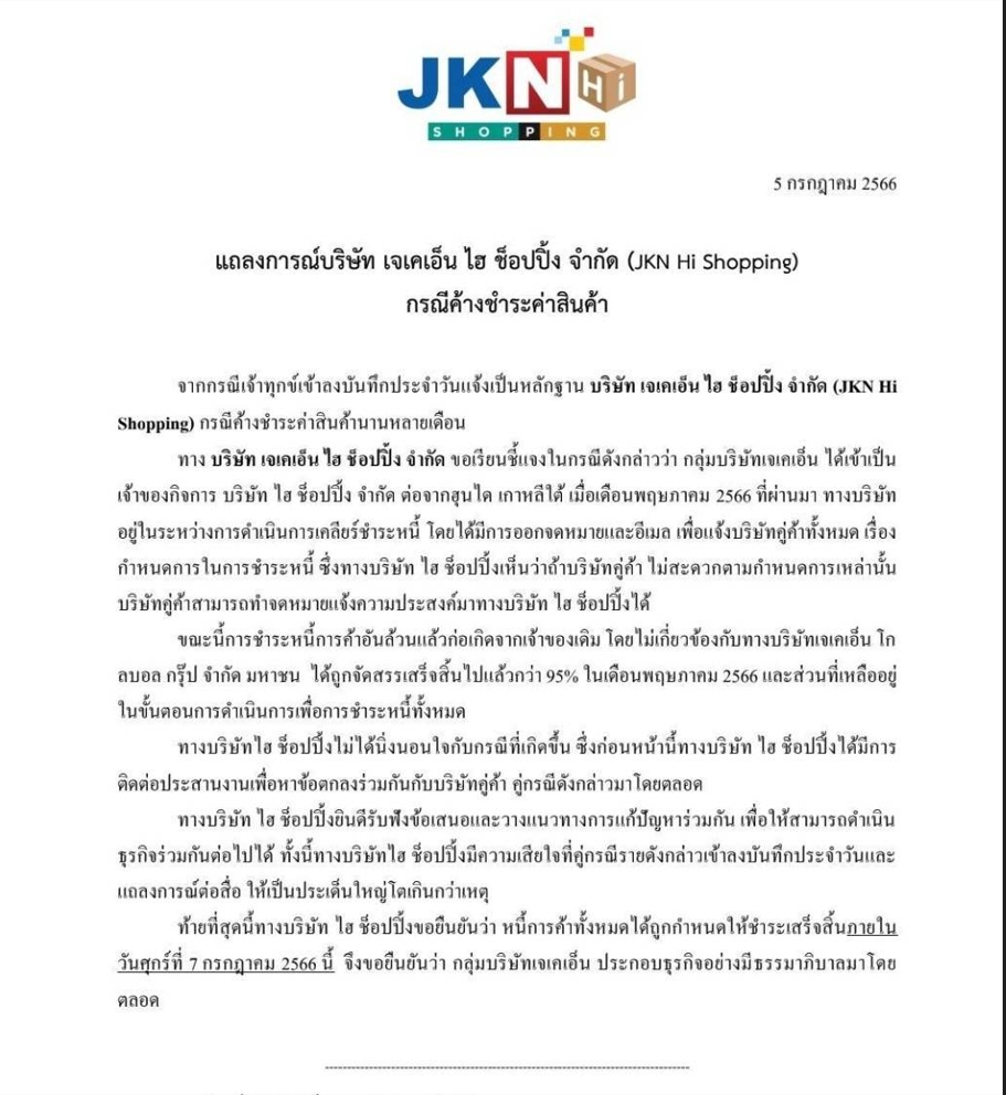 JKN ร่อนหนังสือชี้แจงกรณีค้างชำระค่าสินค้า เผยเป็นหนี้เก่าของฝั่งไฮ ช็อปปิ้ง พร้อมย้ำชำระหนี้เสร็จสิ้นภายในวันศุกร์ที่ 7 กรกฎาคม 2566 แน่