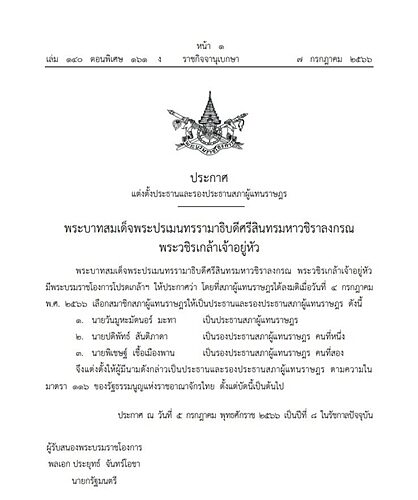 วันที่ 7 ก.ค.2566 ผู้สื่อข่าวรายงานว่า เว็บไซต์ ราชกิจจานุเบกษา เผยแพร่ประกาศแต่งตั้งประธานและรองประธานสภาผู้แทนราษฎร โดยมี พล.อ.ประยุทธ์ จันทร์โอชา นายกรัฐมนตรี เป็นผู้รับสนองพระบรมราชโองการ
