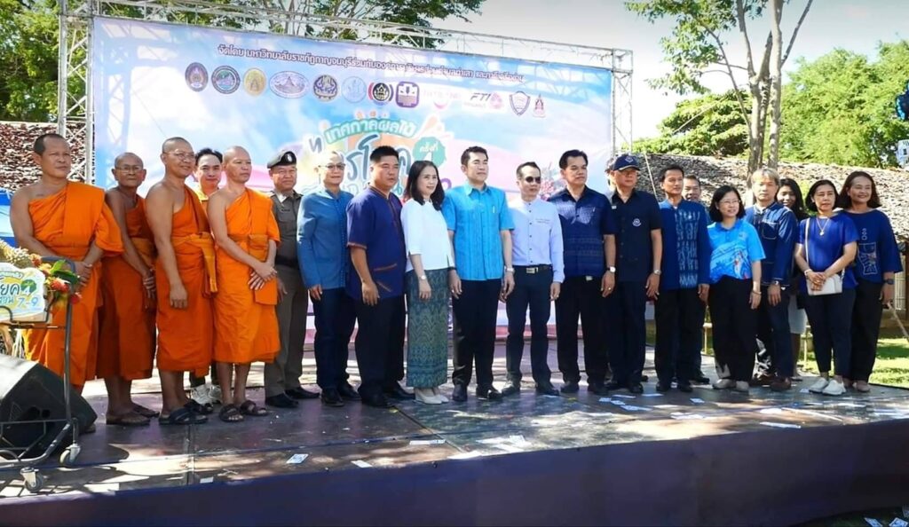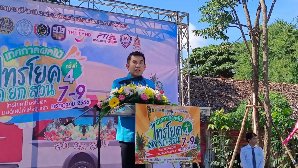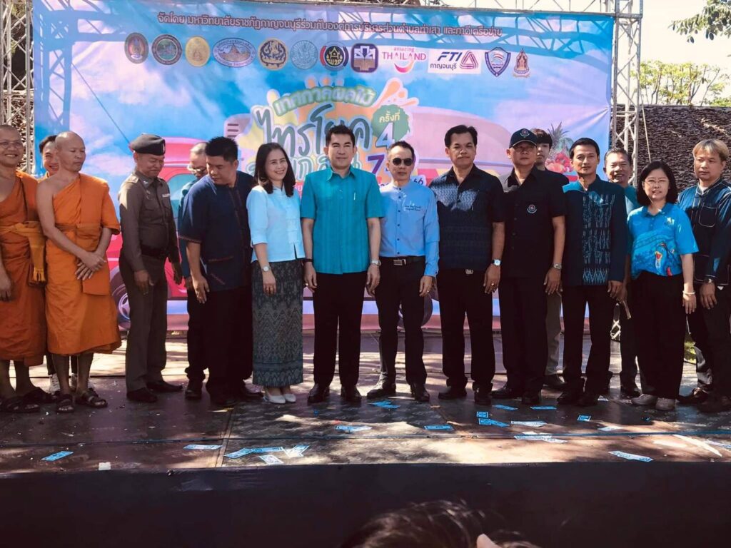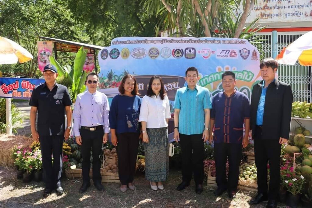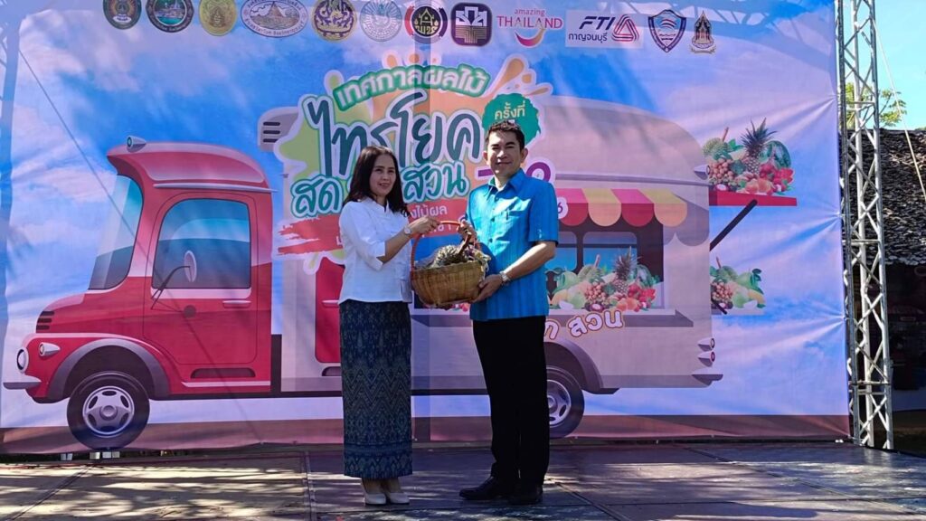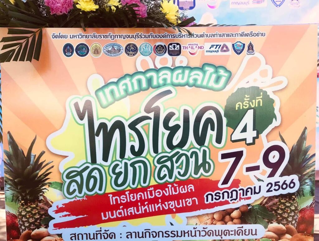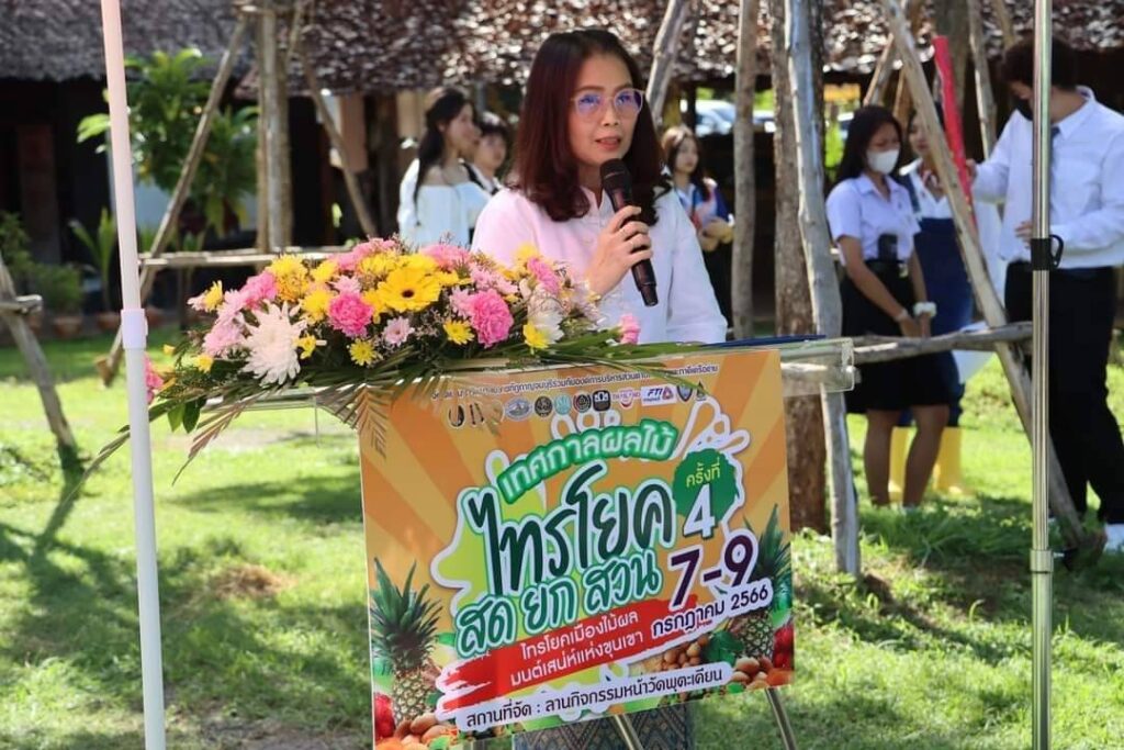วันที่ 8 กรกฏาคม2566 เวลา 09.00น.ที่ ลานกิจกรรมหน้าวัดพุตะเคียน อำเภอไทรโยค จังหวัดกาญจนบุรี นายอธิสรรค์ อินทร์ตรา รองผู้ว่าราชการจังหวัดกาญจนบุรี เป็นประธานเปิดงานฯ นายชัยเฉลิม นุชนุ่ม นายกองค์การบริหารส่วนตำบลท่าเสา กล่าวต้อนรับ พระครูกาญจนสูตรภรณ์ เจ้าคณะอำเภอไทรโยค พระครูสุทธิสารโสภิต รองเจ้าคณะอำเภอไทรโยค เจ้าอาวาสวัดพุตะเคียน พร้อมหัวหน้าส่วนราชการ ผู้บริหารและคณะครูมหาวิทยาลัยราชภัฏกาญจนบุรี องค์กรปกครองส่วนท้องถิ่น เกษตรกร และชุมชน เข้าร่วมงาน โดยมีผู้ช่วยศาสตราจารย์ ดร.ขวัญนรี กล้าปราบโจร รองอธิการบดีมหาวิทยาลัยราชภัฏกาญจนบุรี กล่าวรายงานถึงวัตถุประสงค์ของงาน “ไทรโยคเมืองไม้ผล มนต์เสน่ห์แห่งขุนเขา ” พร้อมด้วย ผศ.จรายุทธ ประทีปวรกาญจน์ รองอธิการบดีมหาวิทยาลัยราชภัฏฯ โดยความร่วมมือขององค์การบริหารส่วนตำบลท่าเสา และภาคีเครือข่ายต่างๆทั้งภาครัฐและเอกชน ภายใต้โครงการยุทธศาสตร์มหาวิทยาลัยราชภัฏเพื่อการพัฒนาท้องถิ่น