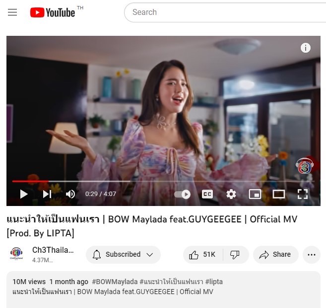 แตะ10 ล้านวิว ปัง! ปัง! กันเลยทีเดียว สำหรับซิงเกิล “แนะนำให้เป็นแฟนเรา” Bow Maylada Feat. GUYGEEGEE ผลงานเพลงของ “ต้าวโบว์ เมลดา” ที่ตอนนี้เป็นปลื้มลืมเหนื่อย เพราะได้รับการตอบรับดีเกินคาด จากแฟนคลับแฟนเพลง รวมไปถึงเพื่อน ๆ พี่ ๆ ทั้งในและนอกวงการบันเทิง ที่ต่างชื่นชอบและให้การสนับสนุนจนกลายเป็นเพลงฮิตติดปากที่ยอดวิวกำลังไต่ระดับสูงขึ้นเรื่อย ๆ